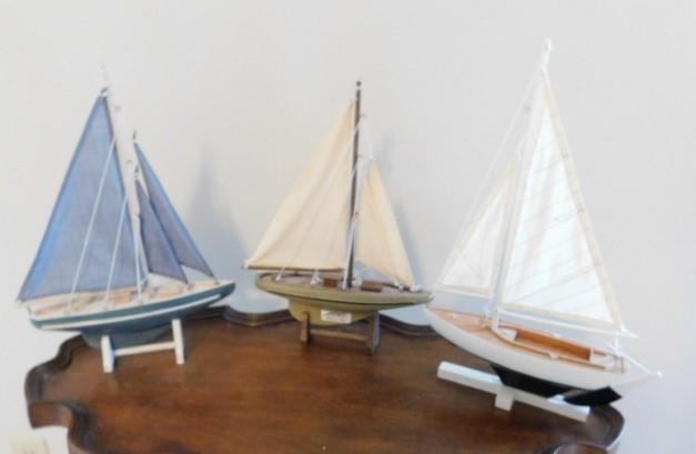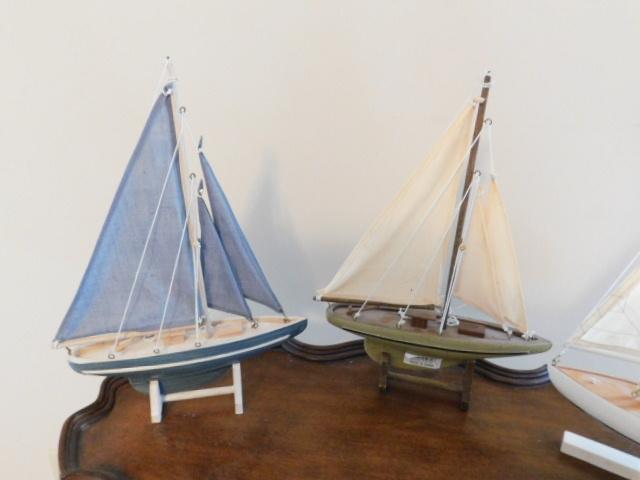 Set of Three Wood Sail Boat Models Various Shapes and Colors  14"x10"