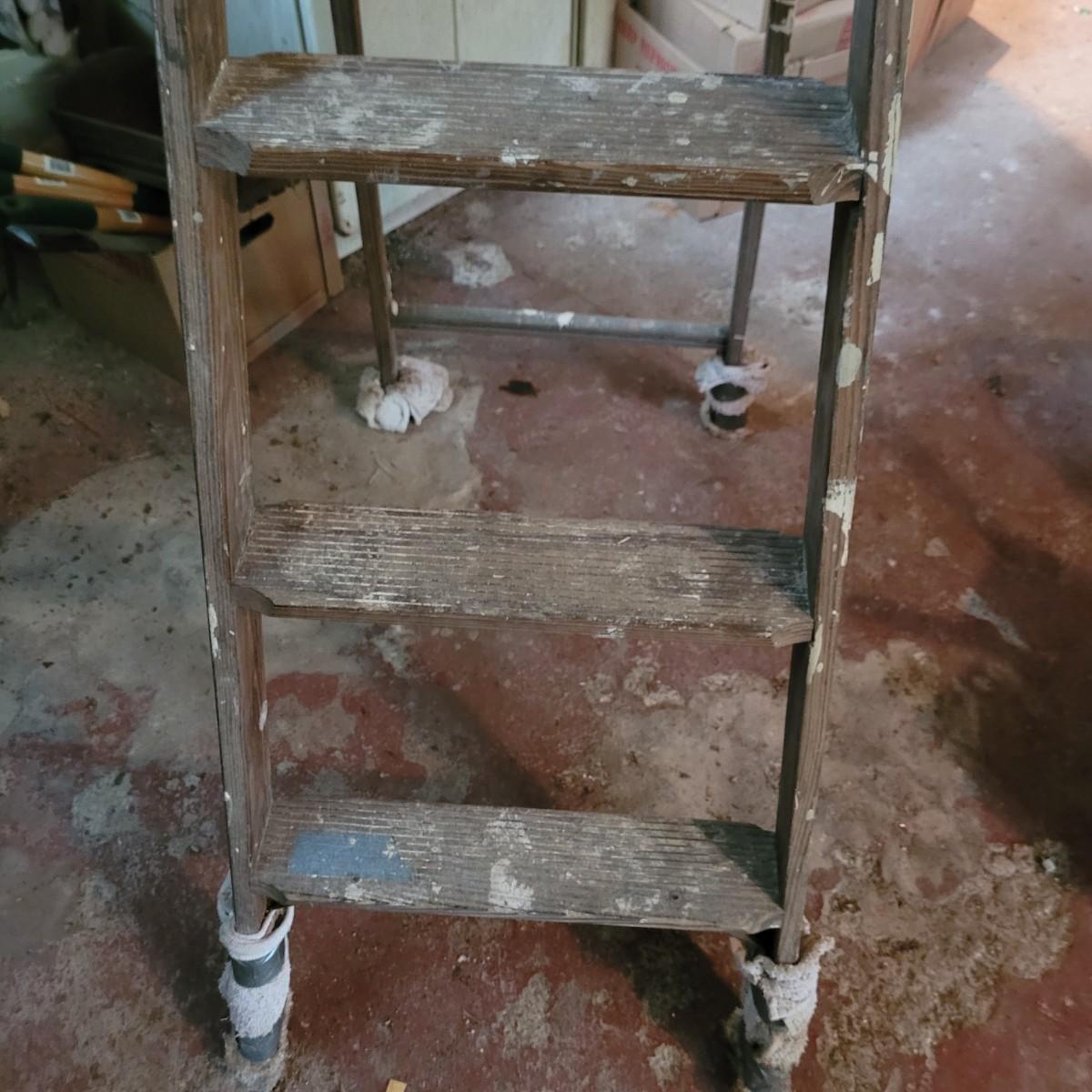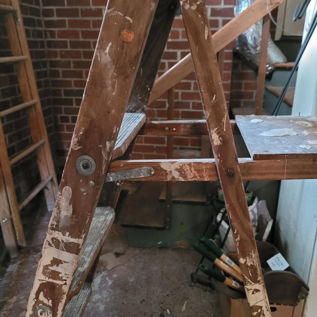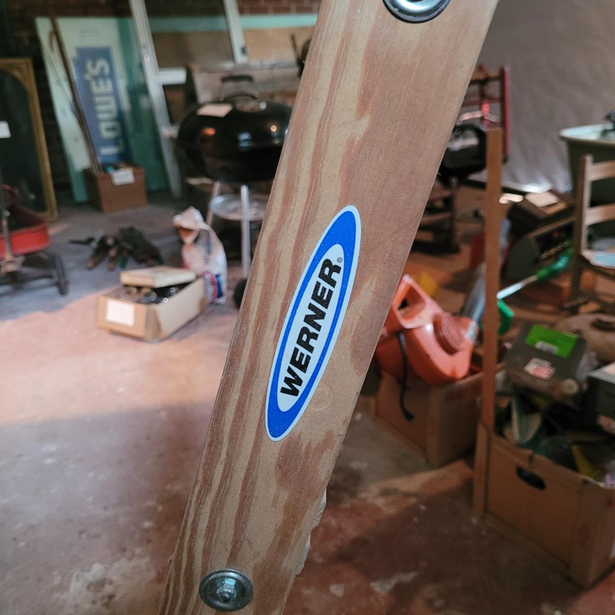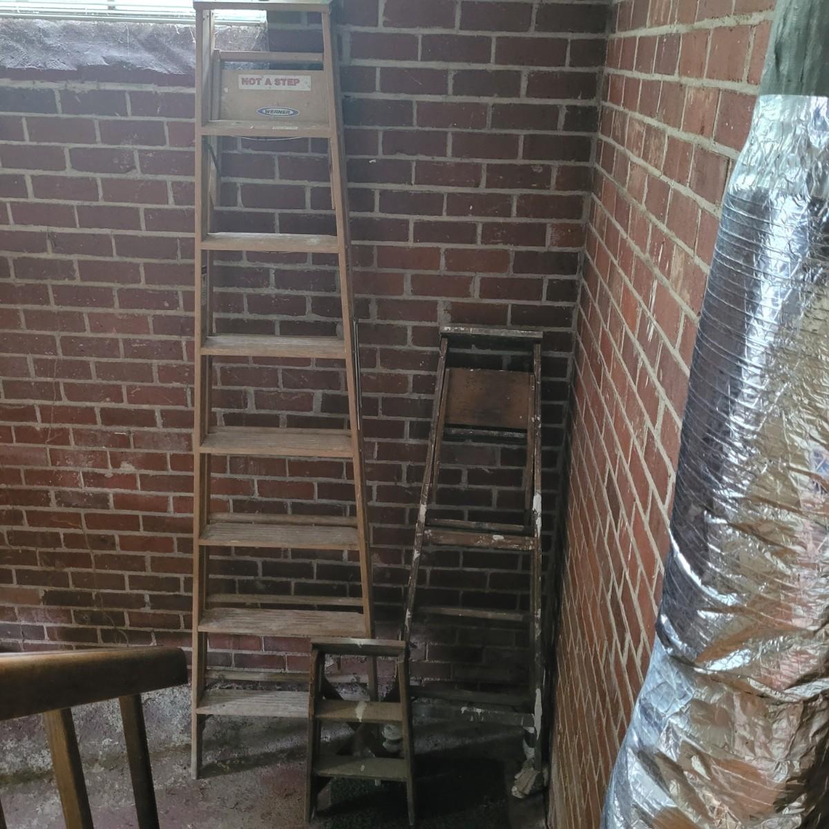 Set of three wooden step ladders, various heights. Tall 8ft. ladder is made by Werner with a load capacity of 225 lbs. No rusting, wood is in good condition with no signs of deterioration. Closed it measures approximately 25.5"L x5"D x96"H and open it measures approximately 91"H, base 51.5"L. Medium ladder has slight rusting around washers but all fastenings appear to be tight and in good condition. Closed it measures approximately 21"L x 5.5"D x60.5" and open it measures approximately 57"H, base 36.5"L. Small ladder slightly wobbles and has damage to wood on front and back. Significant rusting of hardware and fastenings are loose. Closed it measures approximately 13.5"L x5.5"D x24"H and open it measures approximately 20.5"H, base 24"L. Local pickup only.