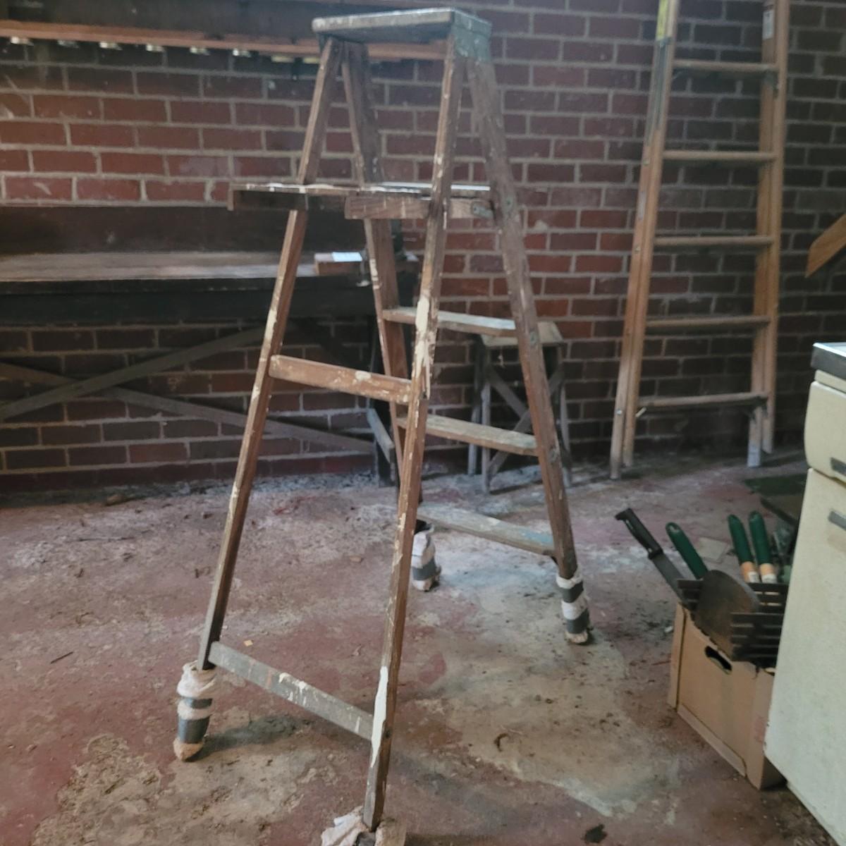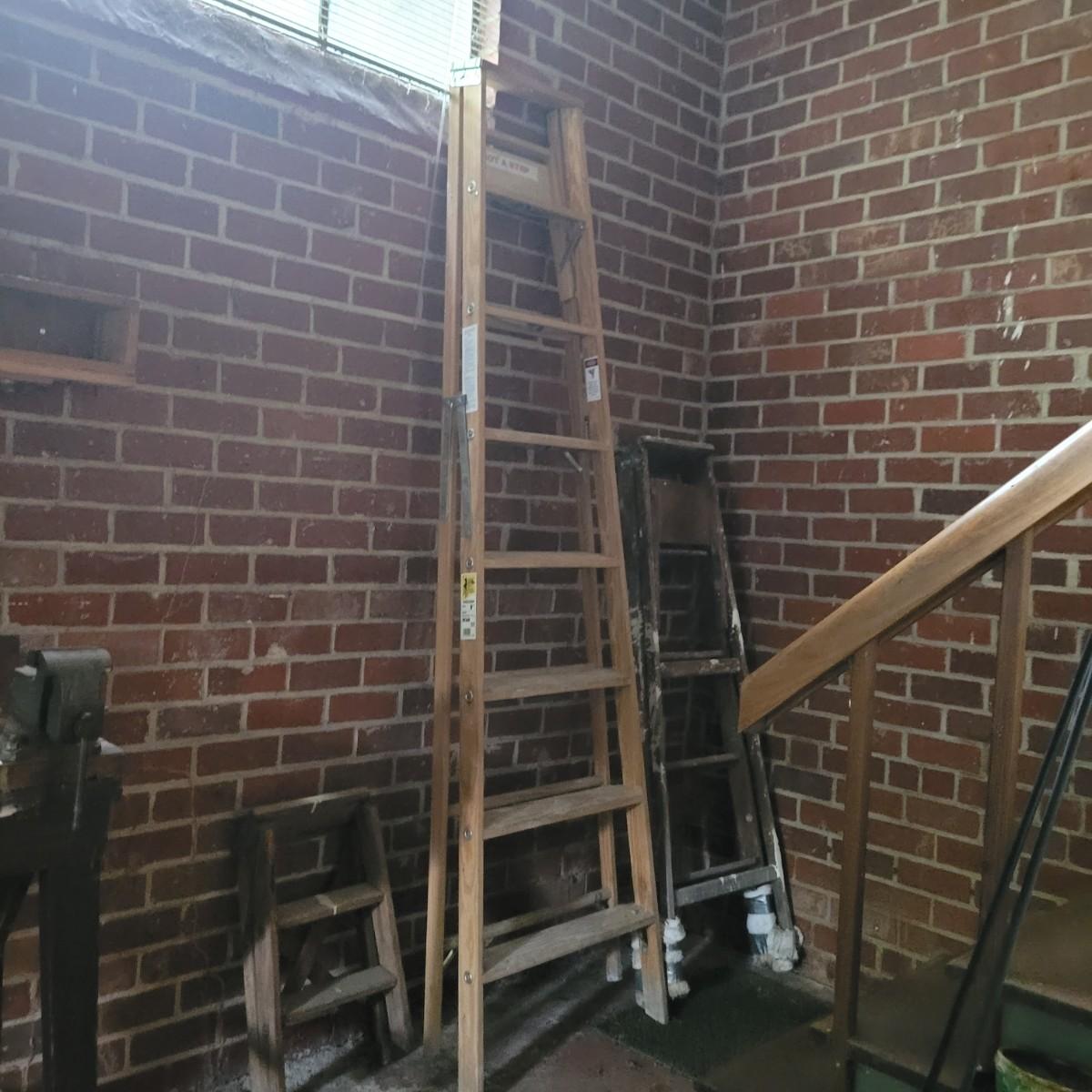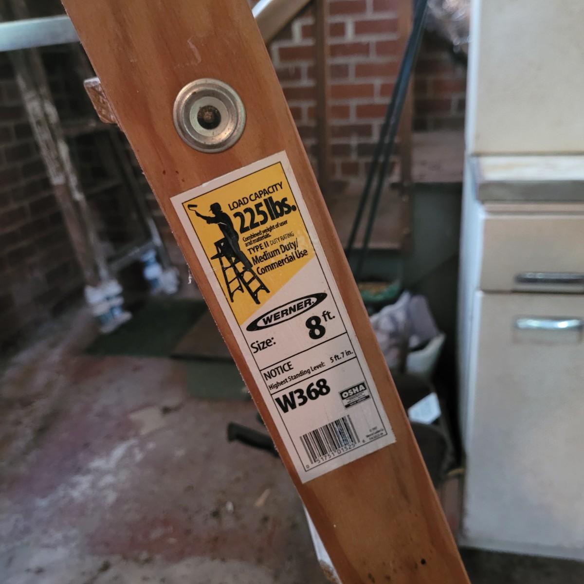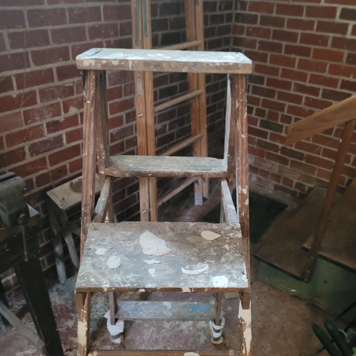 Set of three wooden step ladders, various heights. Tall 8ft. ladder is made by Werner with a load capacity of 225 lbs. No rusting, wood is in good condition with no signs of deterioration. Closed it measures approximately 25.5"L x5"D x96"H and open it measures approximately 91"H, base 51.5"L. Medium ladder has slight rusting around washers but all fastenings appear to be tight and in good condition. Closed it measures approximately 21"L x 5.5"D x60.5" and open it measures approximately 57"H, base 36.5"L. Small ladder slightly wobbles and has damage to wood on front and back. Significant rusting of hardware and fastenings are loose. Closed it measures approximately 13.5"L x5.5"D x24"H and open it measures approximately 20.5"H, base 24"L. Local pickup only.