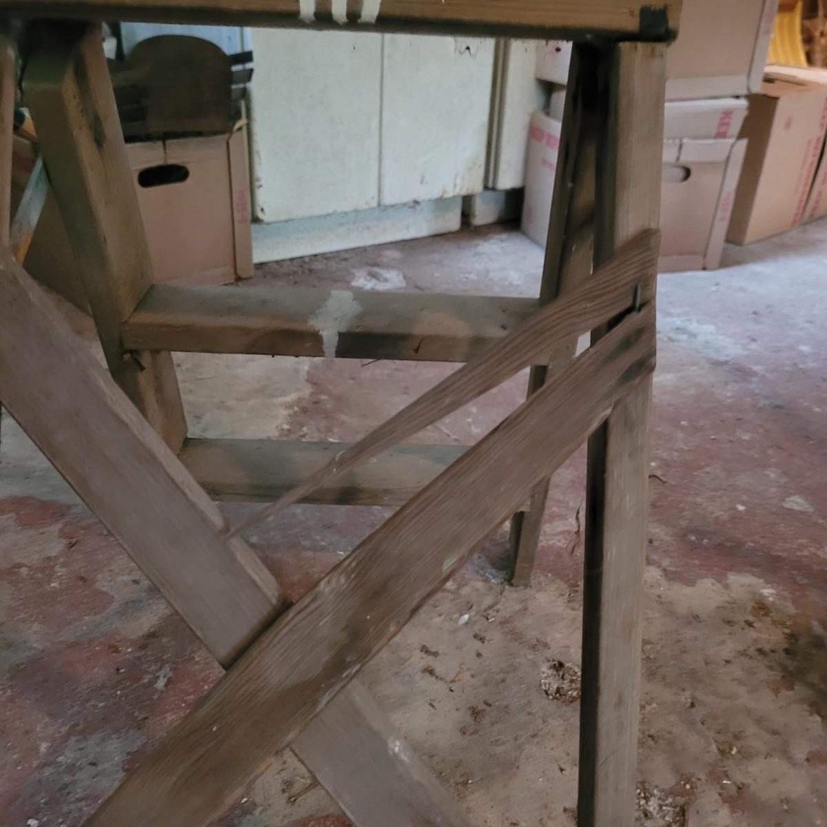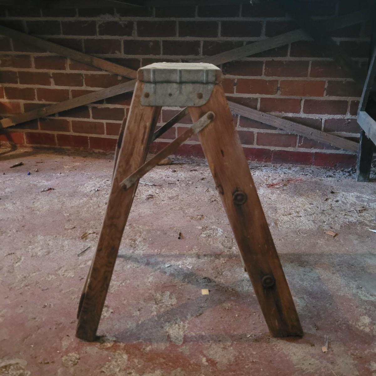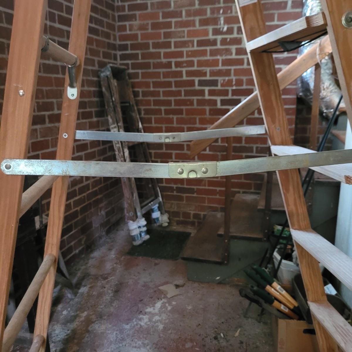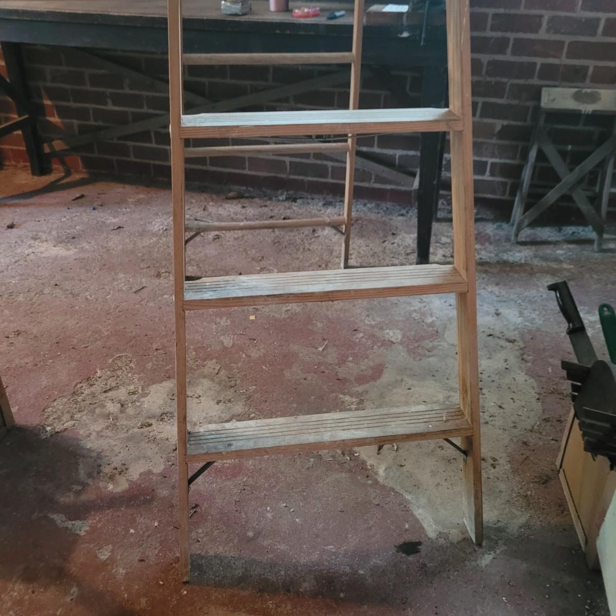 Set of three wooden step ladders, various heights. Tall 8ft. ladder is made by Werner with a load capacity of 225 lbs. No rusting, wood is in good condition with no signs of deterioration. Closed it measures approximately 25.5"L x5"D x96"H and open it measures approximately 91"H, base 51.5"L. Medium ladder has slight rusting around washers but all fastenings appear to be tight and in good condition. Closed it measures approximately 21"L x 5.5"D x60.5" and open it measures approximately 57"H, base 36.5"L. Small ladder slightly wobbles and has damage to wood on front and back. Significant rusting of hardware and fastenings are loose. Closed it measures approximately 13.5"L x5.5"D x24"H and open it measures approximately 20.5"H, base 24"L. Local pickup only.