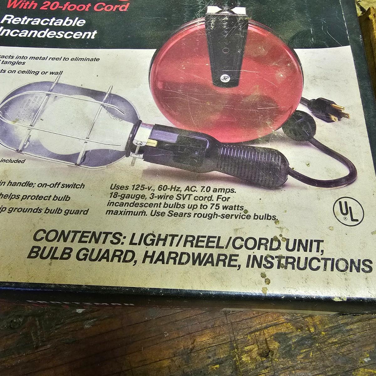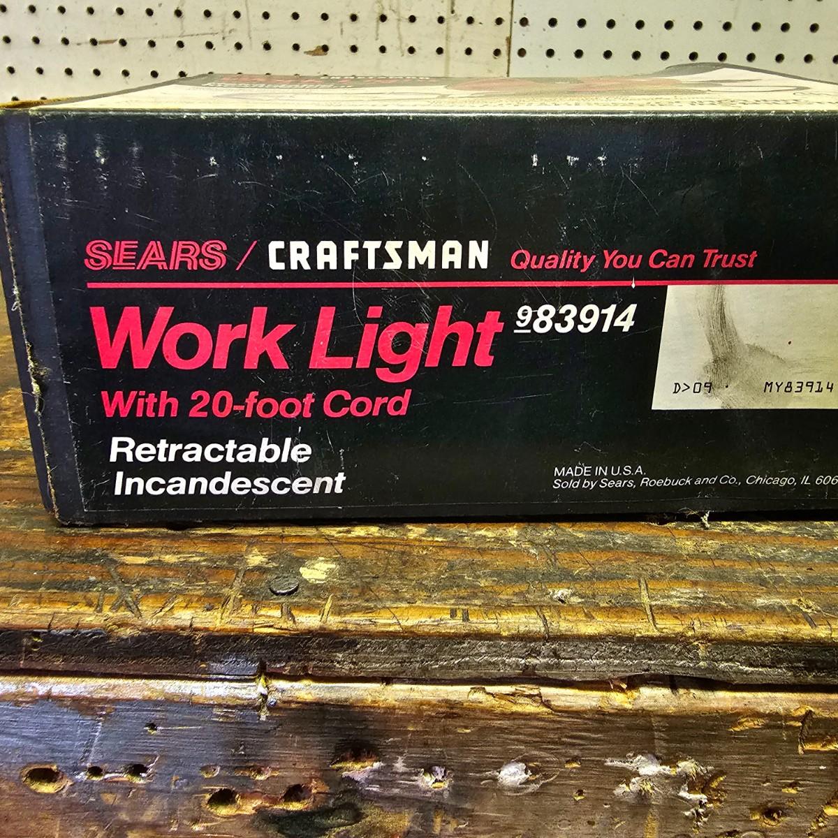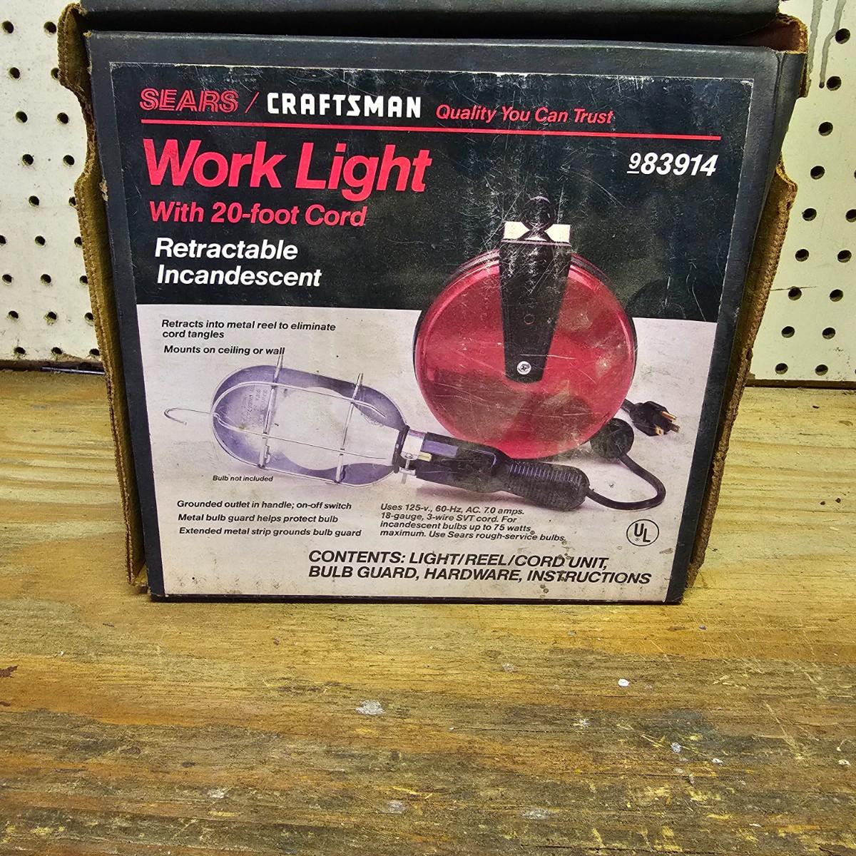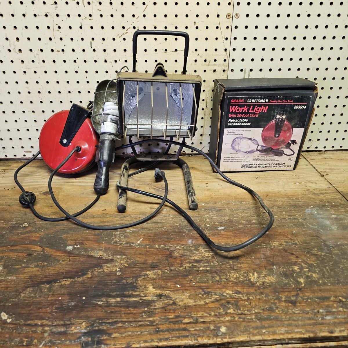 Two Sears Craftsman retractable lights with 20-foot cords. One used and one appears to be new in box, unassembled. The other light is a 500w halogen table top light with stand and handle. Both items not in box powered on when plugged in. See photos for details. Shipping available.