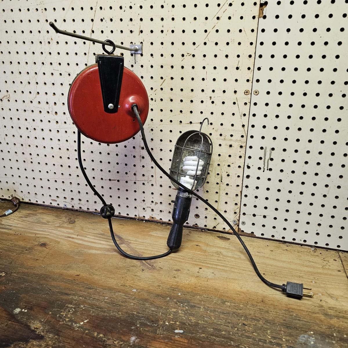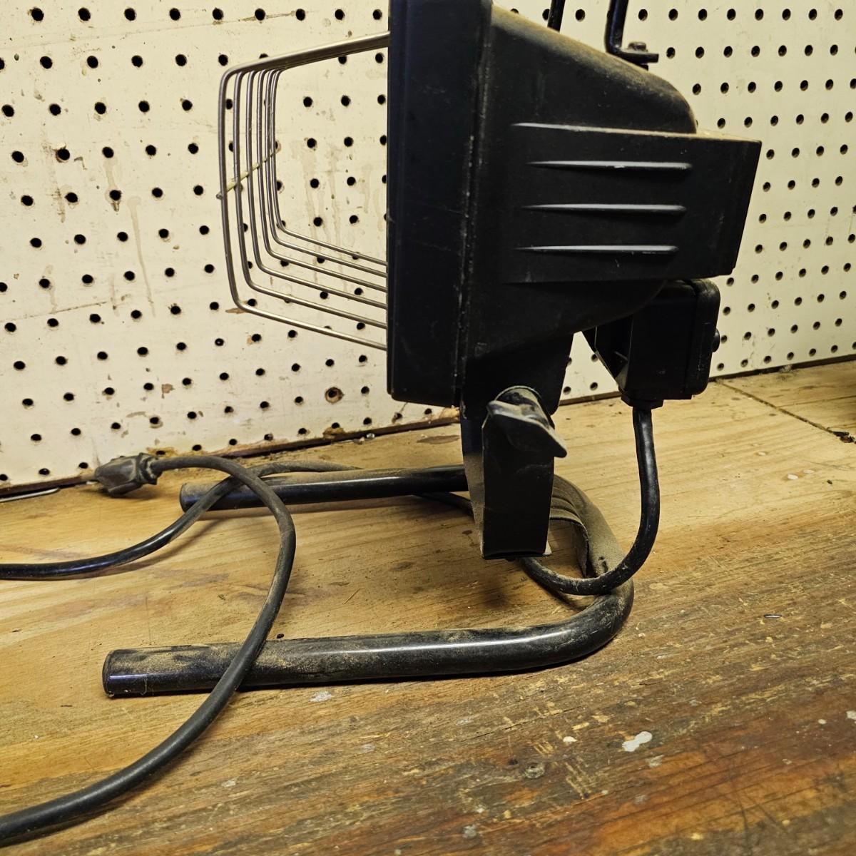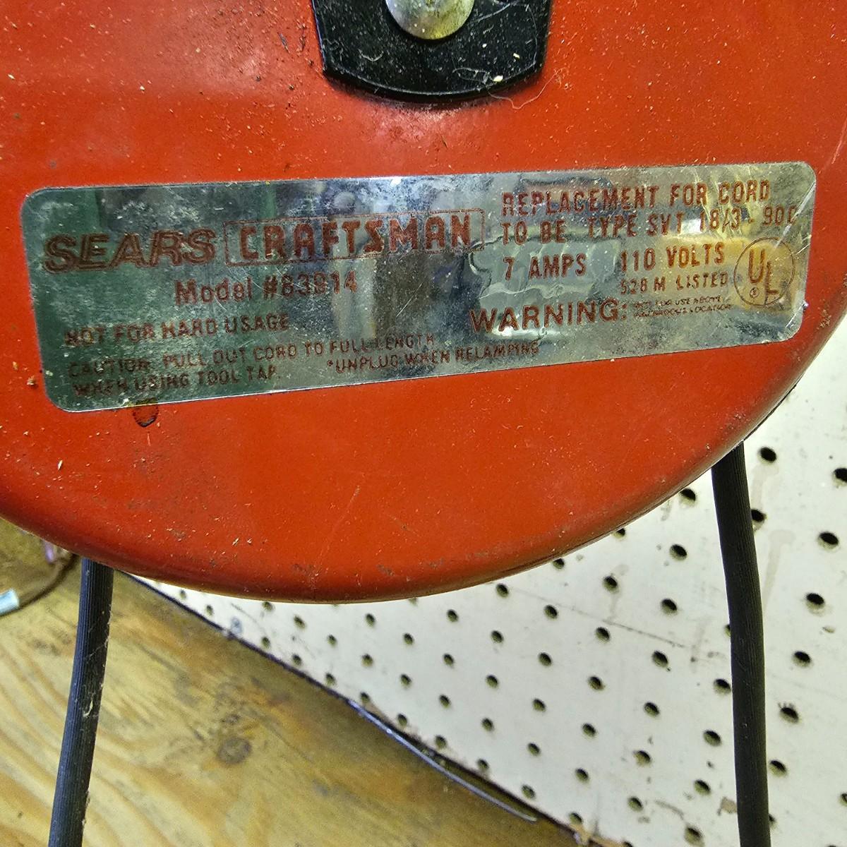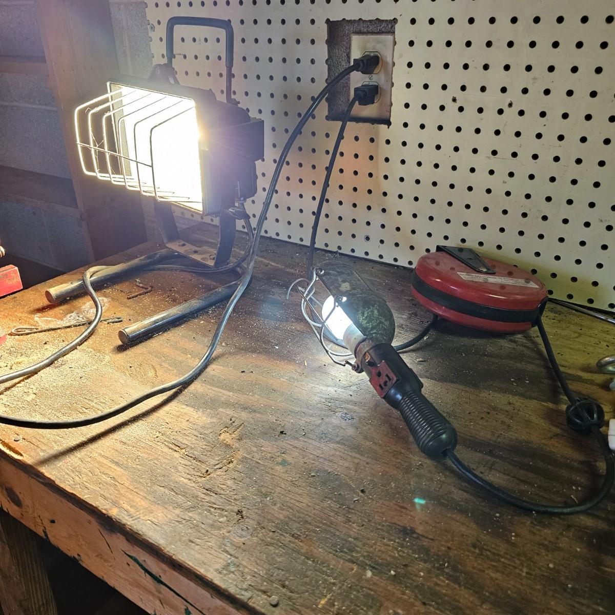 Two Sears Craftsman retractable lights with 20-foot cords. One used and one appears to be new in box, unassembled. The other light is a 500w halogen table top light with stand and handle. Both items not in box powered on when plugged in. See photos for details. Shipping available.