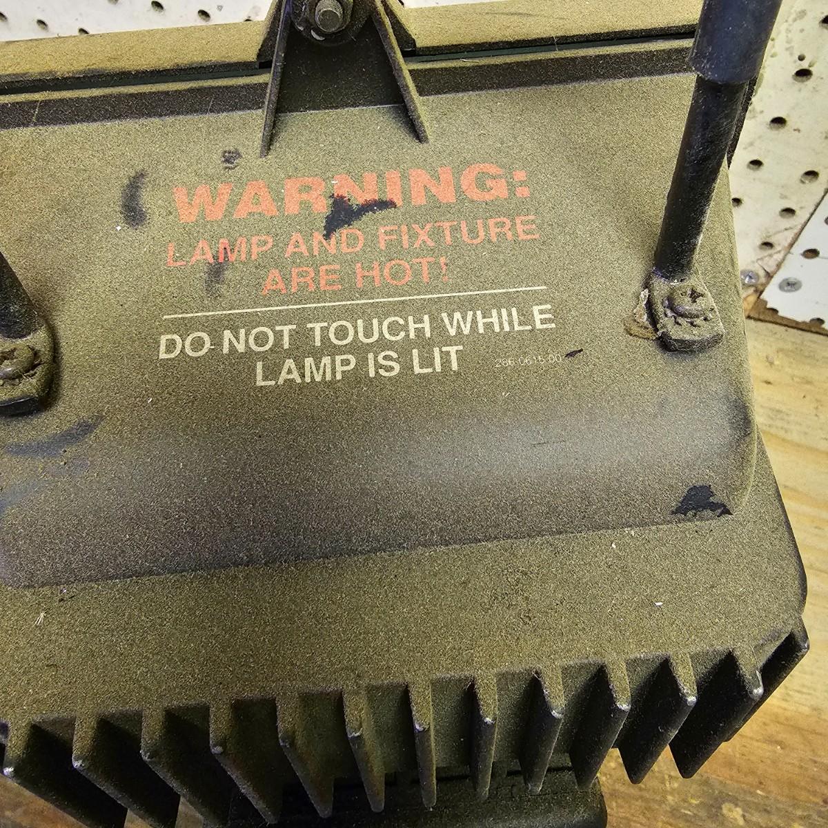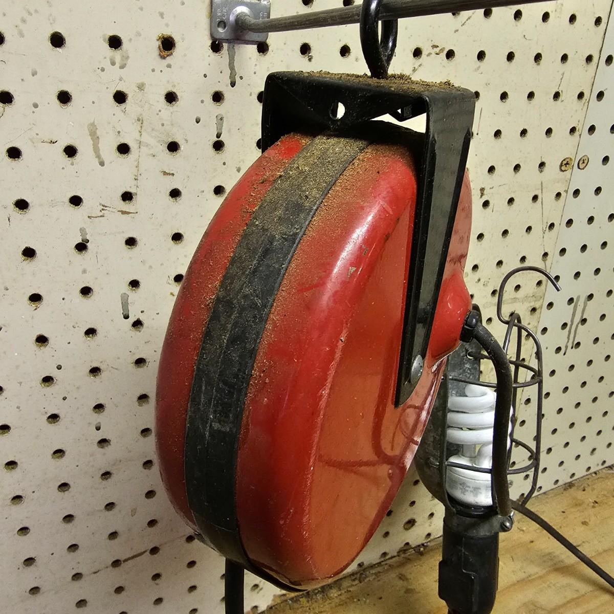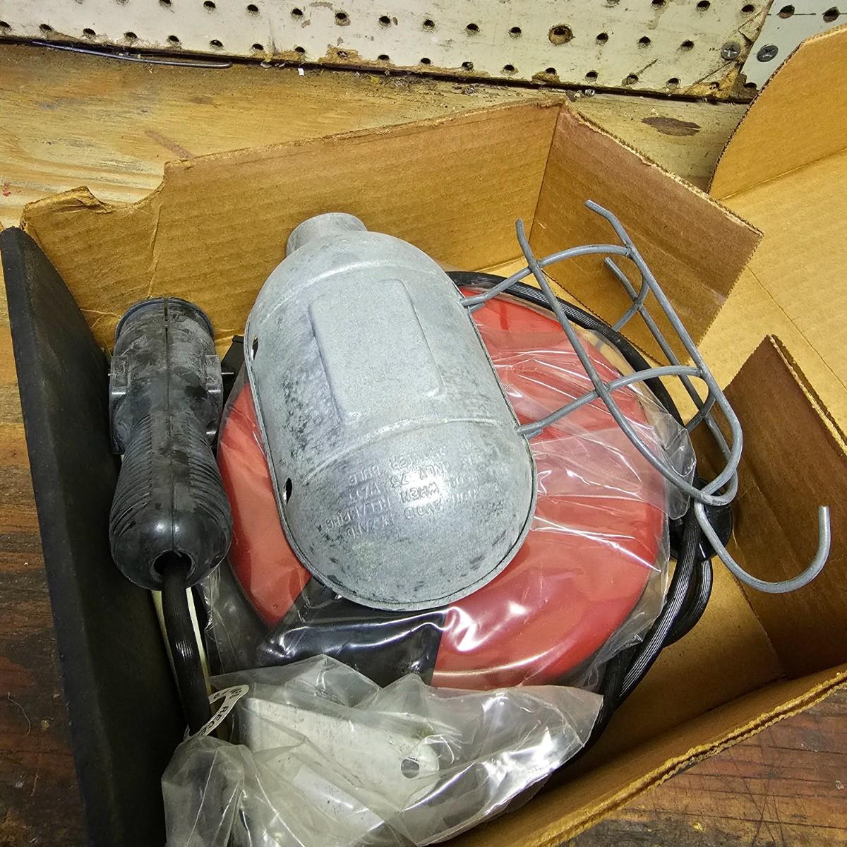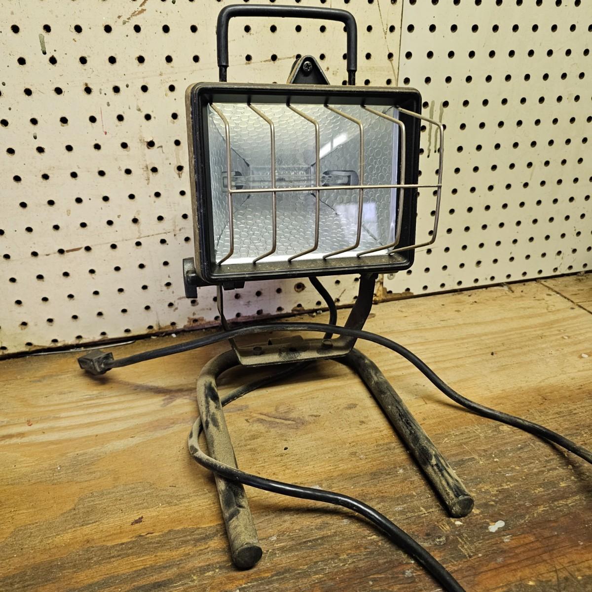 Two Sears Craftsman retractable lights with 20-foot cords. One used and one appears to be new in box, unassembled. The other light is a 500w halogen table top light with stand and handle. Both items not in box powered on when plugged in. See photos for details. Shipping available.