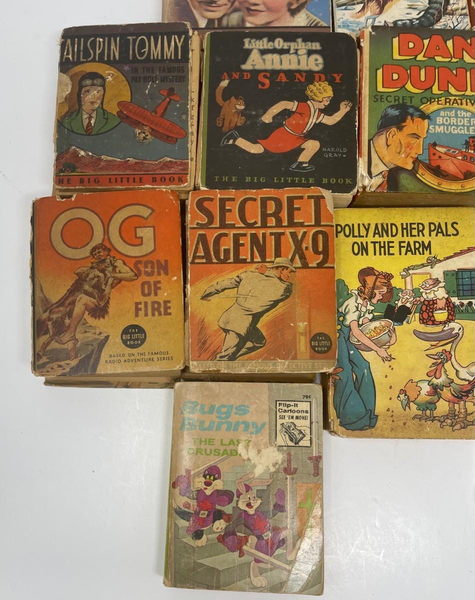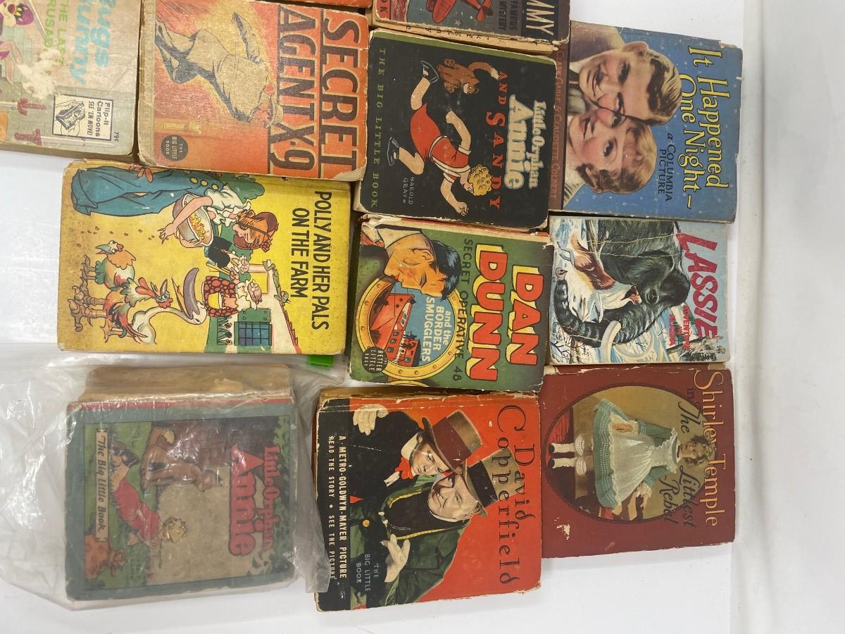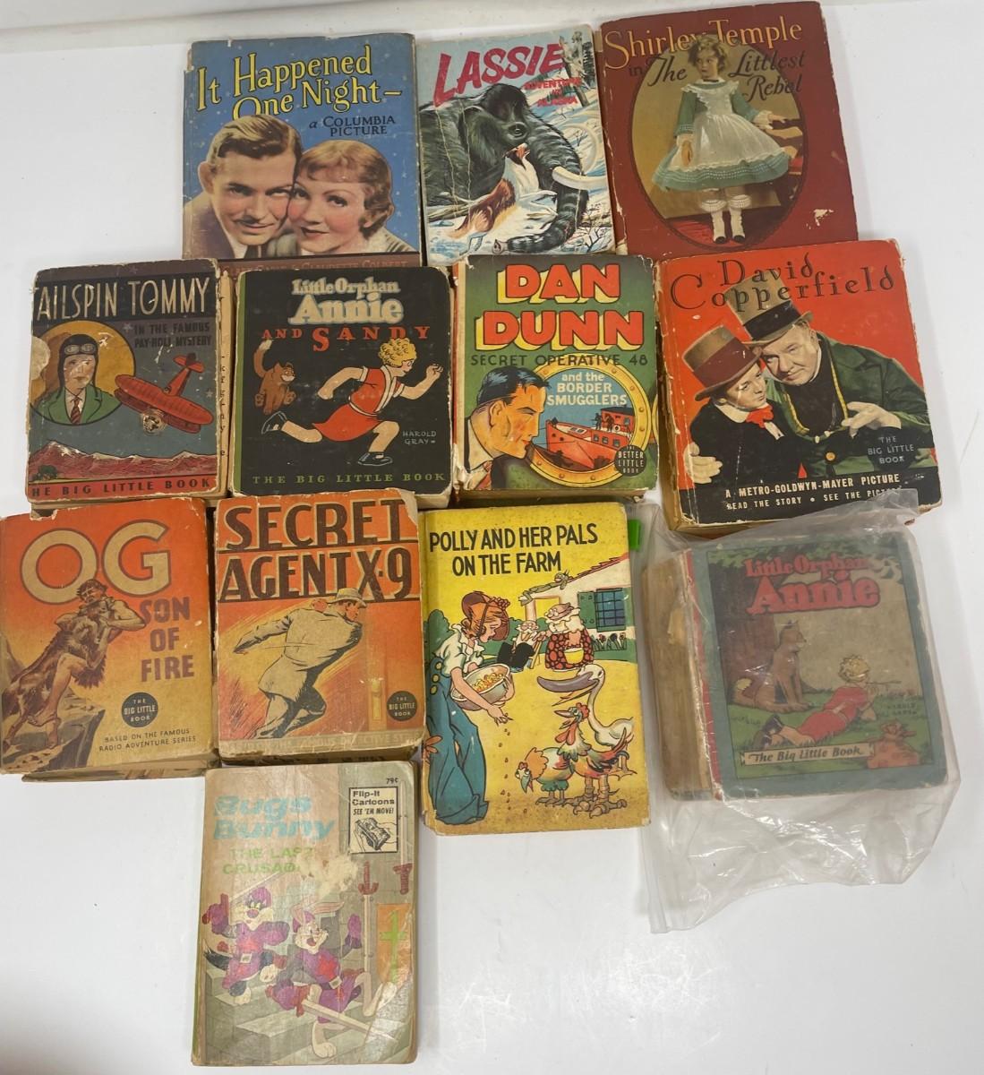 Description: Set of Twelve Vintage Comic Books - It Happed One Night, Lassie Adventure in Alaska, Shirley Temple in The Littlest Rebel, Tailspin Tommy, Little Orphan Annie and Sandy, Dan Dunn and the Border Smugglers, David Copperfield, OG Son of Fire, Secret Agent X-9, Polly and her Pals on the Farm, Little Orphan Annie The Big Little Book, Bugs Bunny The Last Crusade