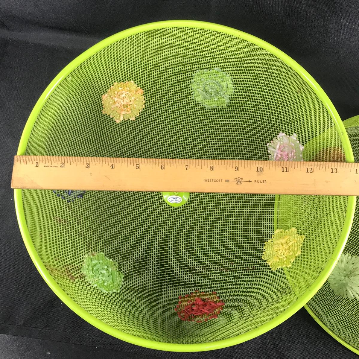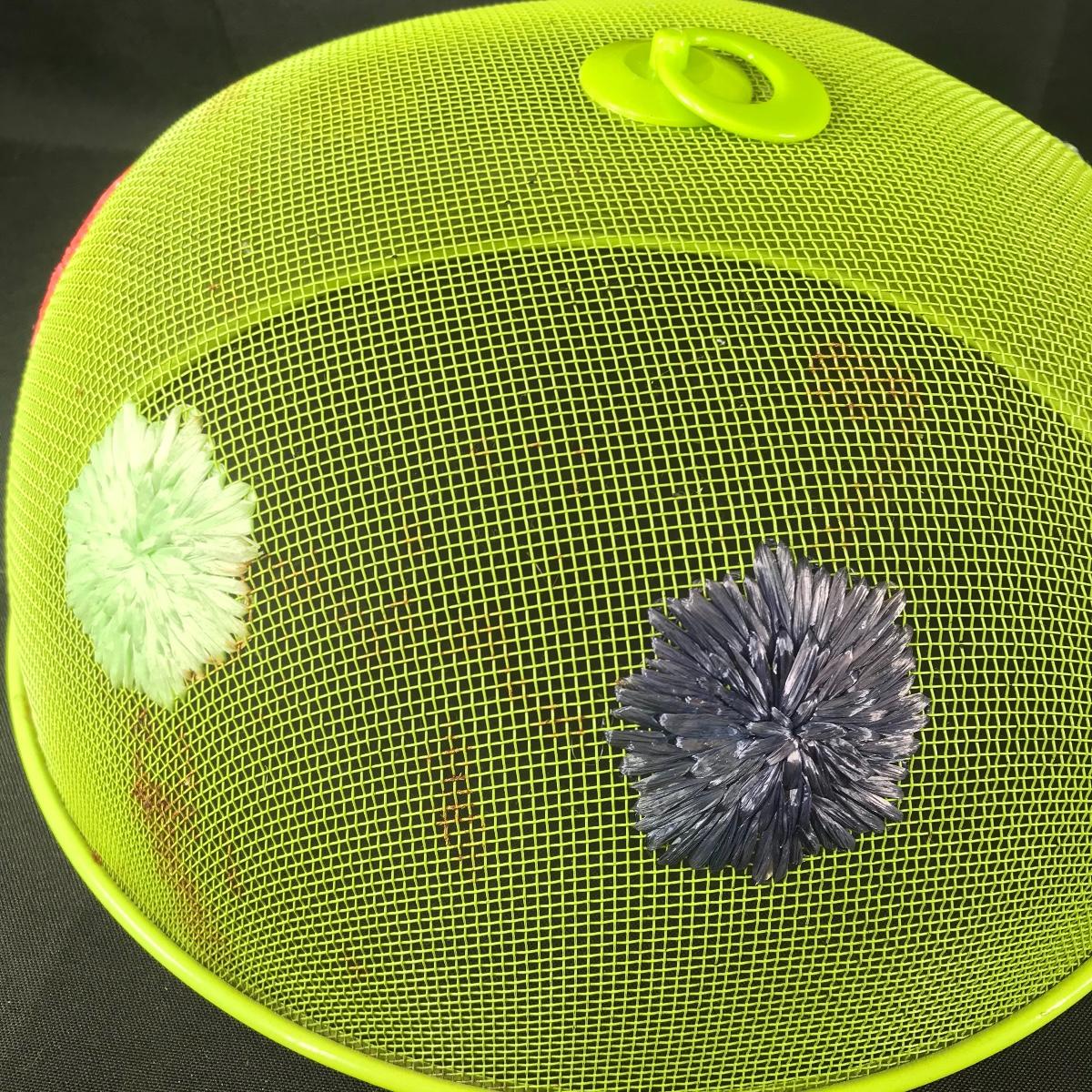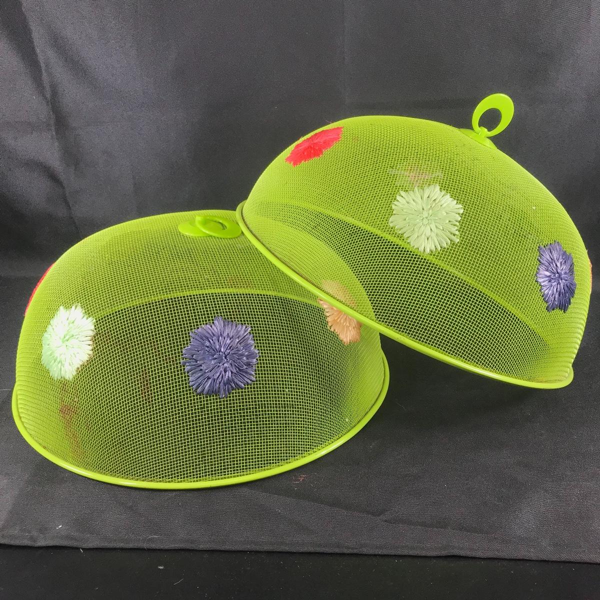 These cake covers are made of a metal wire-mesh material with plastic candles and straw flowers. Both of them have scuffs; see pictures.