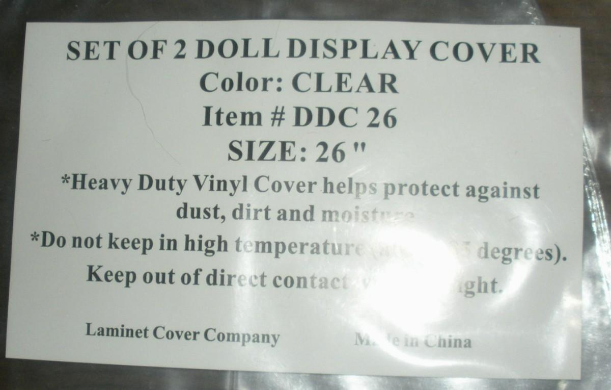 New set of 2 doll display covers. They are clear heavy-duty vinyl to help protect against dust, dirt and moisture. This set is 26" tall so any dolls up to 26" tall can be place under this cover. Simply open the cover and place over your doll. Make sure the entire cover is opened up. Not for use in high temperatures over 85 degrees. Also keep out of direct sunlight (which you should not display your dolls in anyway as you will fade them out).