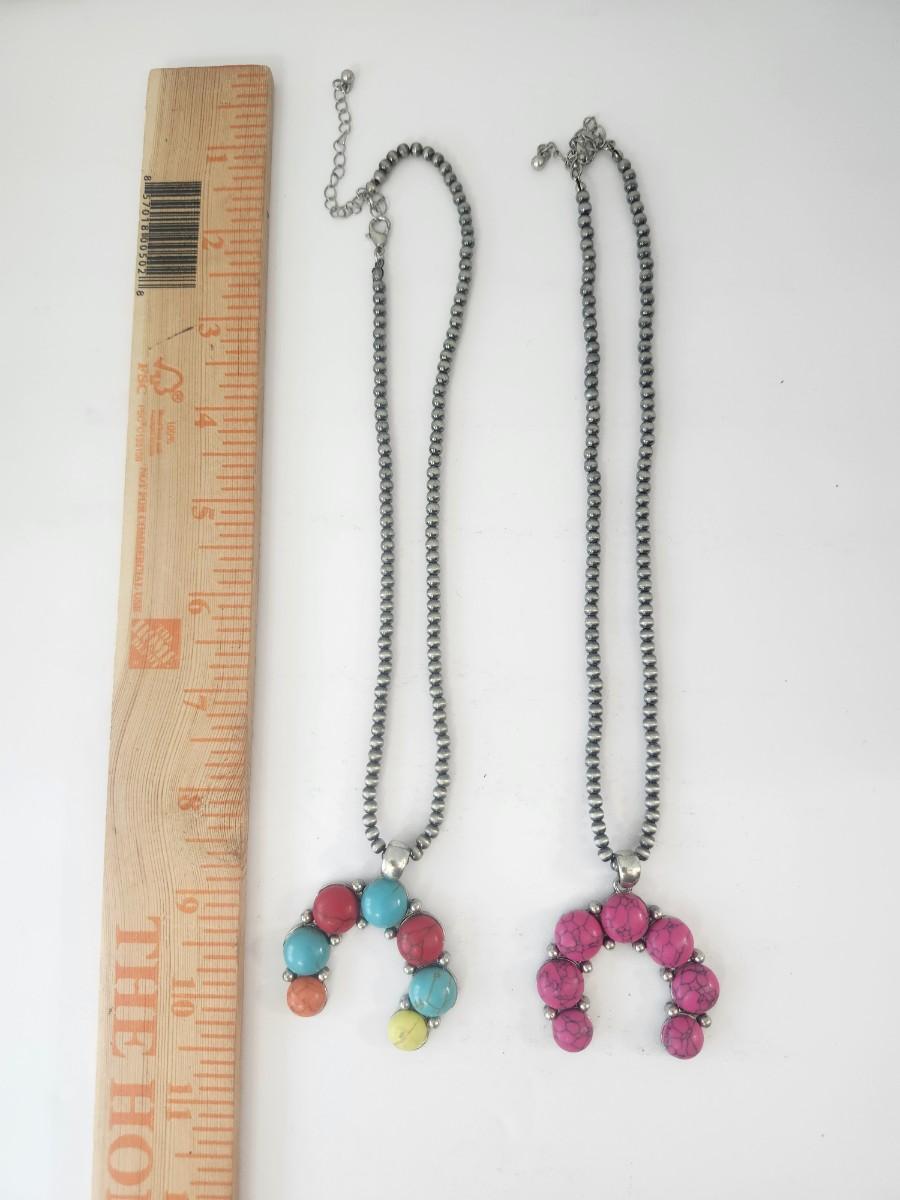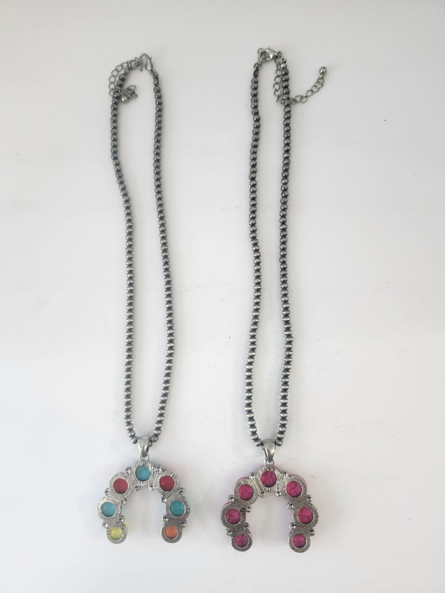 Set includes two matching style necklaces with silver tone beaded chains and horseshoe shaped pendants. One pendant features round beads in turquoise tone, red, yellow, and tan colors. The second pendant features round beads in a pink tone with marbled veining. Both necklaces have lobster clasp closures with extender chains. Colors, shapes, and construction described strictly from visible details only.