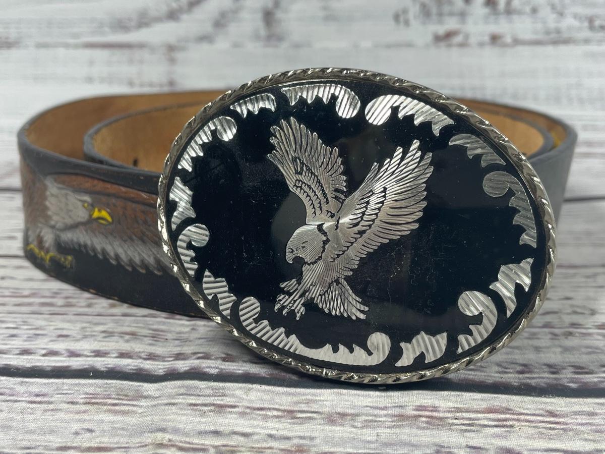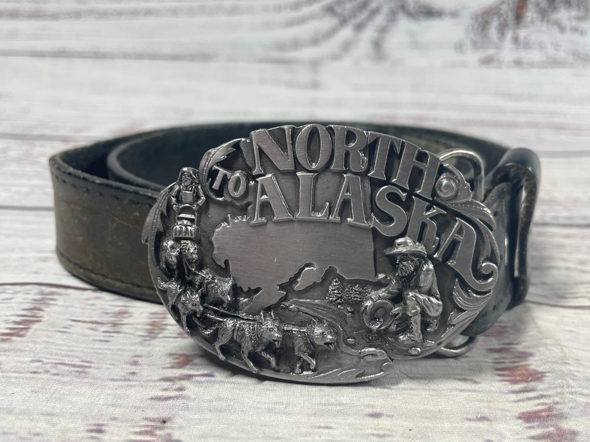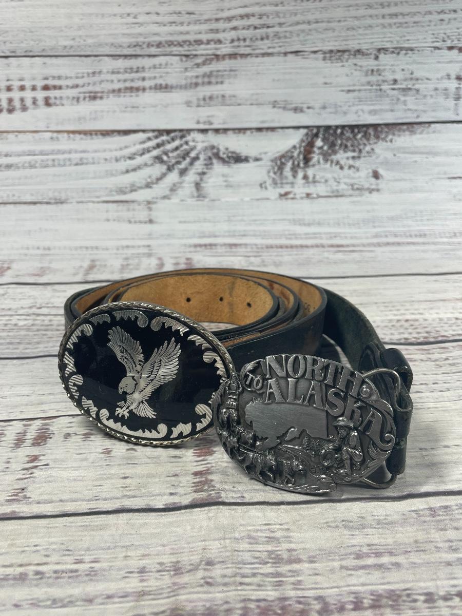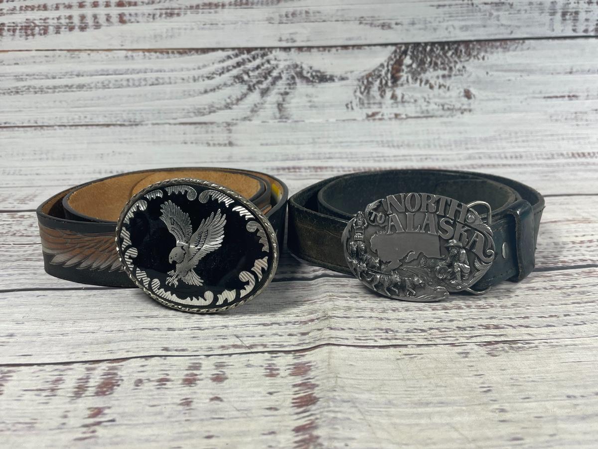 Pair of Vintage Belt Buckles with Belts Eagle North to Alaska