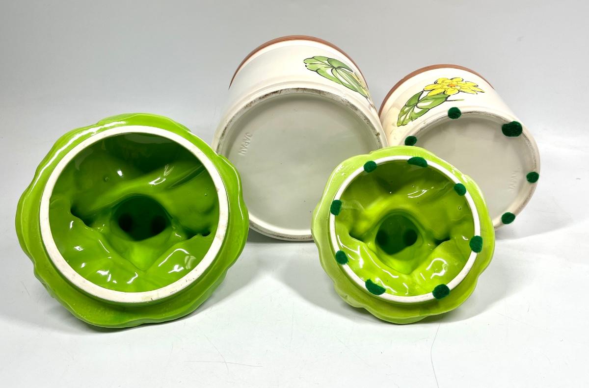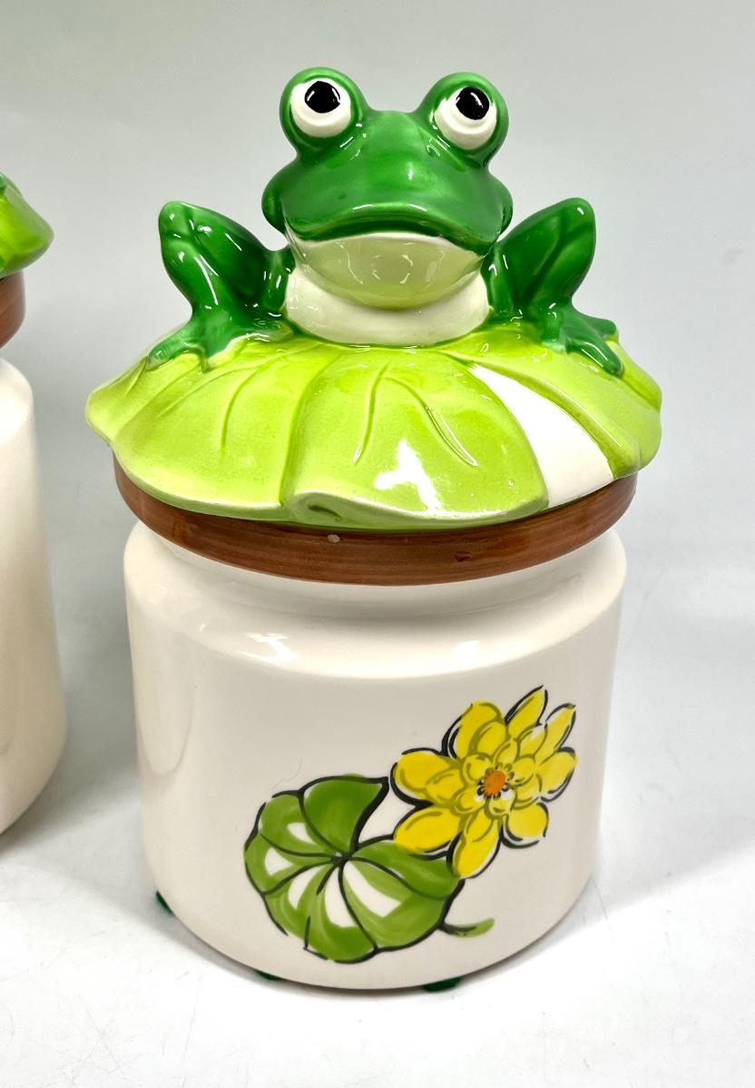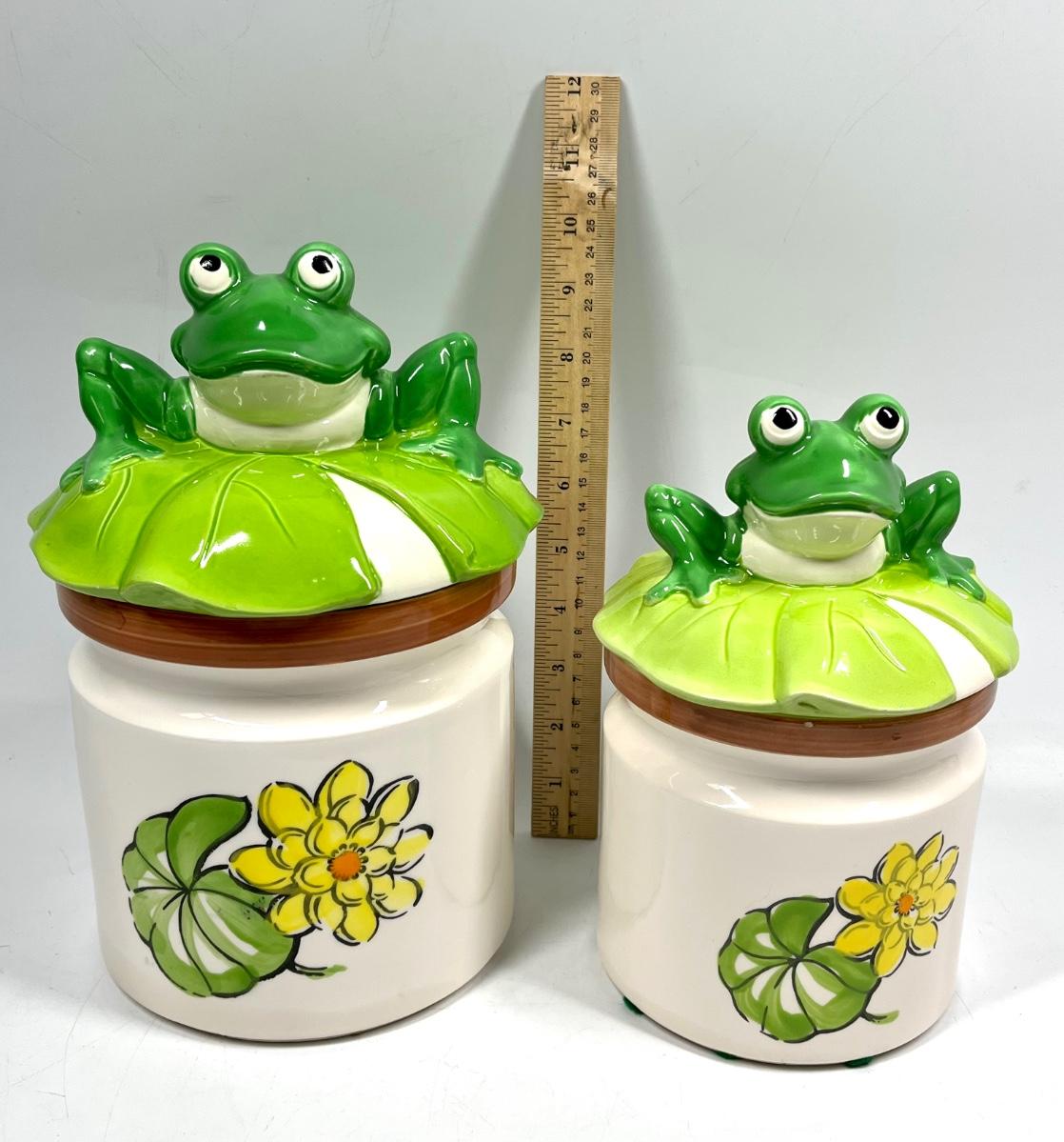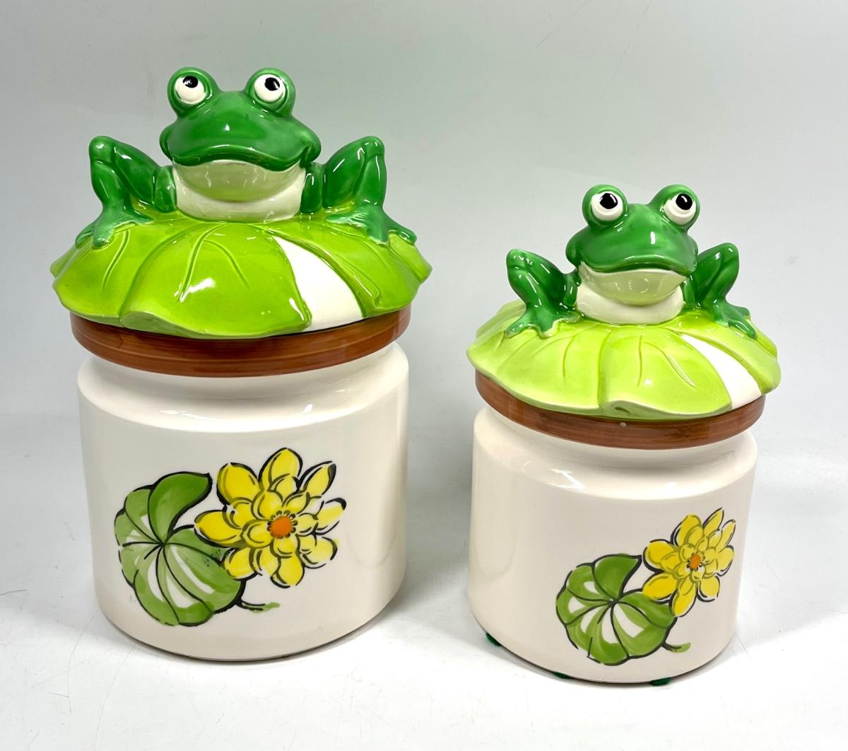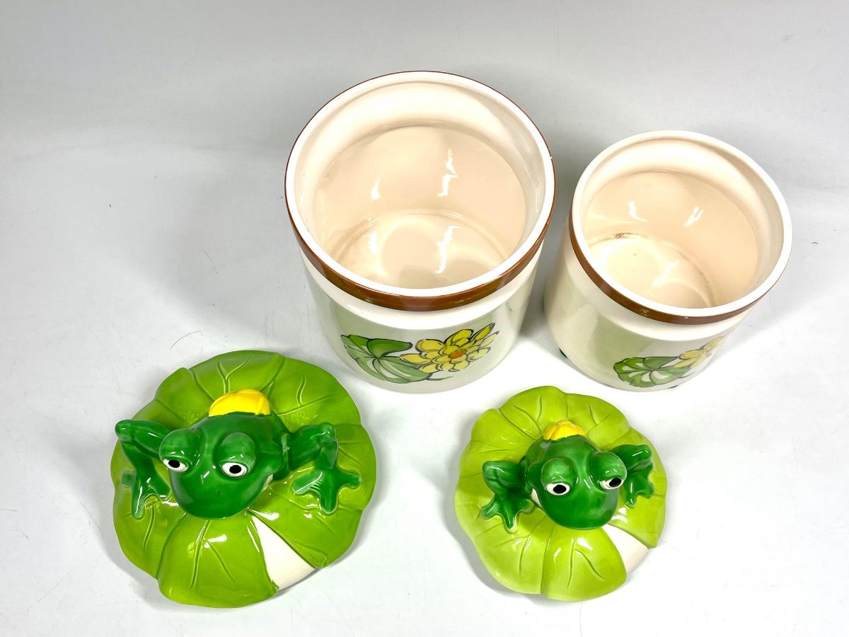Pair of Retro Ceramic Frog on Lilly Pad Lidded Canister Cookie Jars. In good vintage condition. Two sizes. Marked Japan on the bottom.