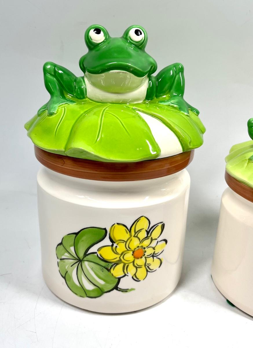 Pair of Retro Ceramic Frog on Lilly Pad Lidded Canister Cookie Jars