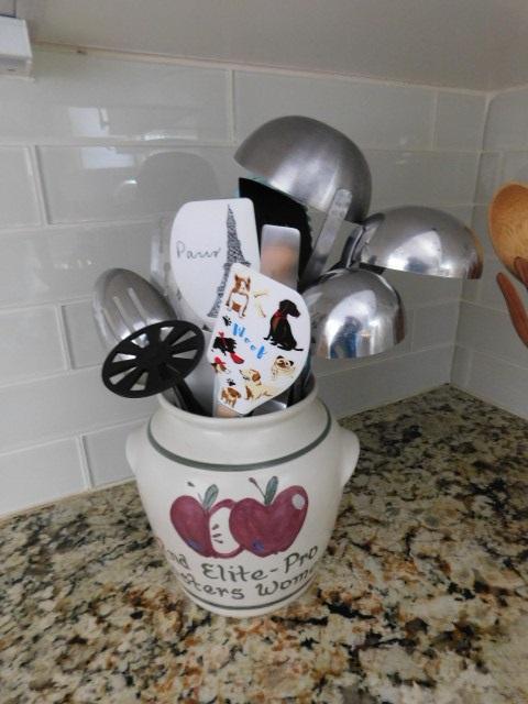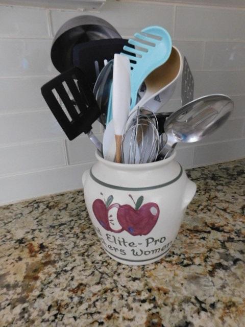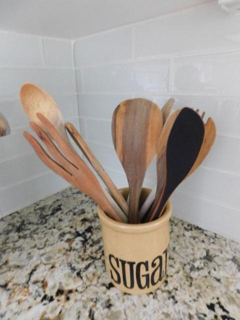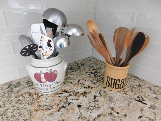 Set of Two Ceramic Crocks with Kitchen Utensils and Exotic Wood Spoons