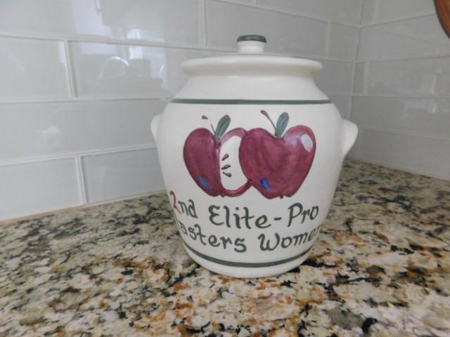 Set of Two Ceramic Crocks with Kitchen Utensils. White crock has lid and is a cookie jar.