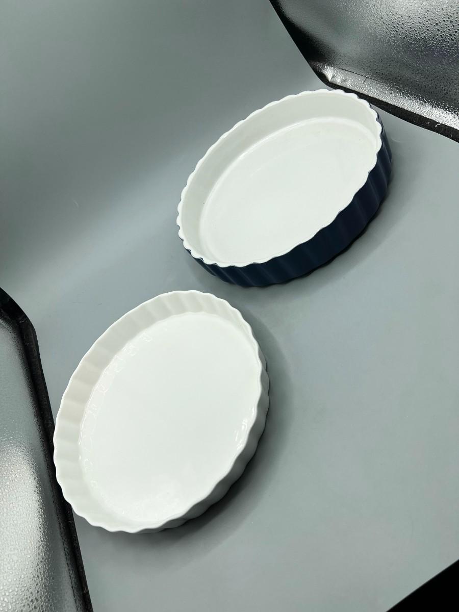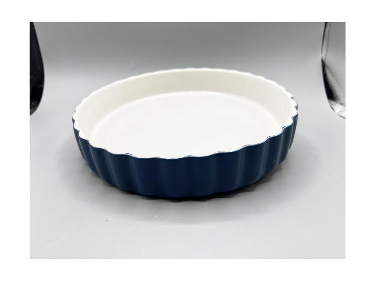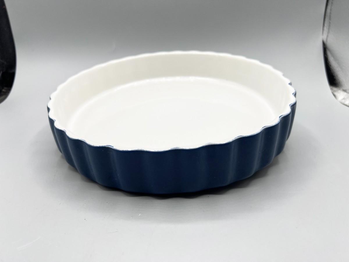 Set of 2 ceramic tart pans. One white one navy blue. Good condition. About 9" size.
