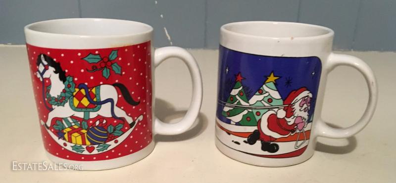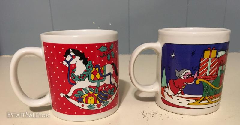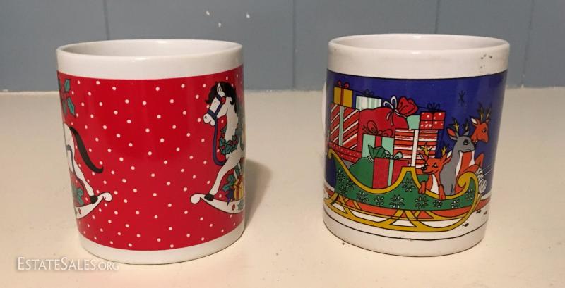This set includes one red mug with a rocking horse on both sides and a blue mug with Santa's sleigh all the way around. Mugs are in gently used. condition.