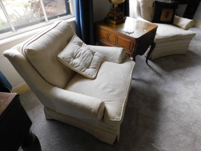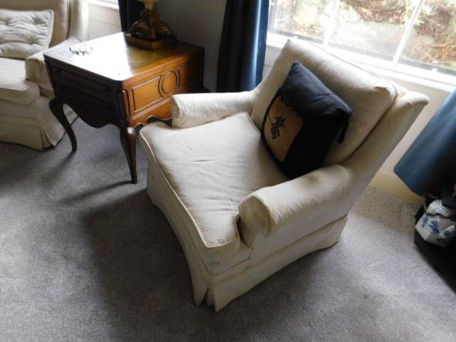 Set of Two Cushioned Chairs with Florentine Lamp and Queen Anne Side Table. Table has some surface scratches and wear. Lamp is chalk ware and has some open chalk areas. Chairs seem to be in good usable condition.