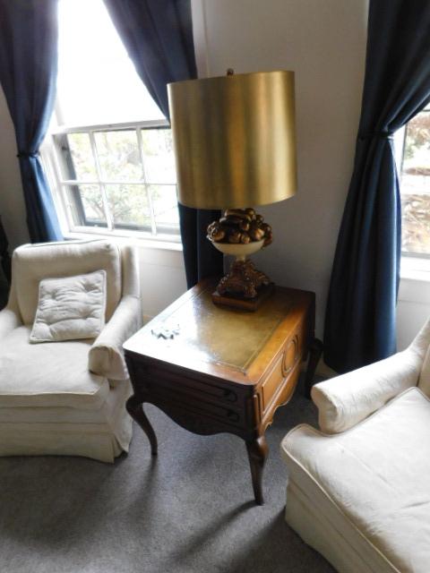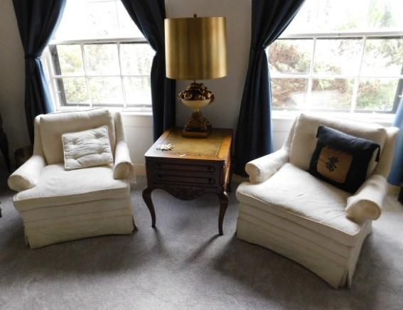 Set of Two Cushioned Chairs with Florentine Lamp and Queen Anne Side Table