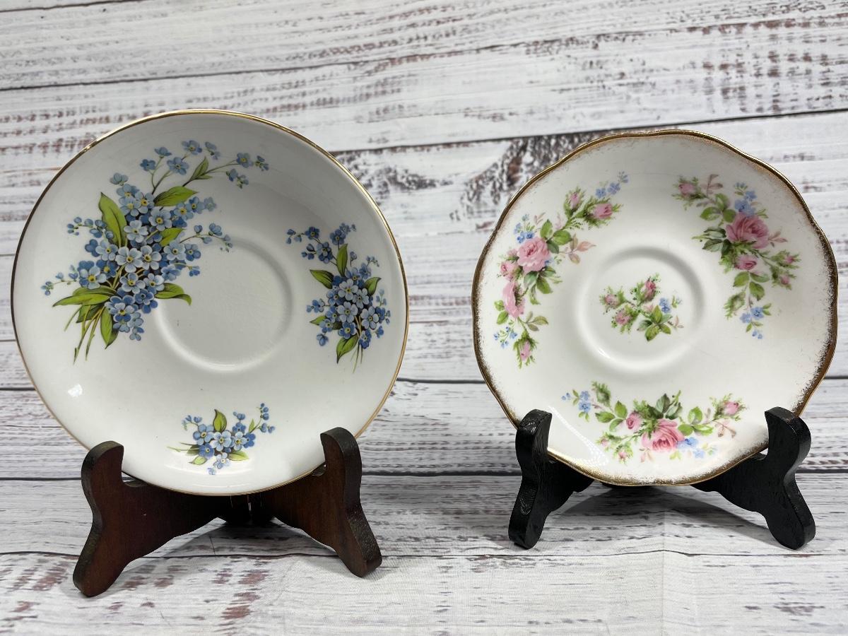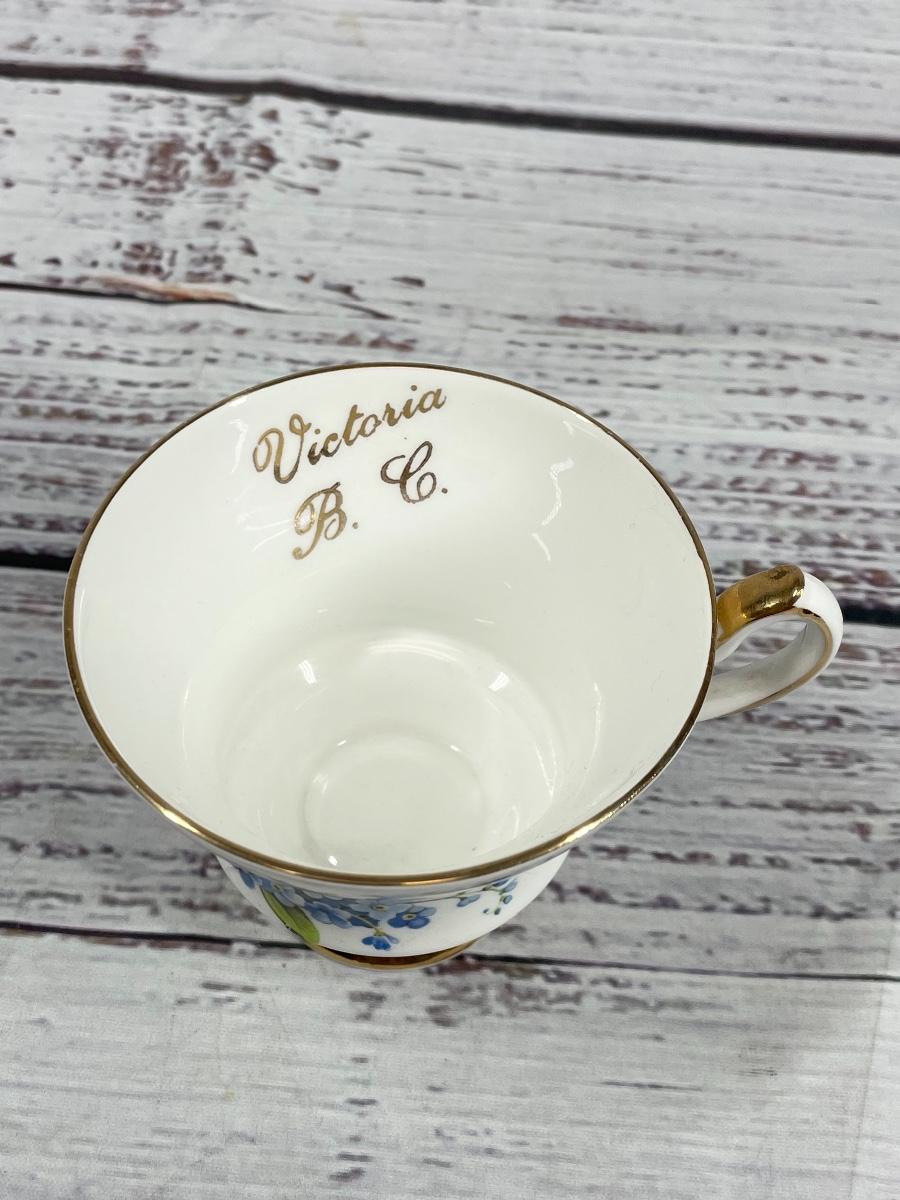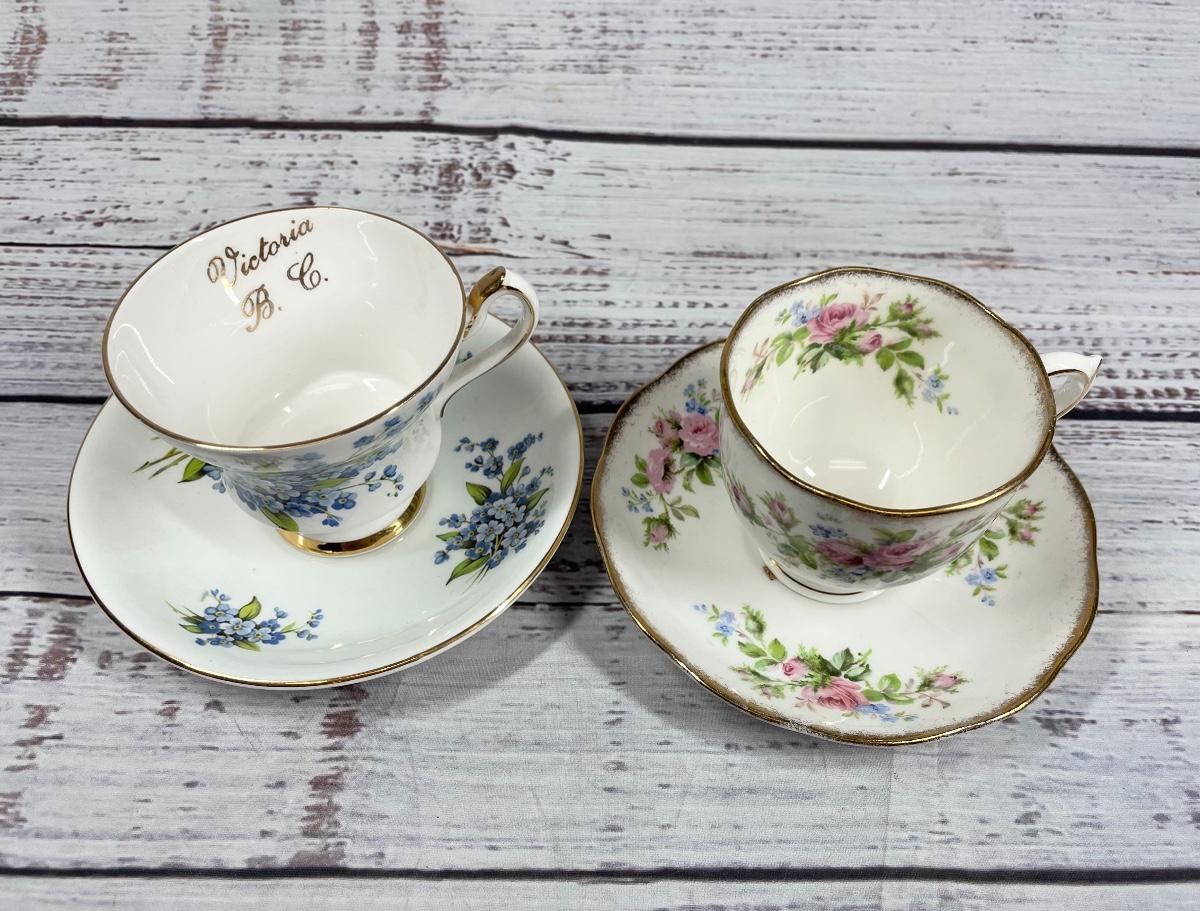 Both are in good condition. One of the tea cups and plate has crazing and slight discoloration. Both of these sets were made in England. One is a Victoria, British Colombia souvenir.
