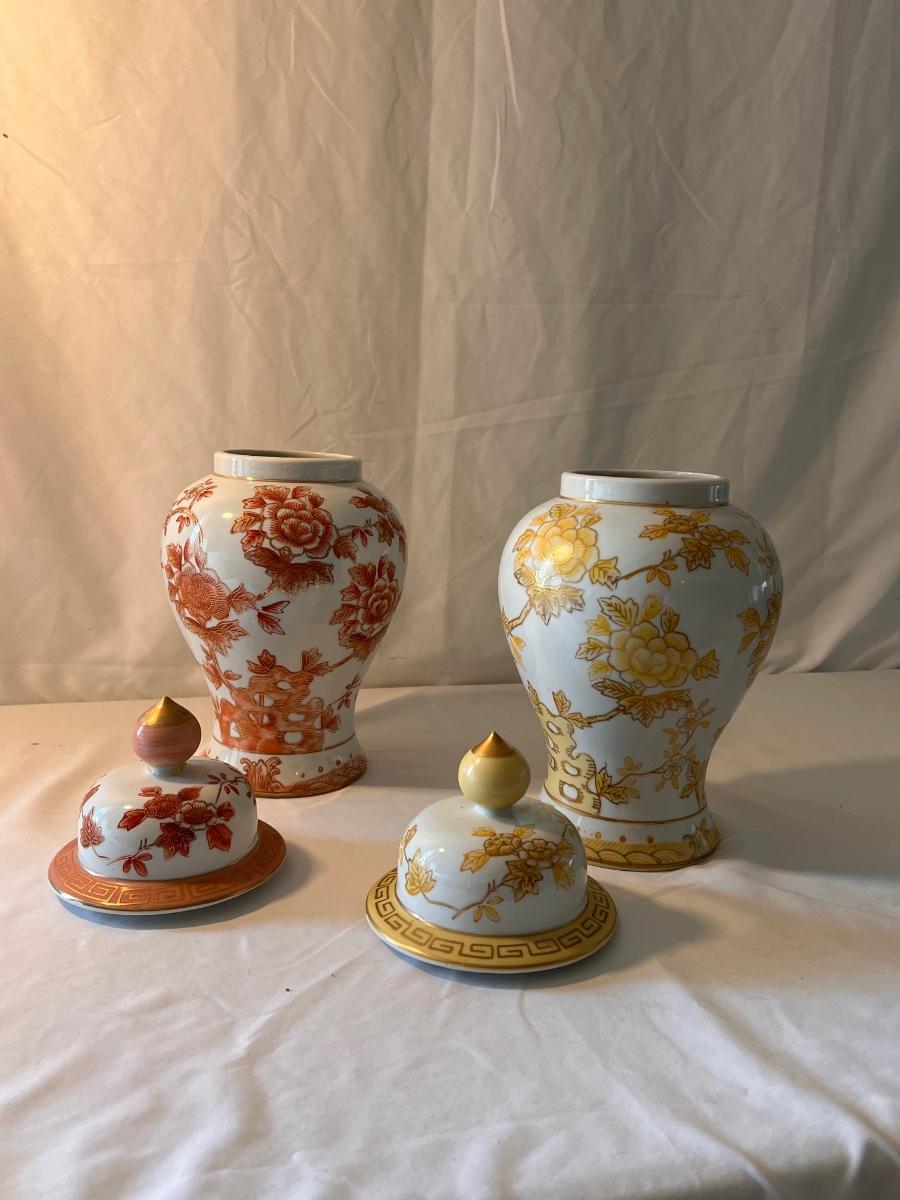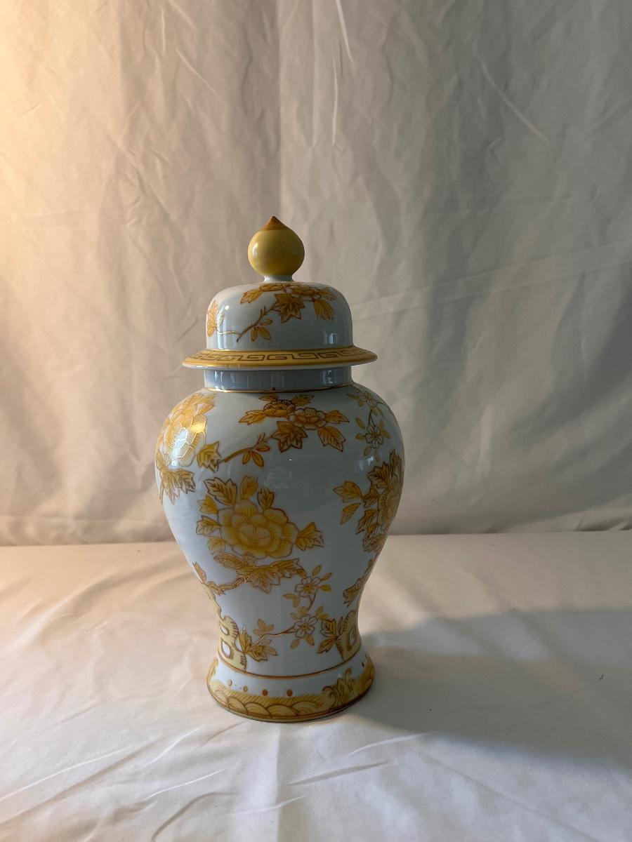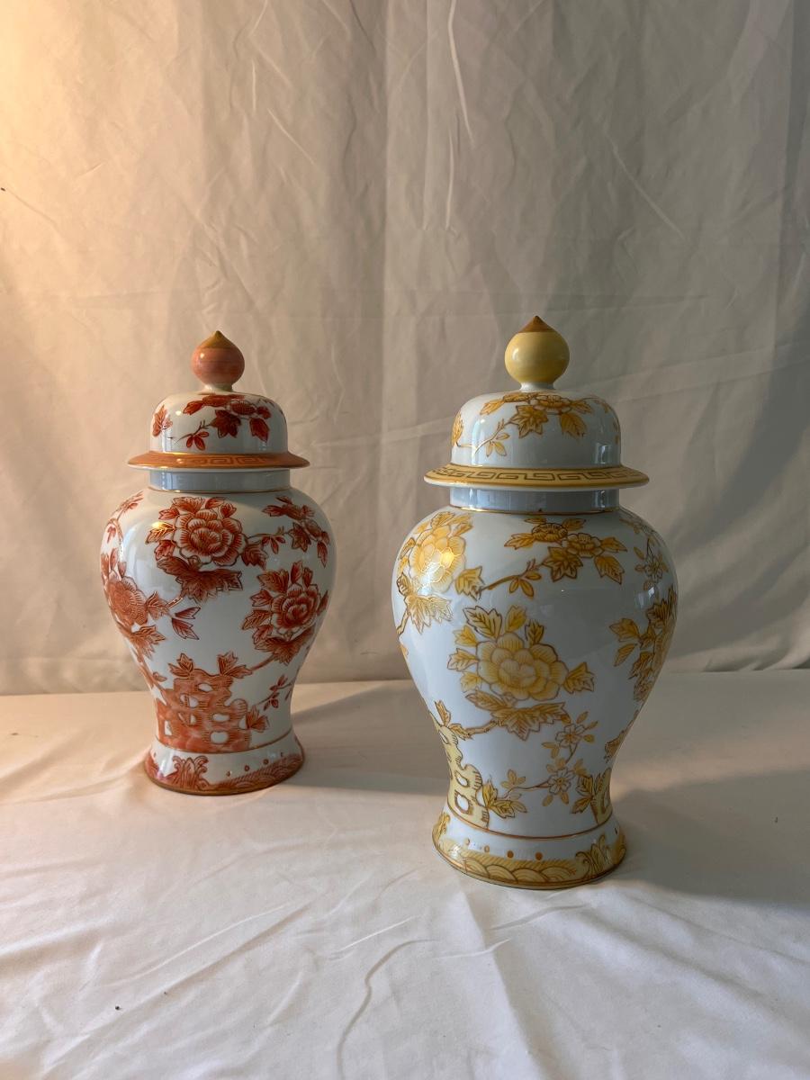 Each ginger jar is made of porcelain and decorated with a floral design. The yellow jar has a sticker that reads “Tilden-Thurber.” Both jars measure 6” x 12”H. Shipping available.