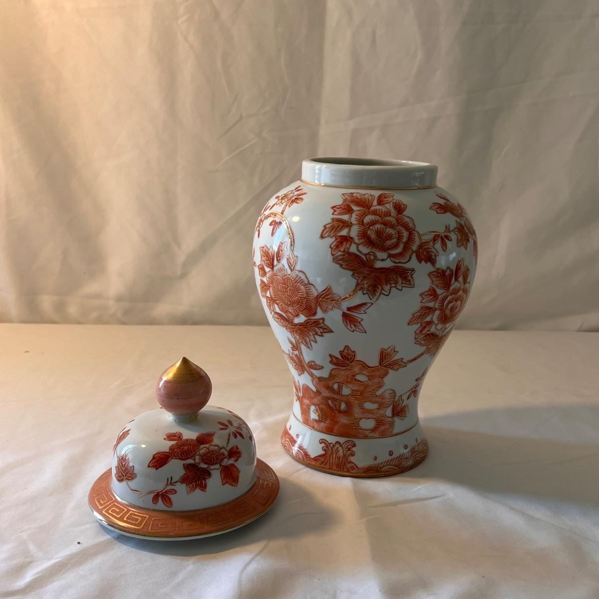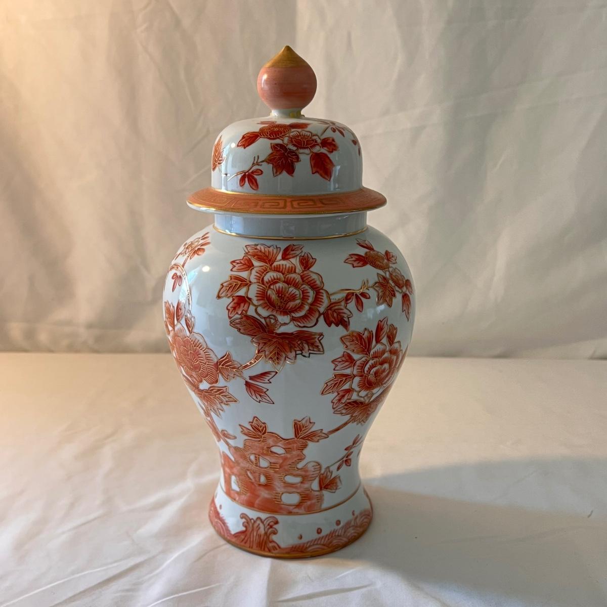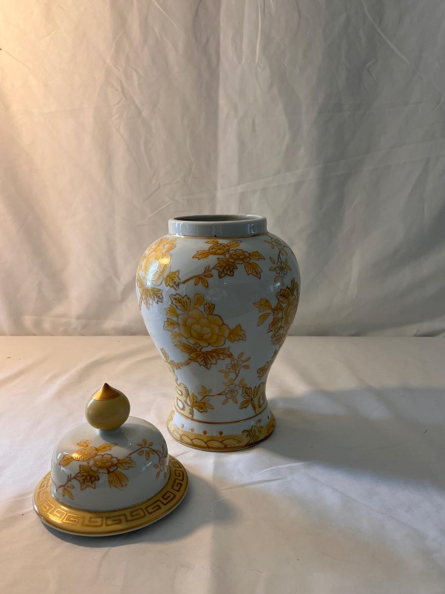 Each ginger jar is made of porcelain and decorated with a floral design. The yellow jar has a sticker that reads “Tilden-Thurber.” Both jars measure 6” x 12”H. Shipping available.