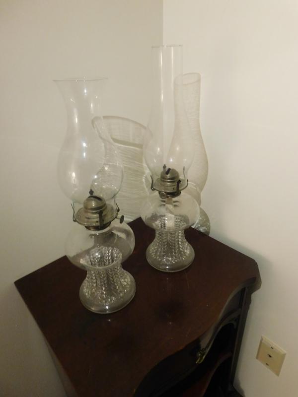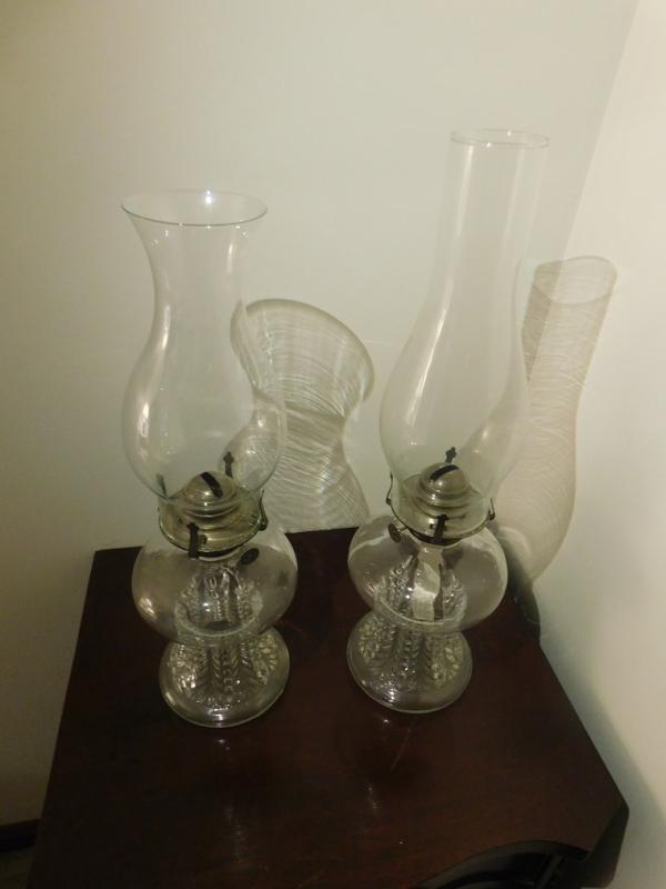 Set of Two Matching Oil Lamp Stands with Chimneys