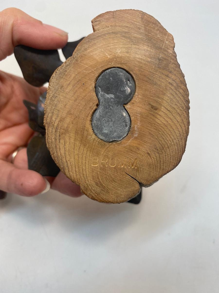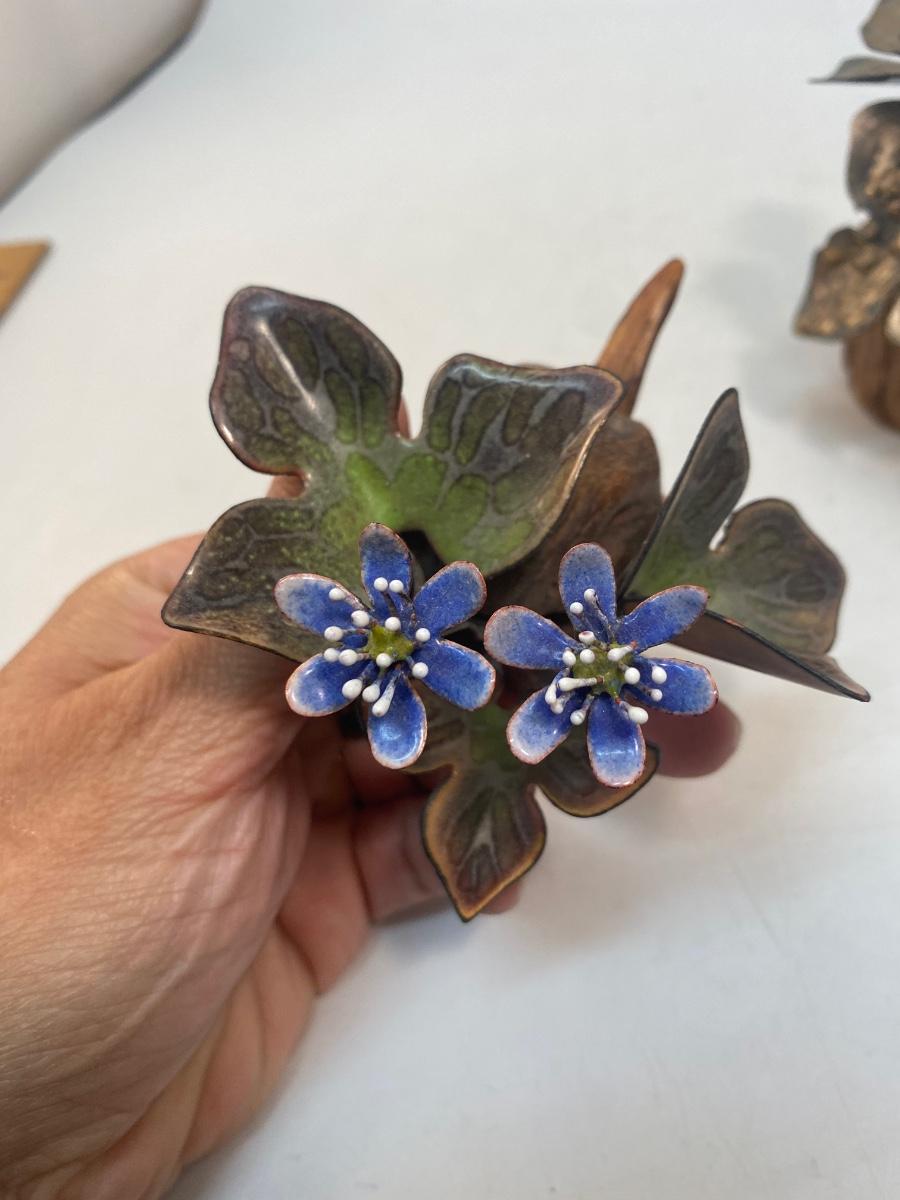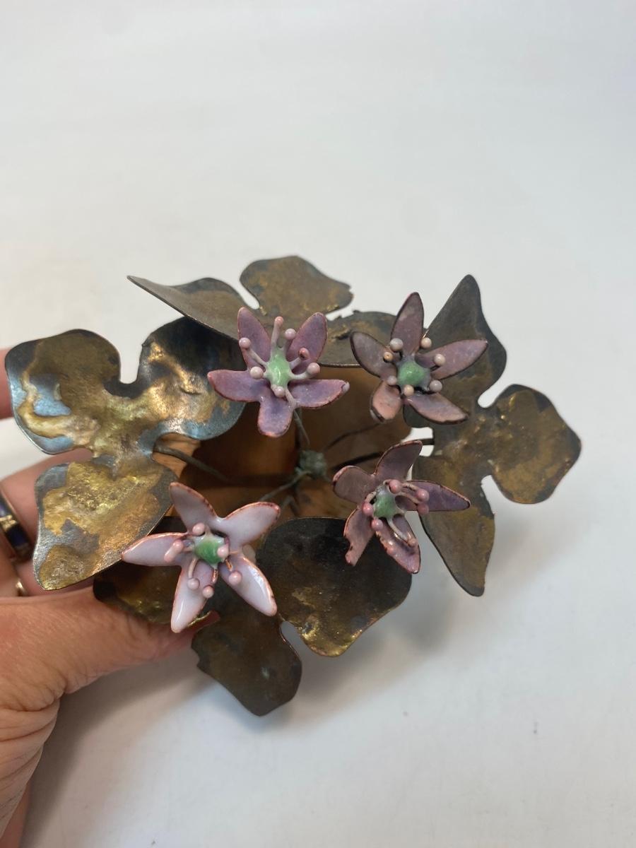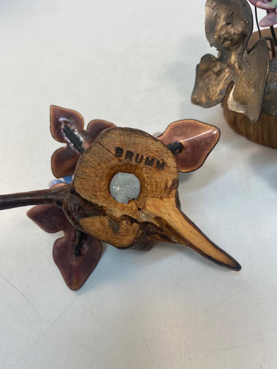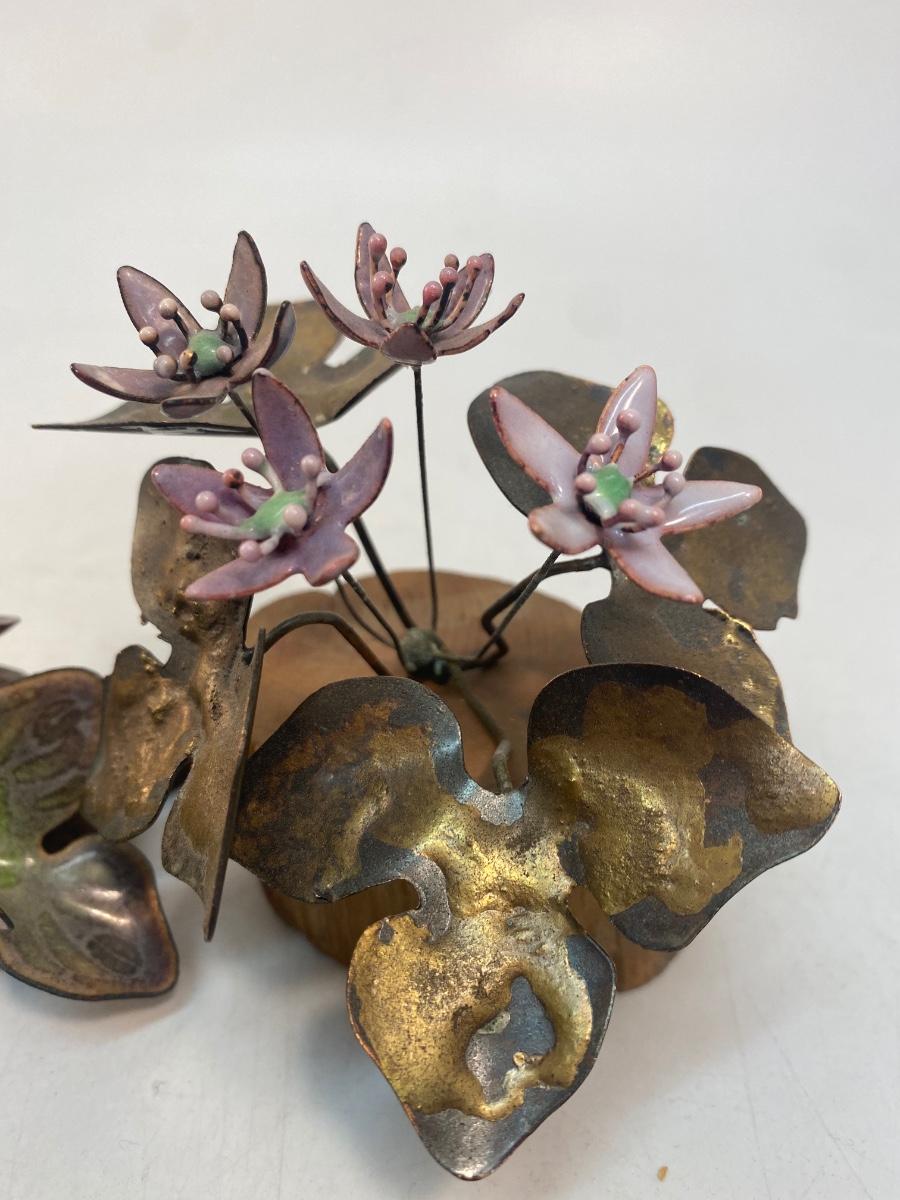 Set of Two Mid Century Retro Vintage Enameled Metal Art Flowers by Norman Brumm. Purple hued enameled copper flowers in wood bases. Both stamped Brumm on the bottom. A little dusty but display well.