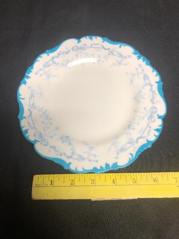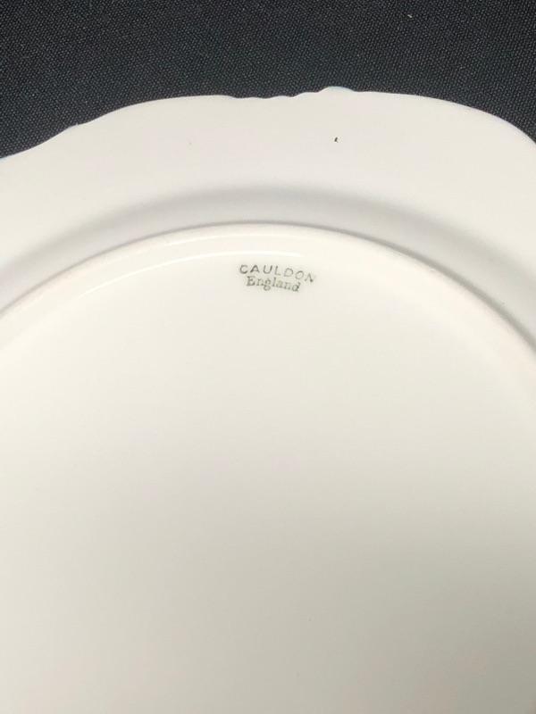 Couldron England Dessert Plates. White with blue design. About 7".