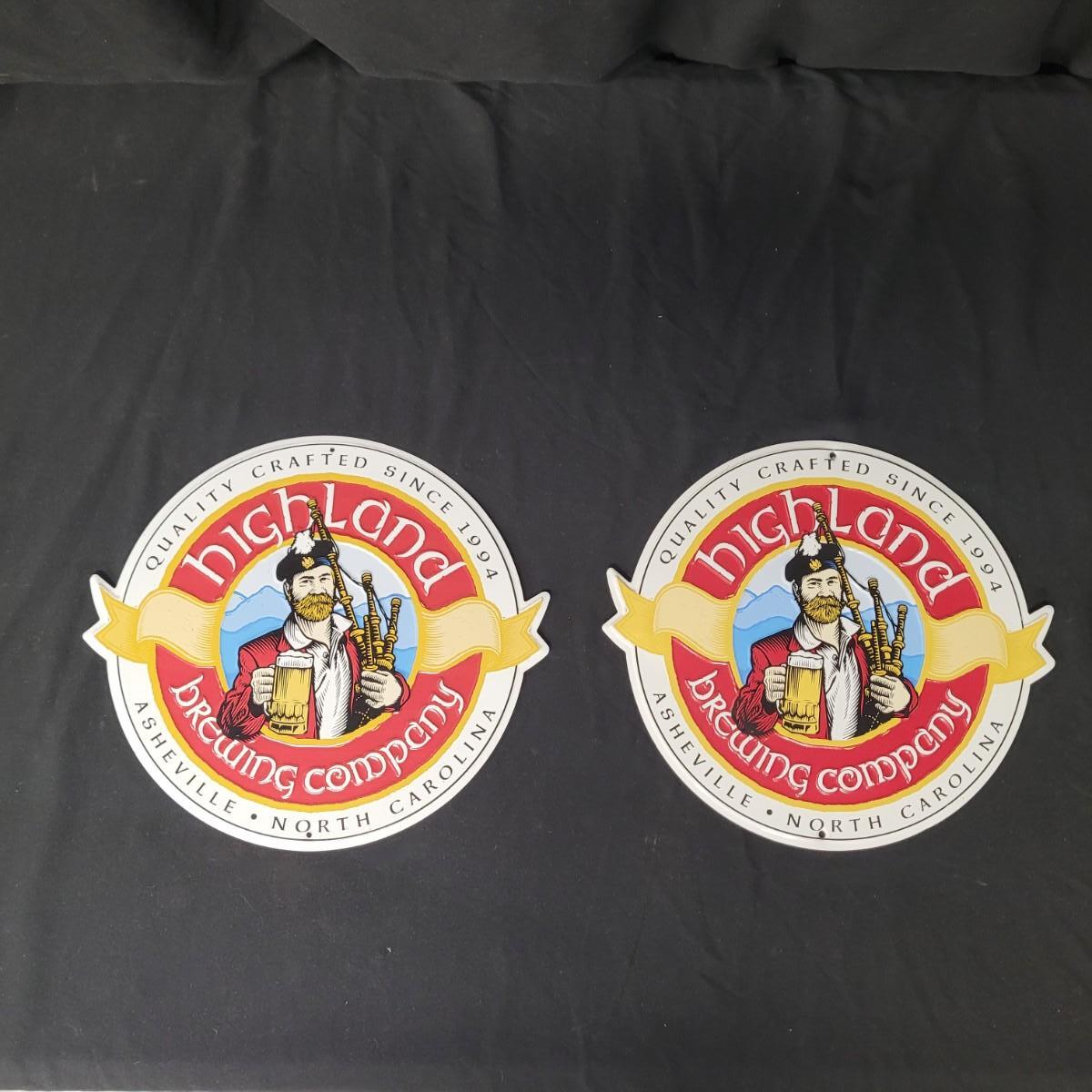 Set of twoOriginal label Highland Brewing circular metal signs. Good condition, normal wear and tear (see pictures). Measures approximately 12.5"DIA. Shipping available.