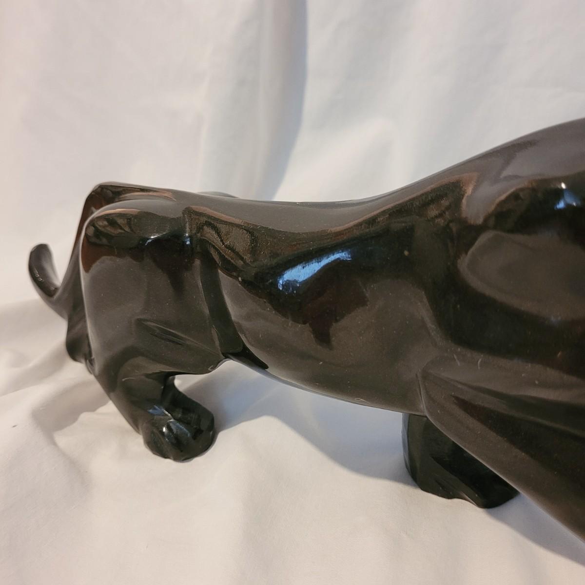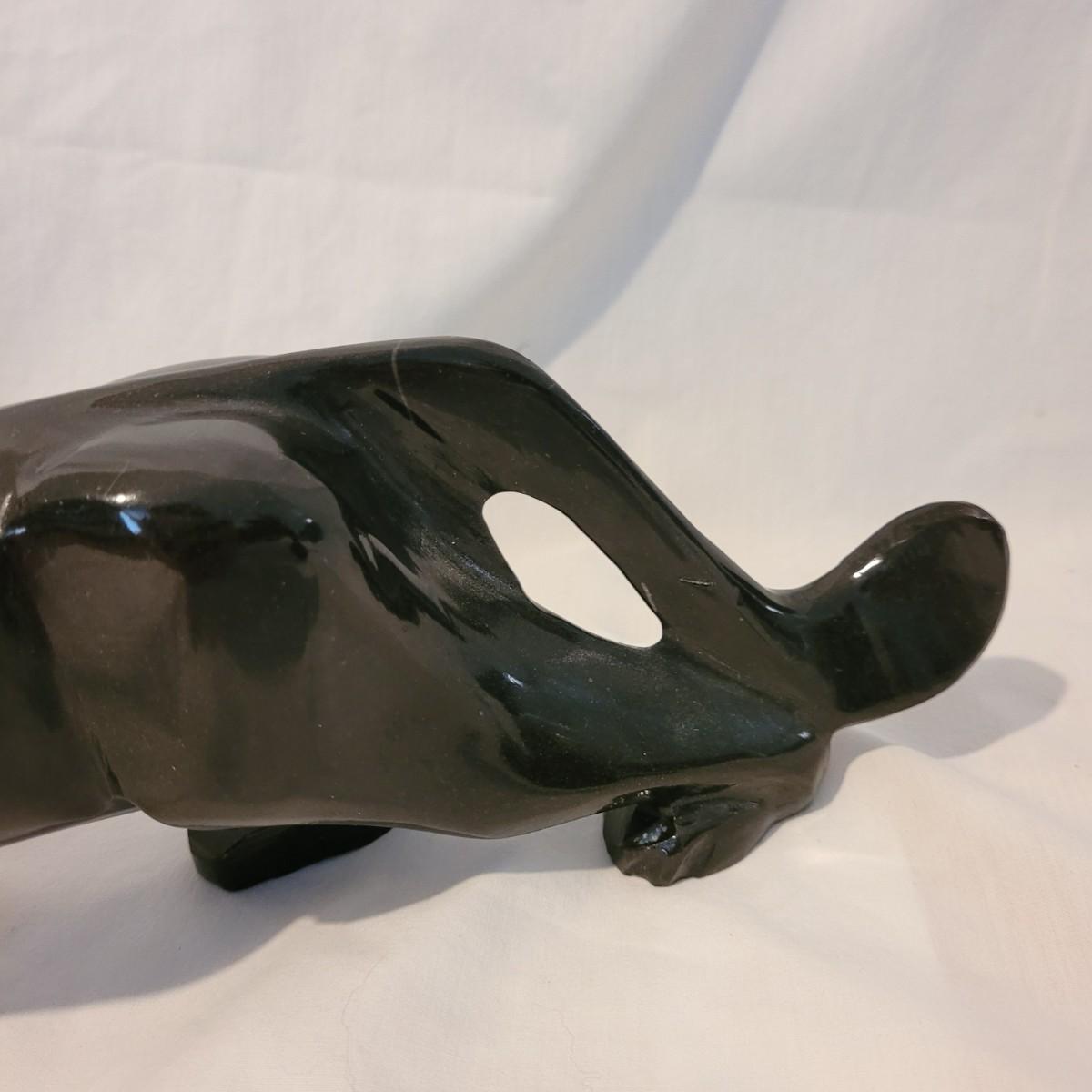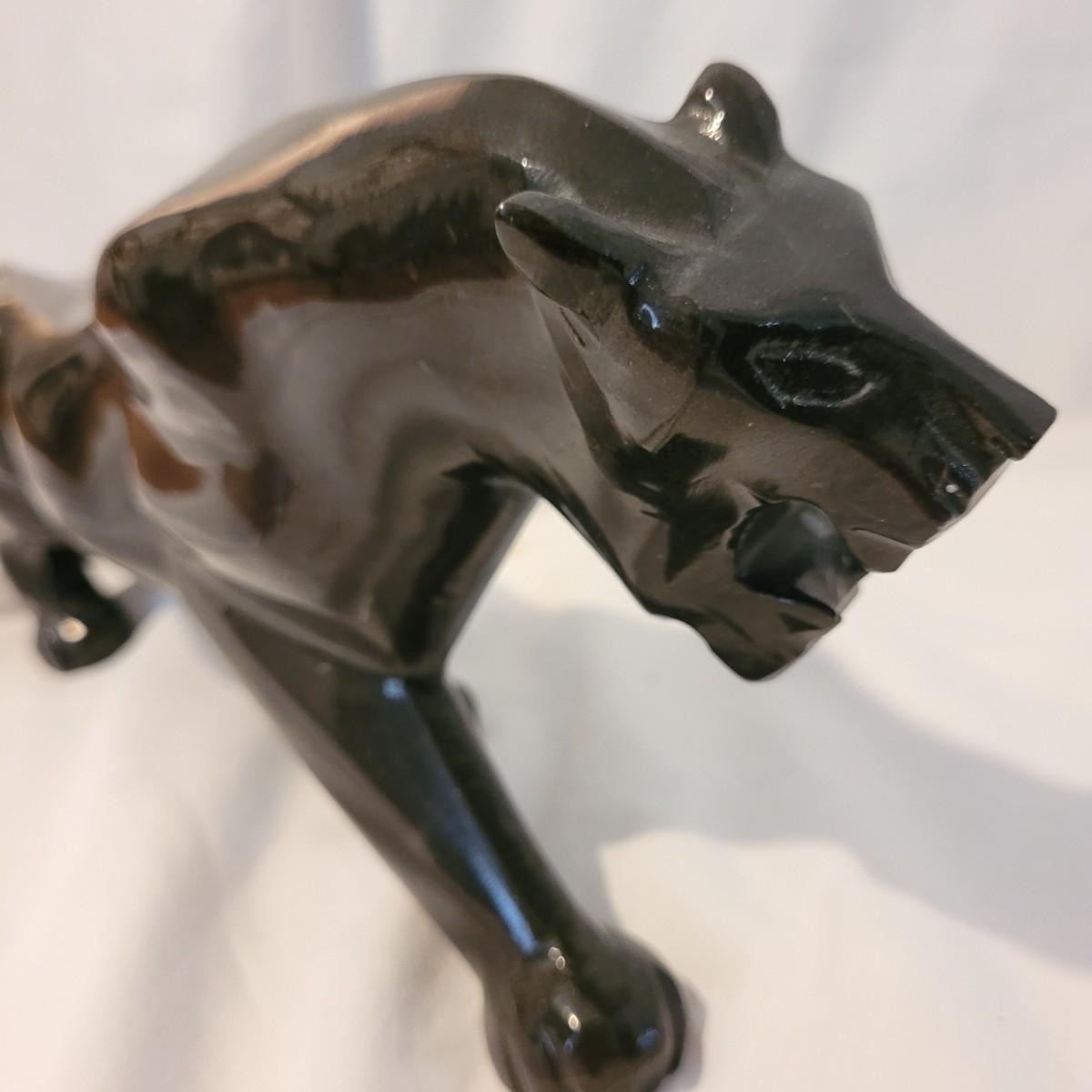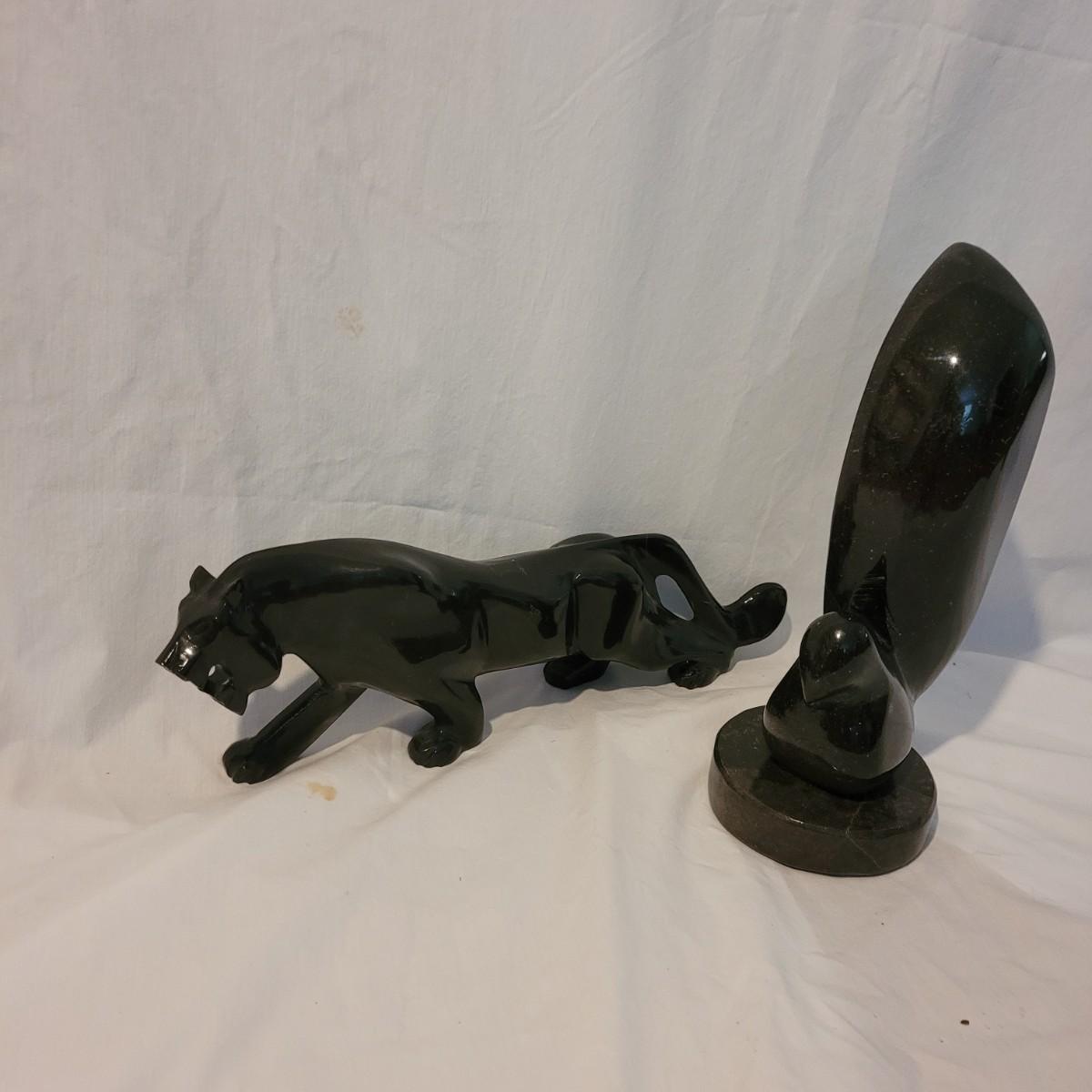 Black stone animal sculptures, very smooth polish and quite heavy. Unable to verify type of stone, but possibly onyx. Wild cat sculpture appears to be a cheetah or panther, other sculpture may be a squirrel or a bird. Both in excellent condition with remnants of scotch tape that can be removed and cleaned. Bird measures approximately 11.5"H, panther 15"L. Shipping available.