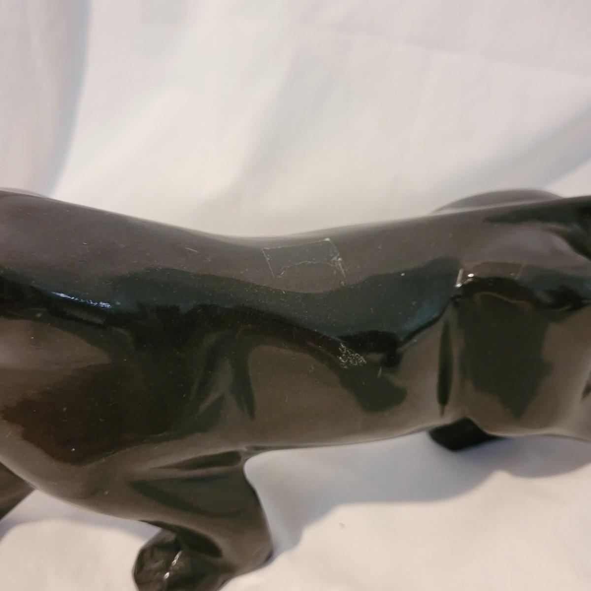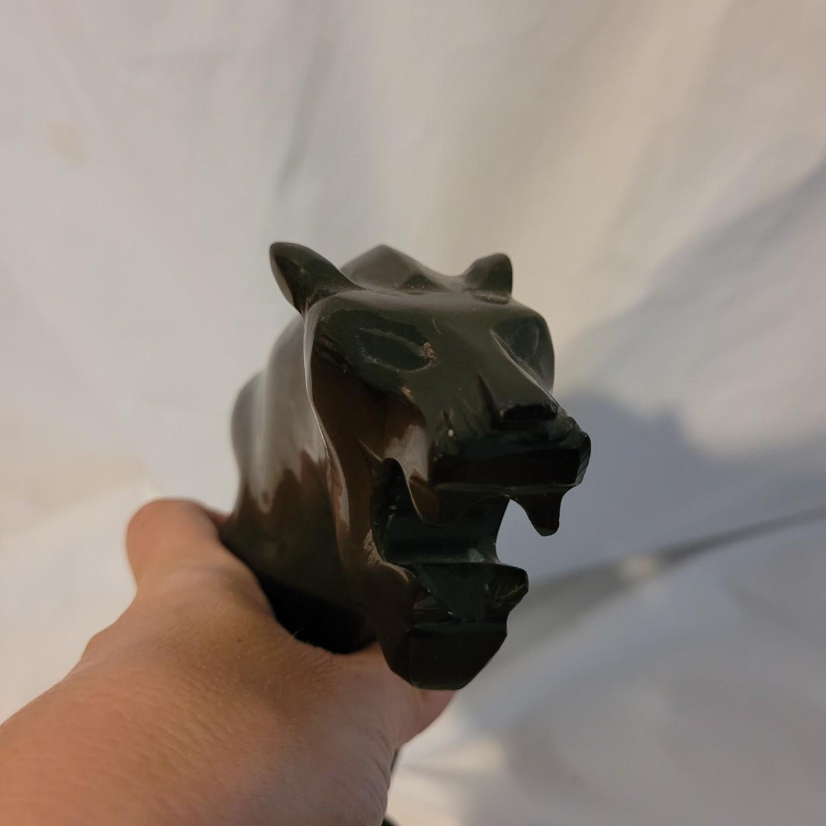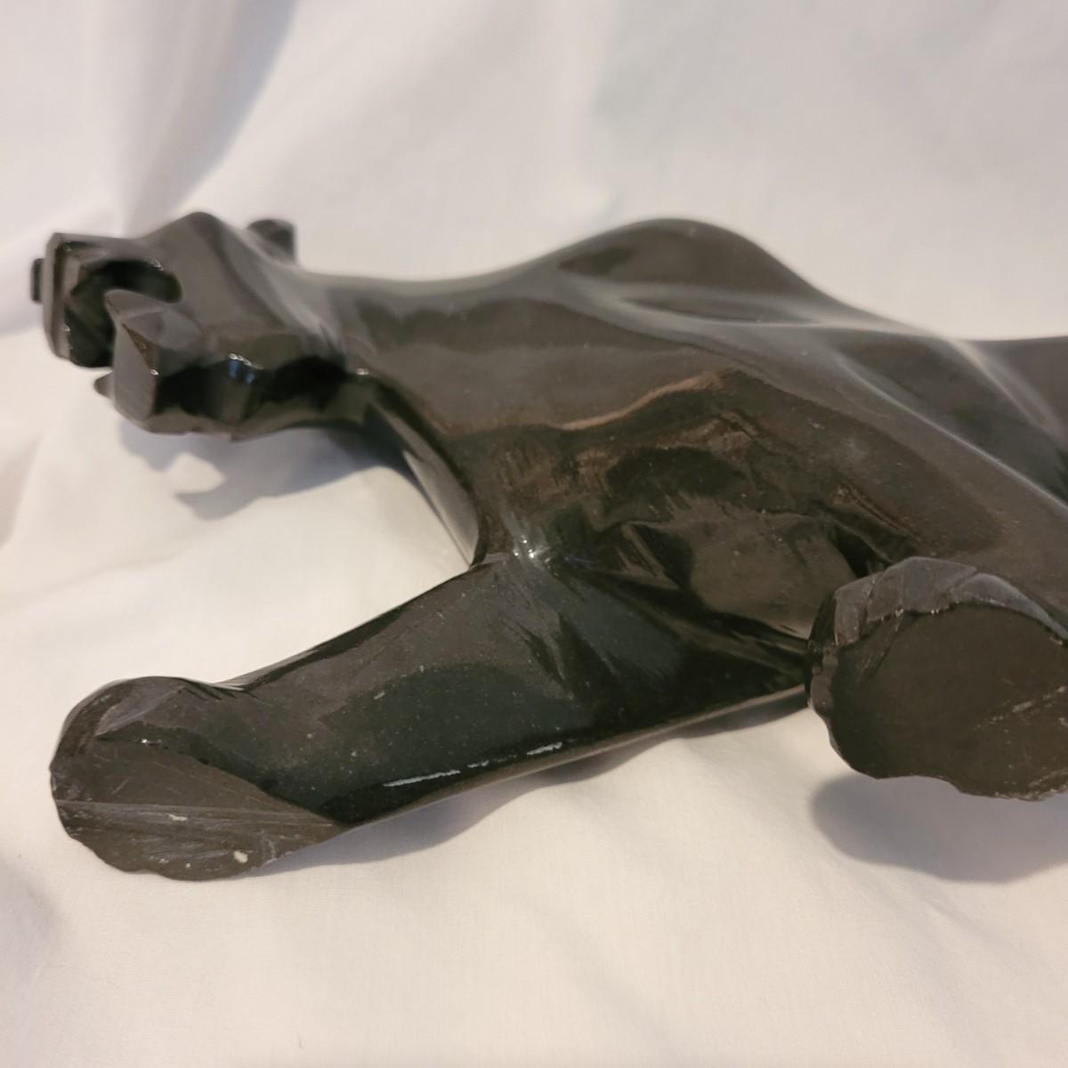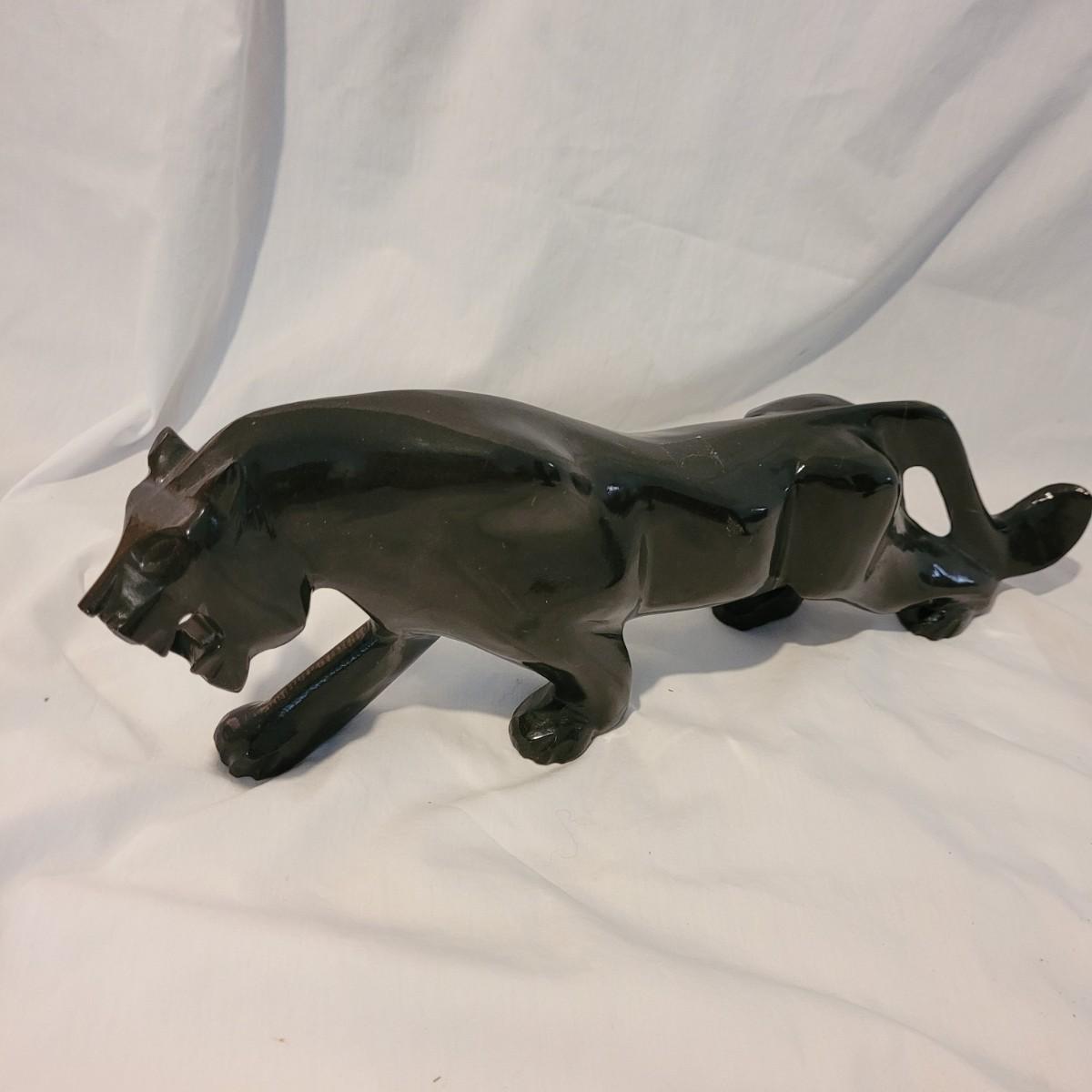 Black stone animal sculptures, very smooth polish and quite heavy. Unable to verify type of stone, but possibly onyx. Wild cat sculpture appears to be a cheetah or panther, other sculpture may be a squirrel or a bird. Both in excellent condition with remnants of scotch tape that can be removed and cleaned. Bird measures approximately 11.5"H, panther 15"L. Shipping available.