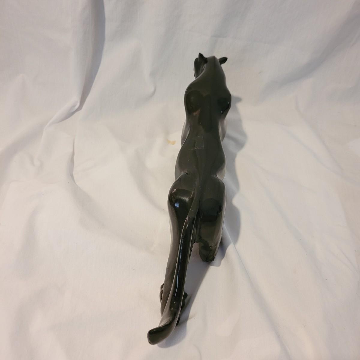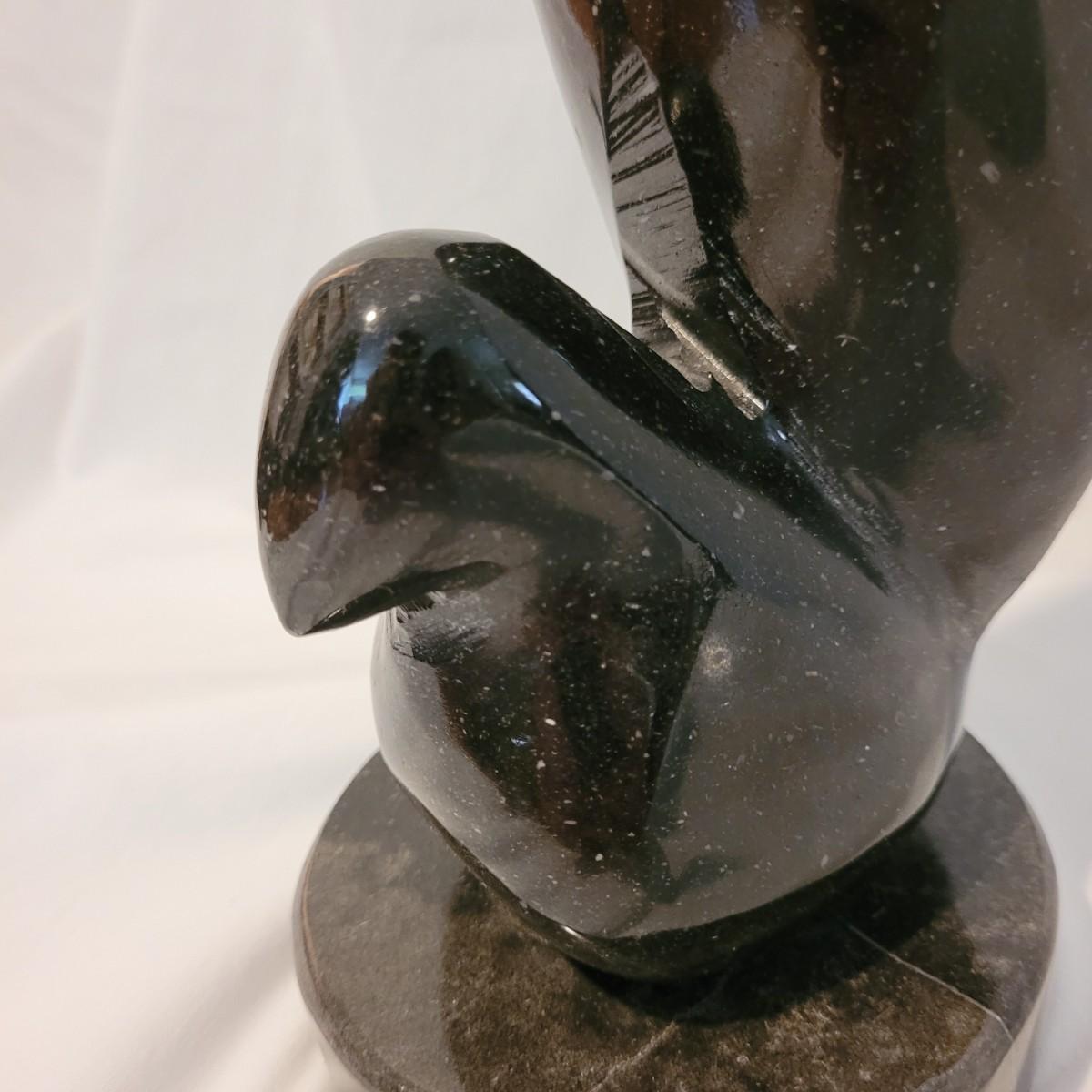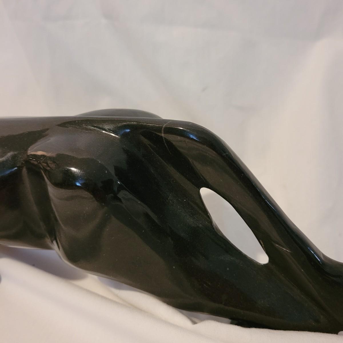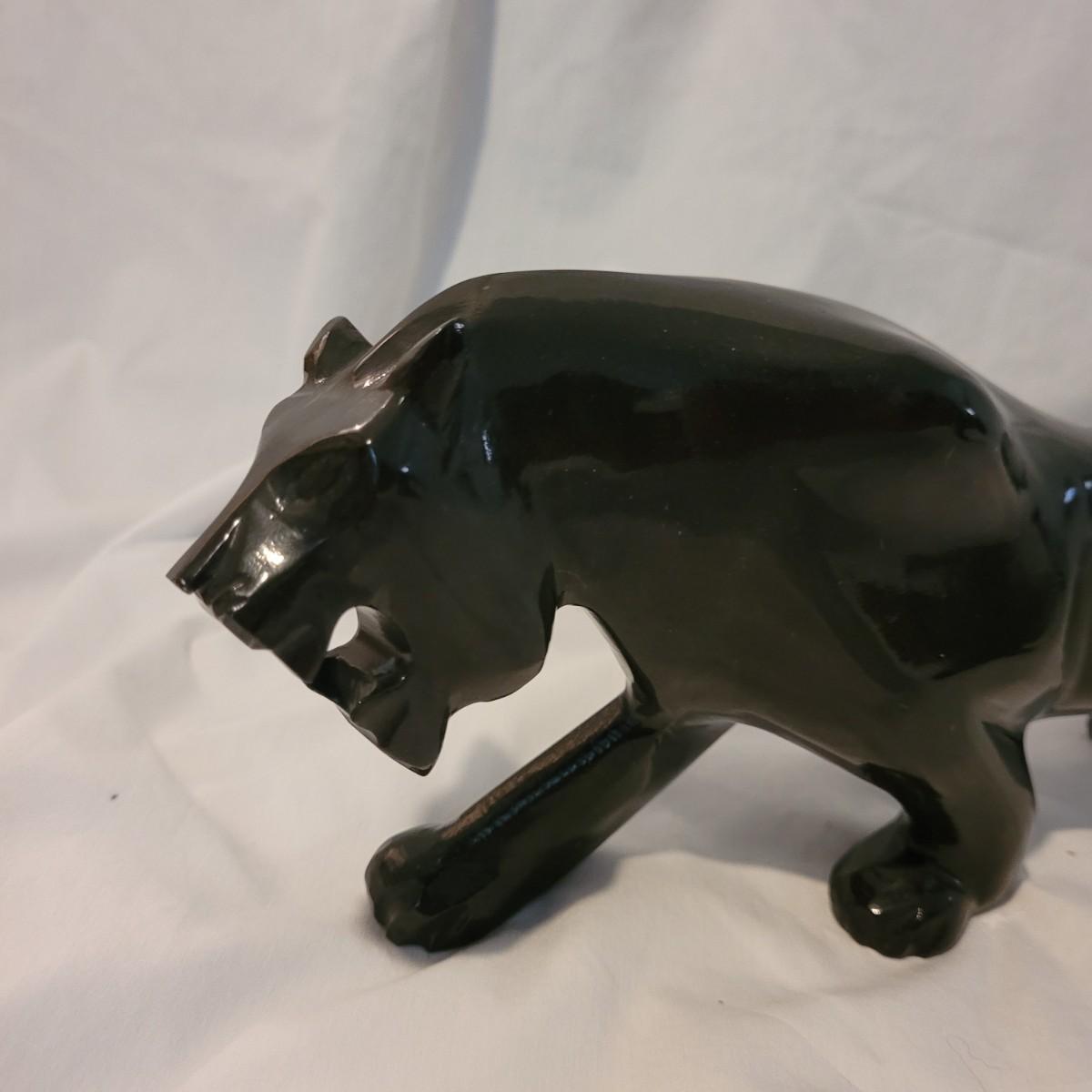 Black stone animal sculptures, very smooth polish and quite heavy. Unable to verify type of stone, but possibly onyx. Wild cat sculpture appears to be a cheetah or panther, other sculpture may be a squirrel or a bird. Both in excellent condition with remnants of scotch tape that can be removed and cleaned. Bird measures approximately 11.5"H, panther 15"L. Shipping available.