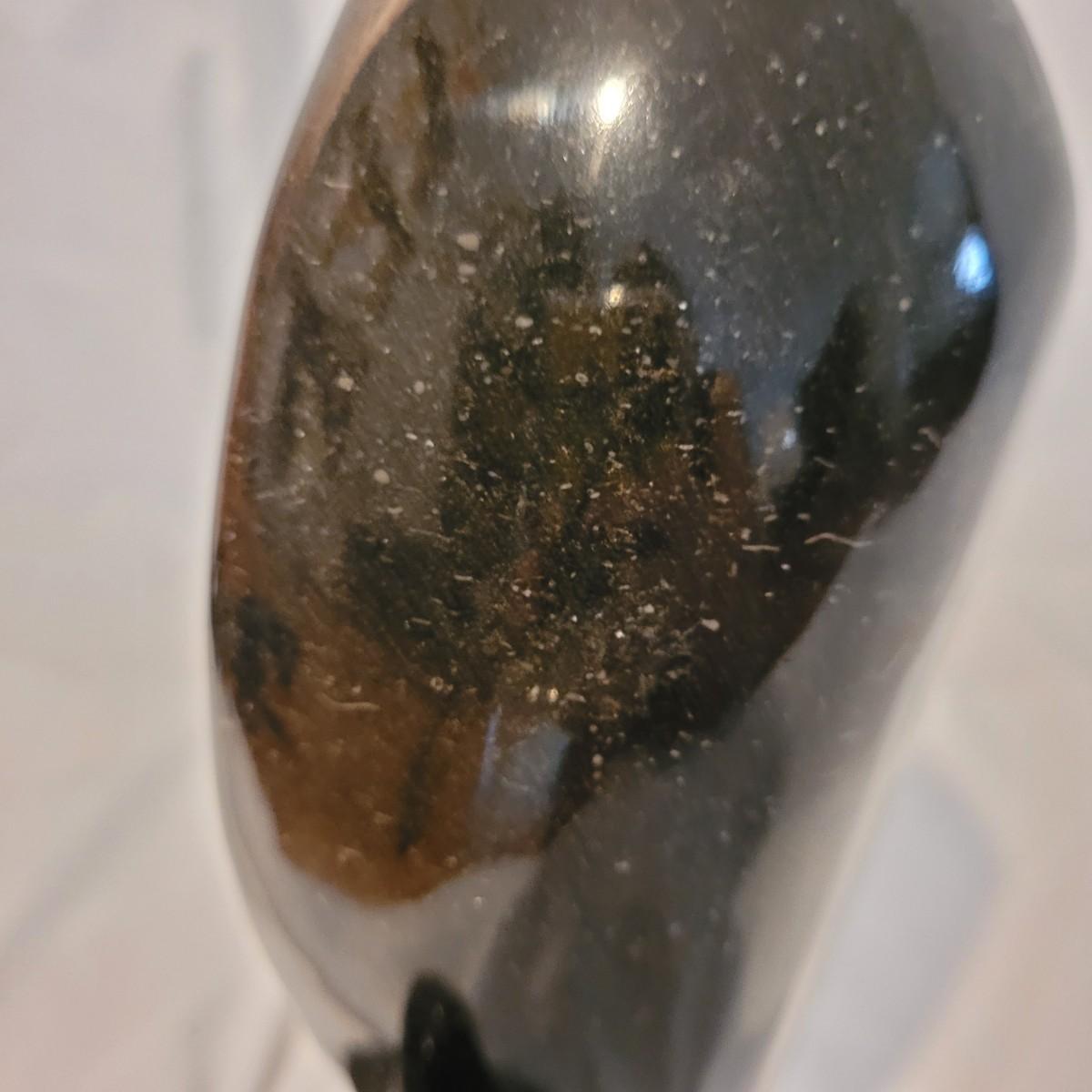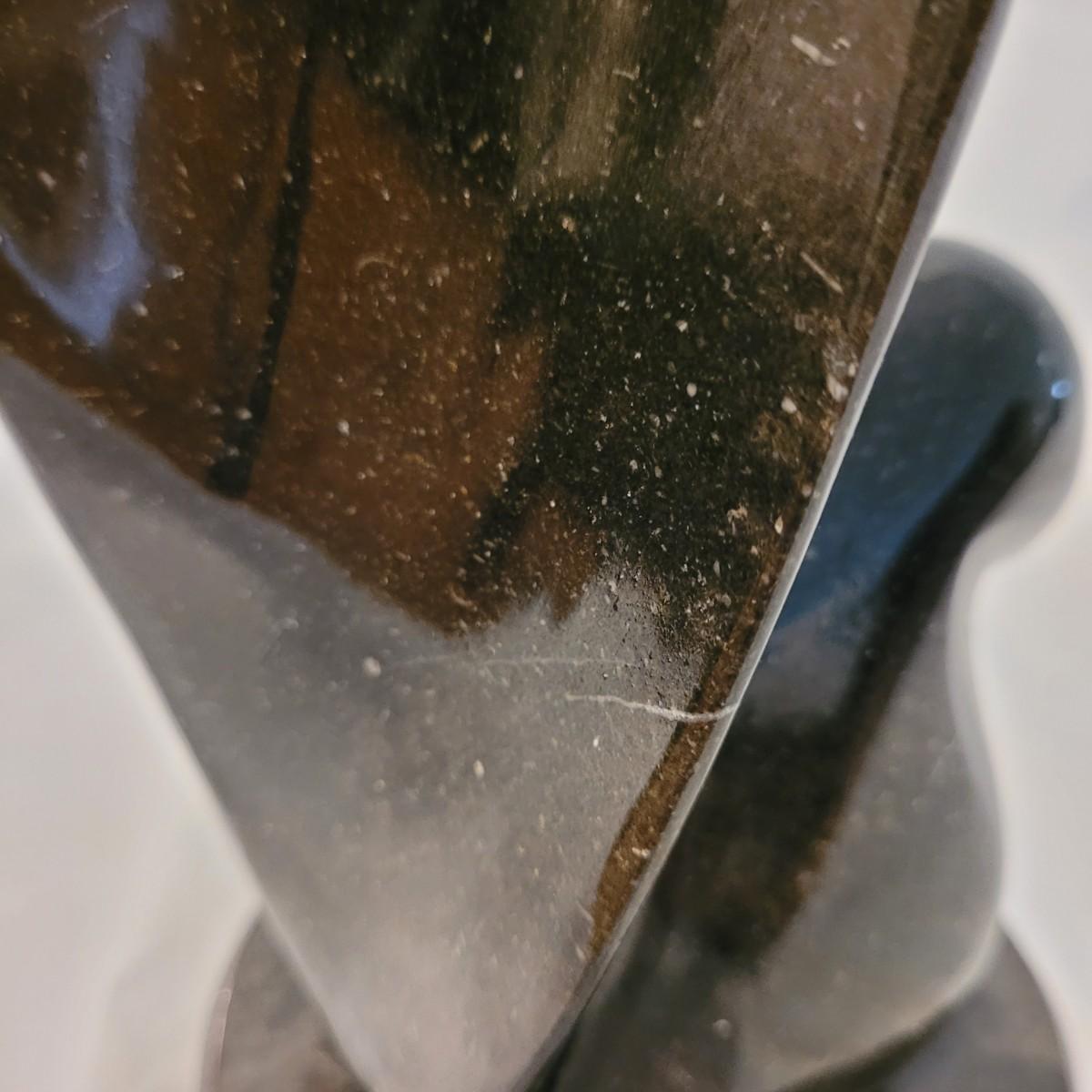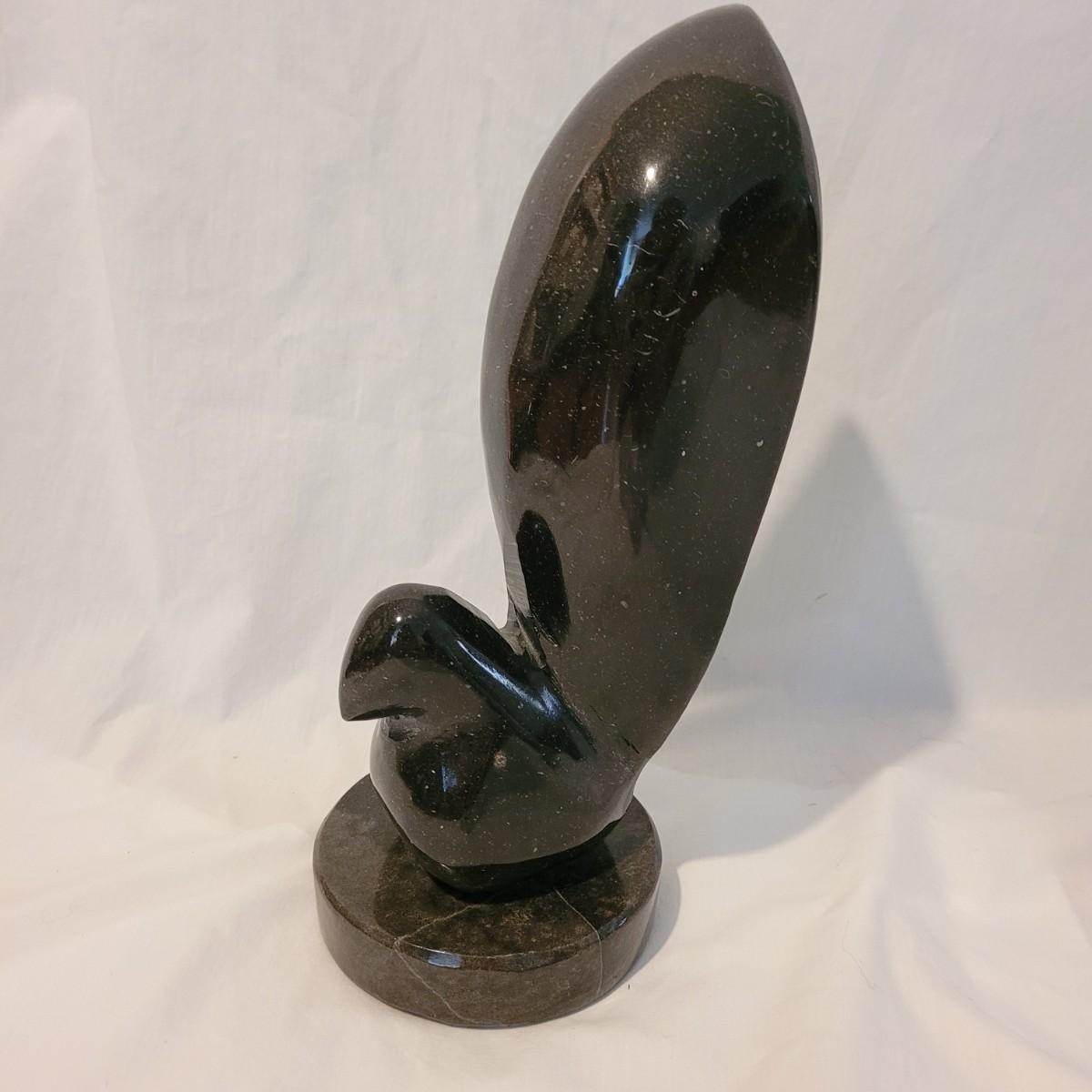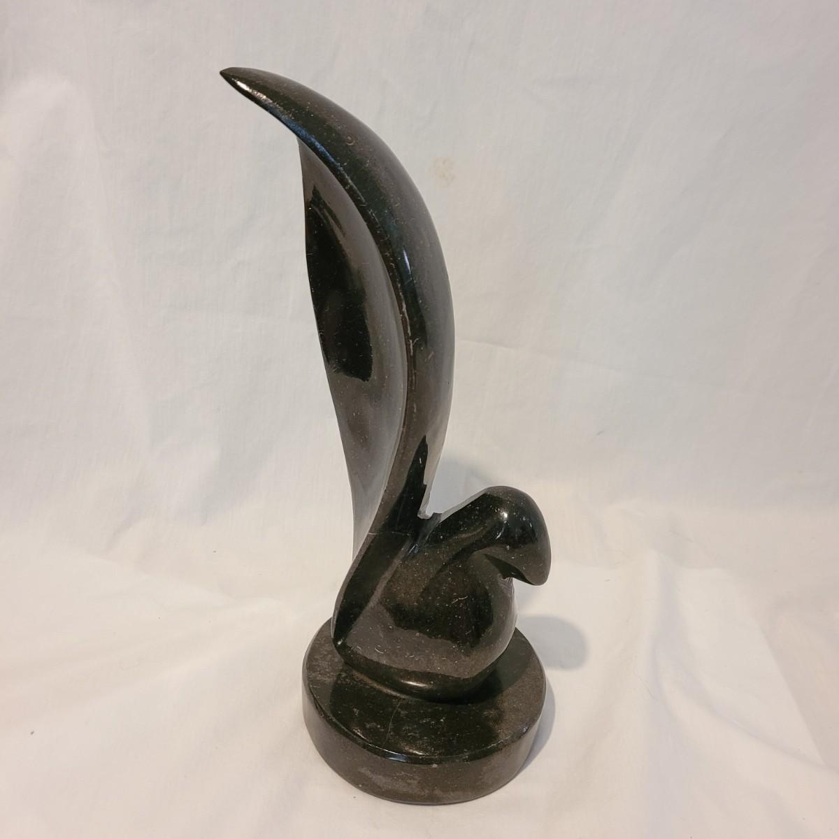 Black stone animal sculptures, very smooth polish and quite heavy. Unable to verify type of stone, but possibly onyx. Wild cat sculpture appears to be a cheetah or panther, other sculpture may be a squirrel or a bird. Both in excellent condition with remnants of scotch tape that can be removed and cleaned. Bird measures approximately 11.5"H, panther 15"L. Shipping available.