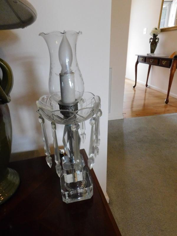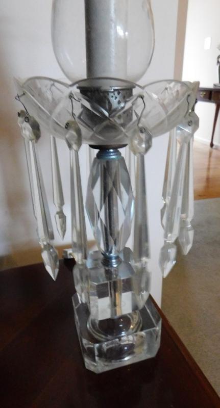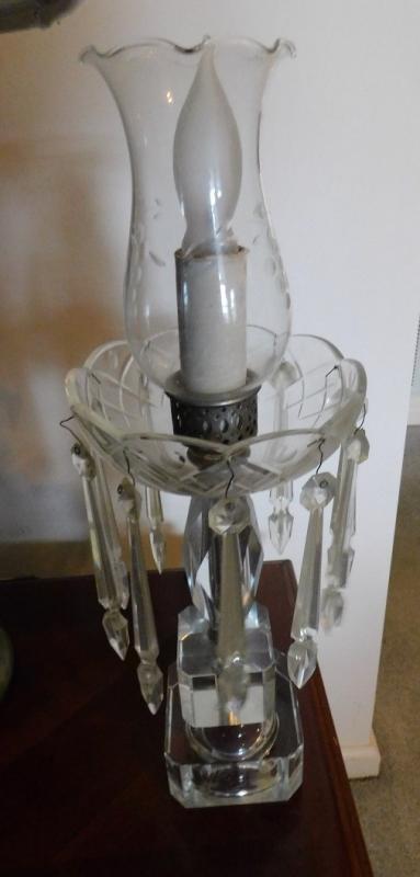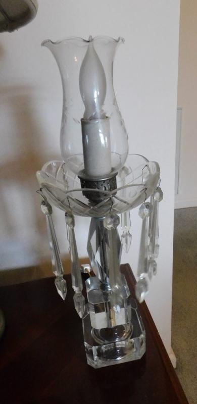 Set of Two Vintage Crystal Hurricane Electric Lamps with Spear Pendants in very good condition. Nice item.