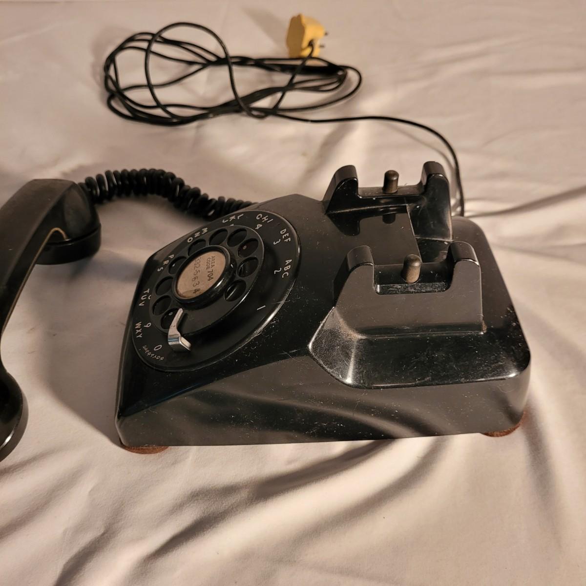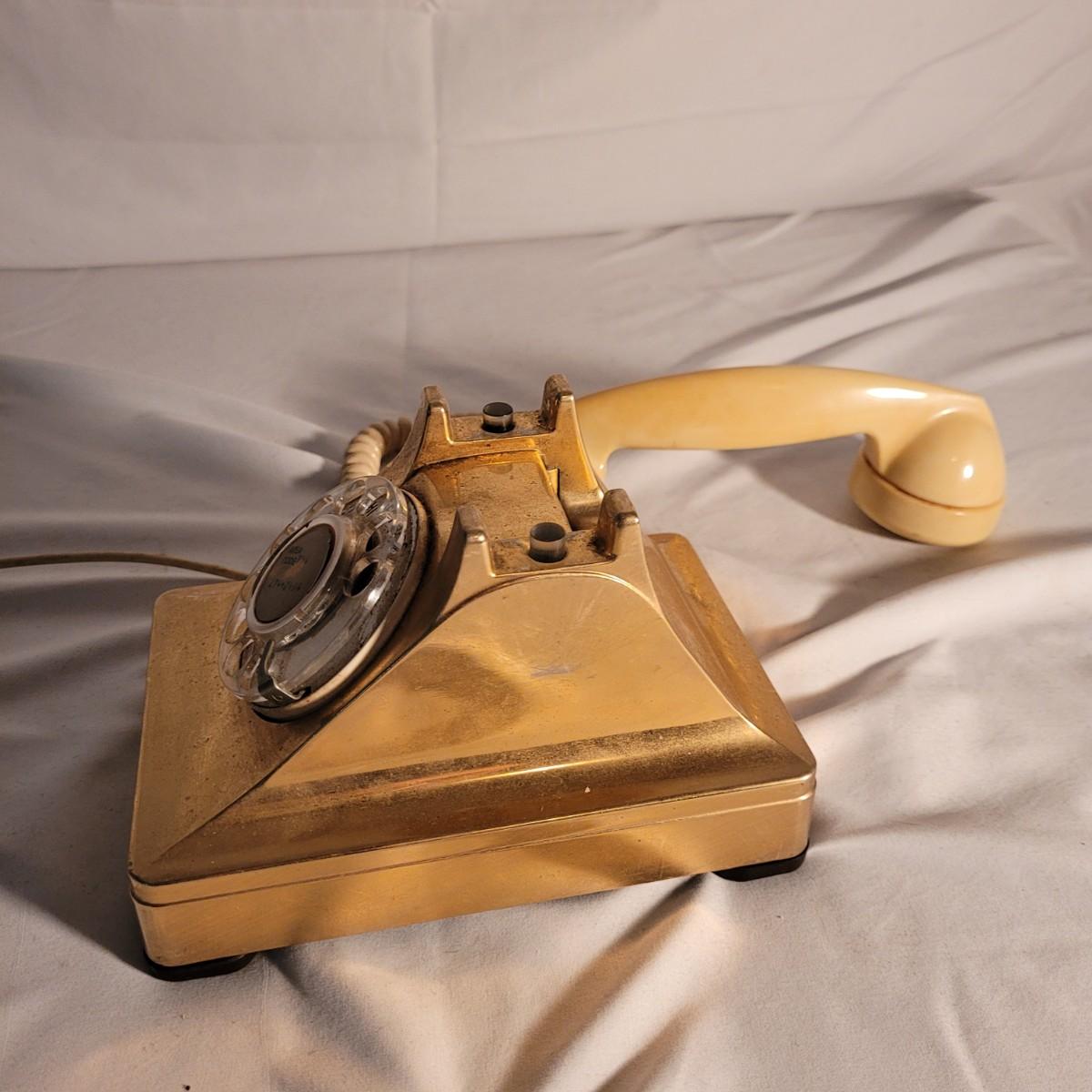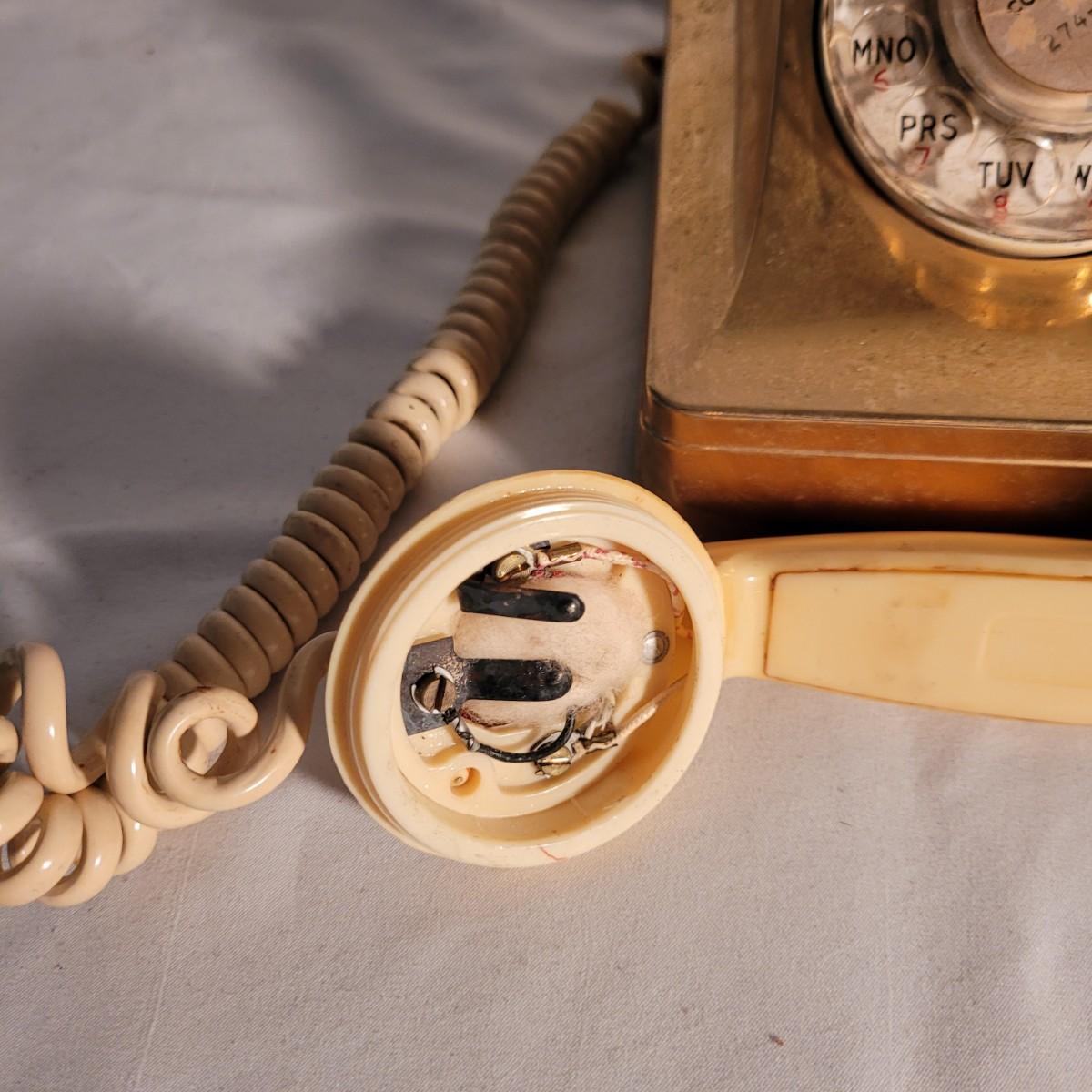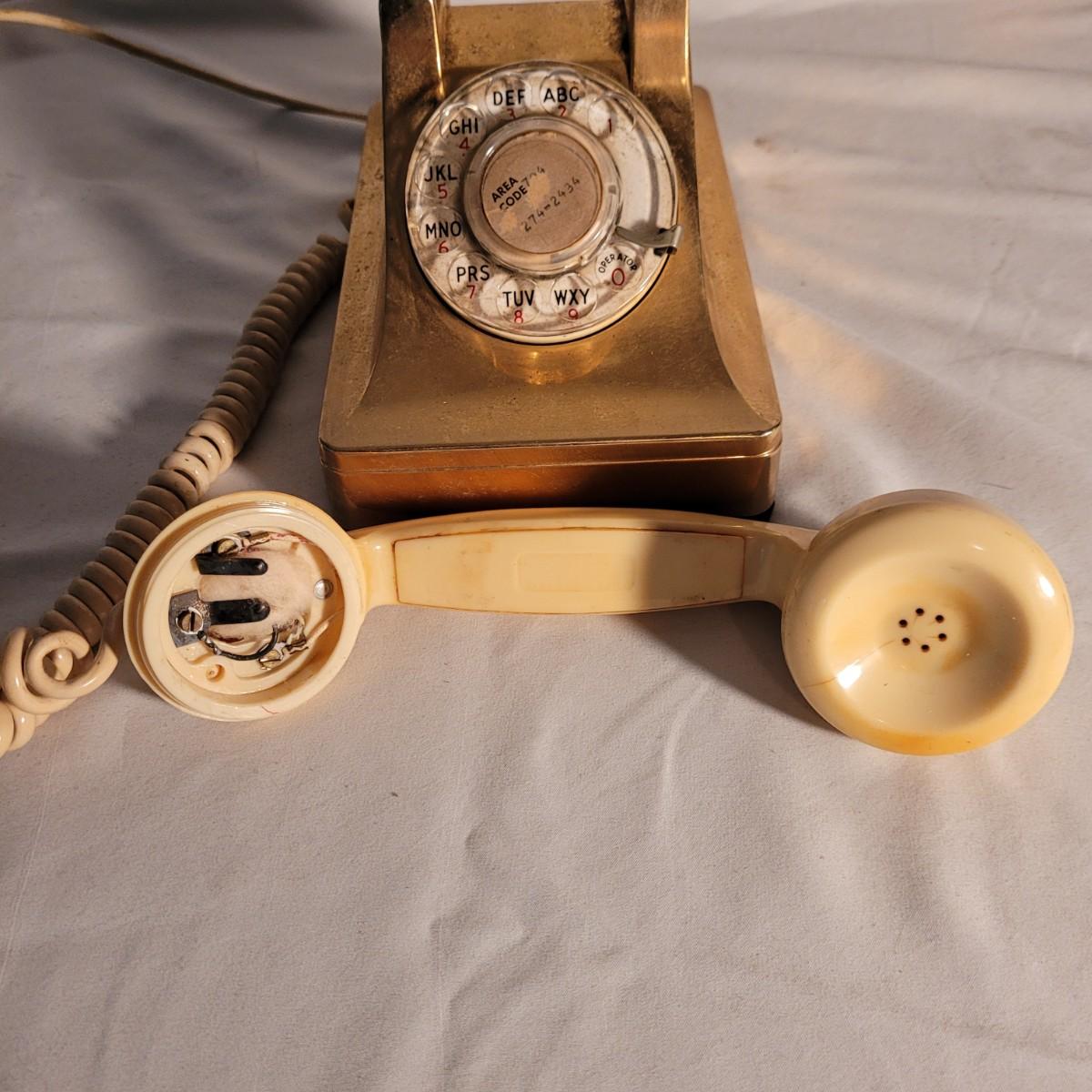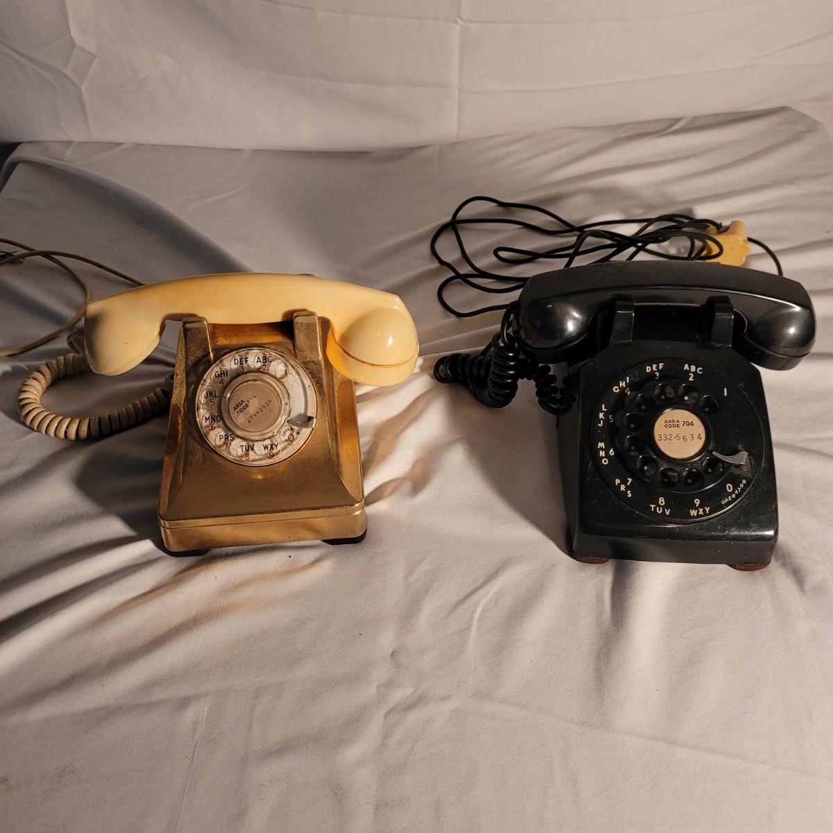 Set of two vintage rotary phones. Dials spin fine. Black phone is Western Electric brand. Can not confirm if the phones function when plugged in. Gold phone has ear piece with wiring and cap detached. Both phones have accumulation of dust, appear to be easily cleanable. For reference, gold phone measures approximately 5.5"L x8"D x6"H. Shipping available.