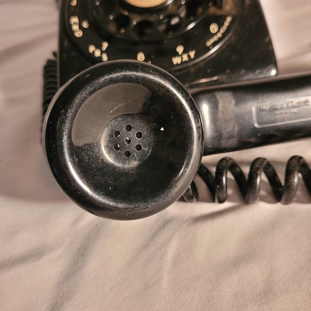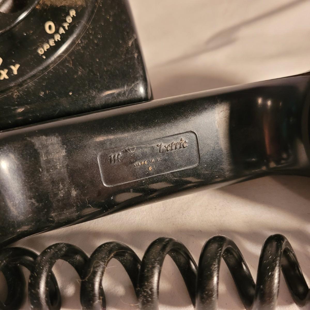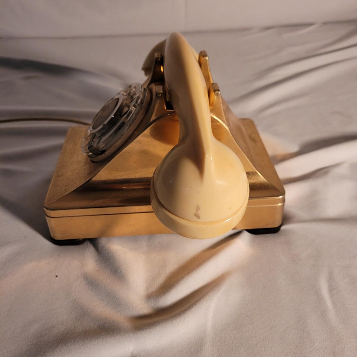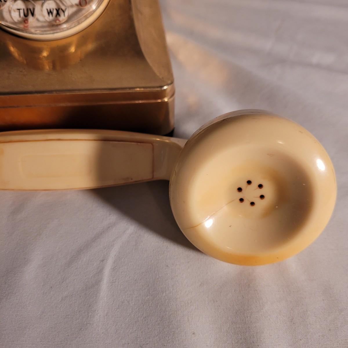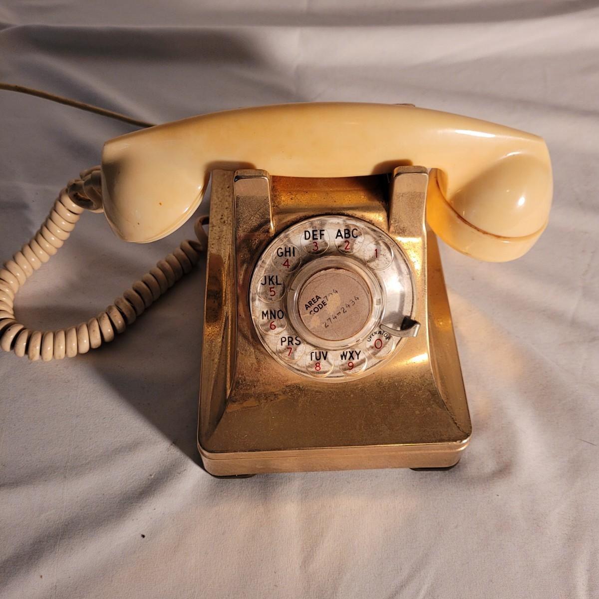 Set of two vintage rotary phones. Dials spin fine. Black phone is Western Electric brand. Can not confirm if the phones function when plugged in. Gold phone has ear piece with wiring and cap detached. Both phones have accumulation of dust, appear to be easily cleanable. For reference, gold phone measures approximately 5.5"L x8"D x6"H. Shipping available.