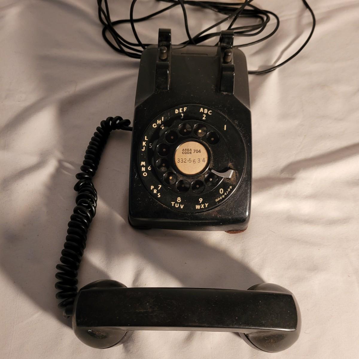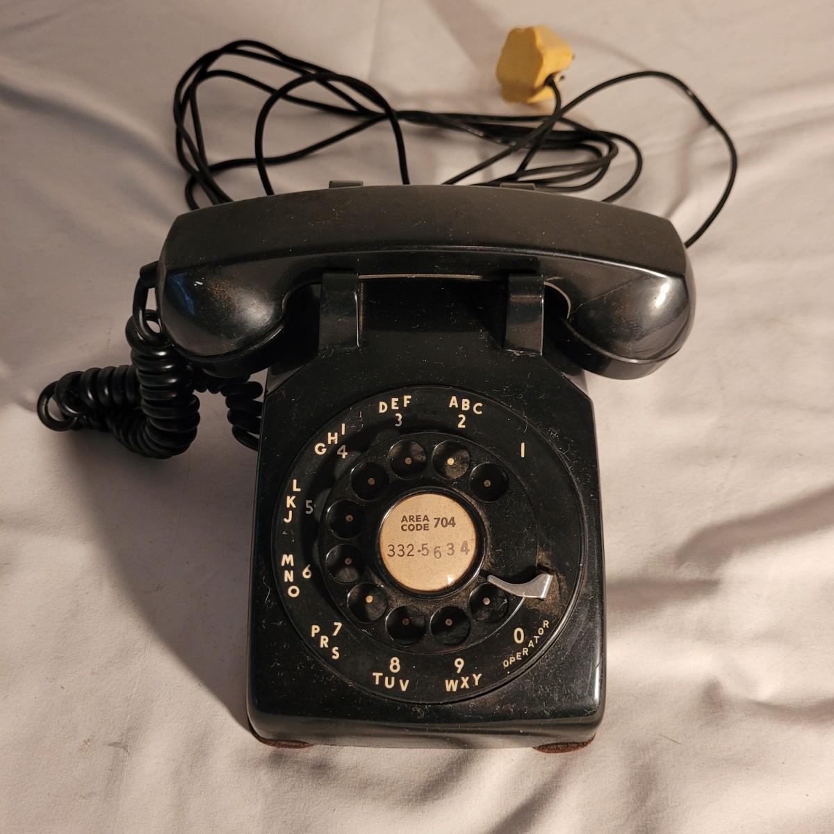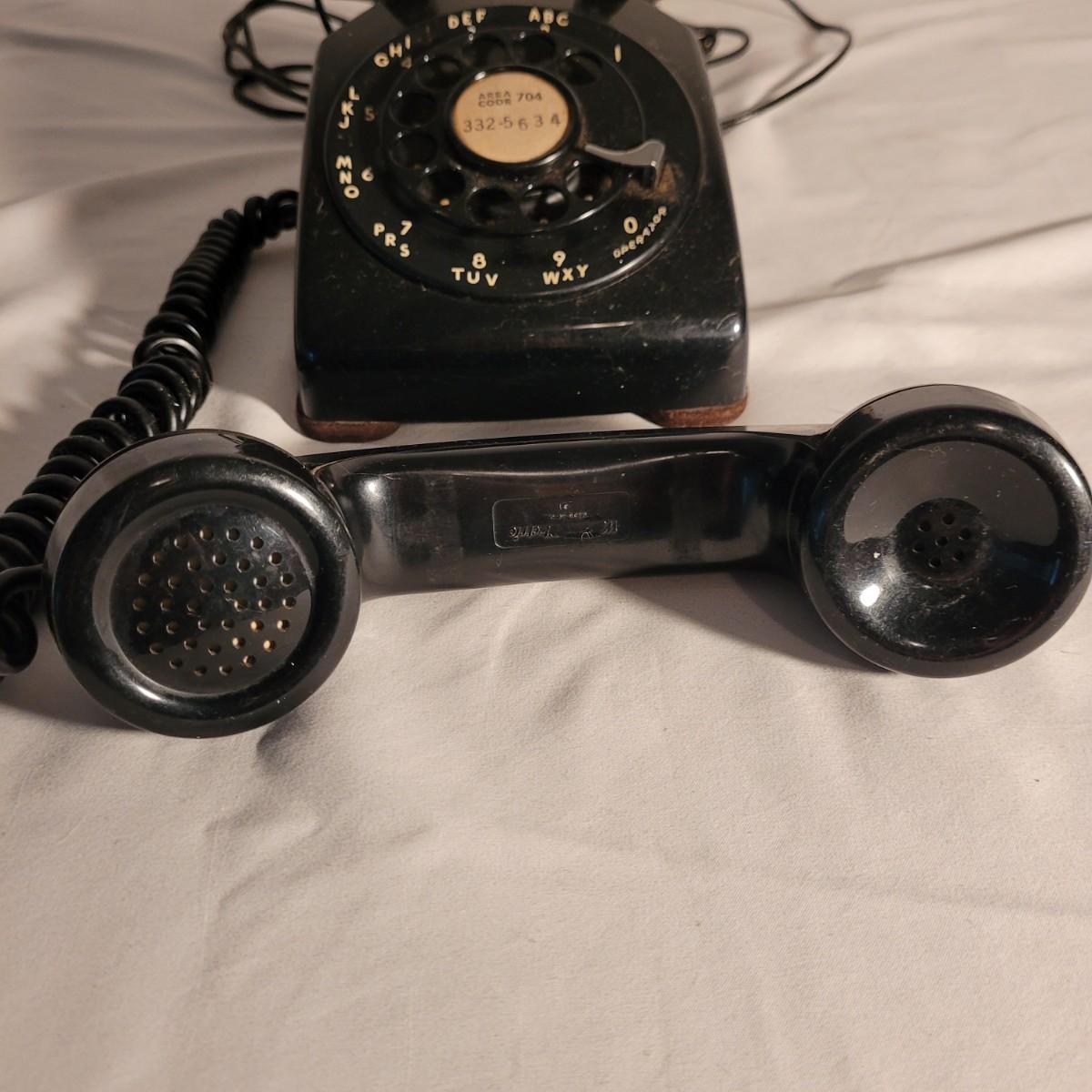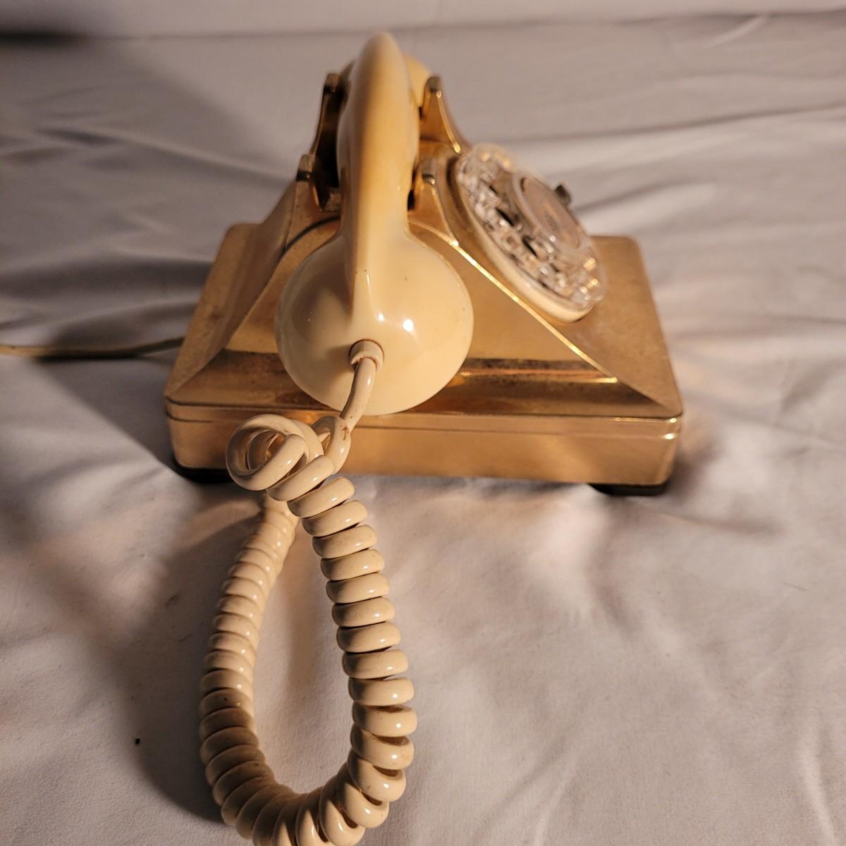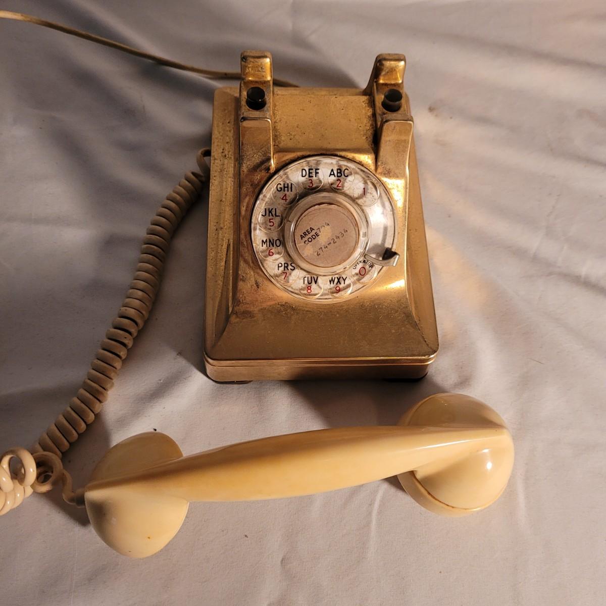 Set of two vintage rotary phones. Dials spin fine. Black phone is Western Electric brand. Can not confirm if the phones function when plugged in. Gold phone has ear piece with wiring and cap detached. Both phones have accumulation of dust, appear to be easily cleanable. For reference, gold phone measures approximately 5.5"L x8"D x6"H. Shipping available.