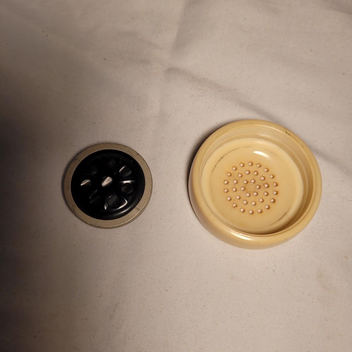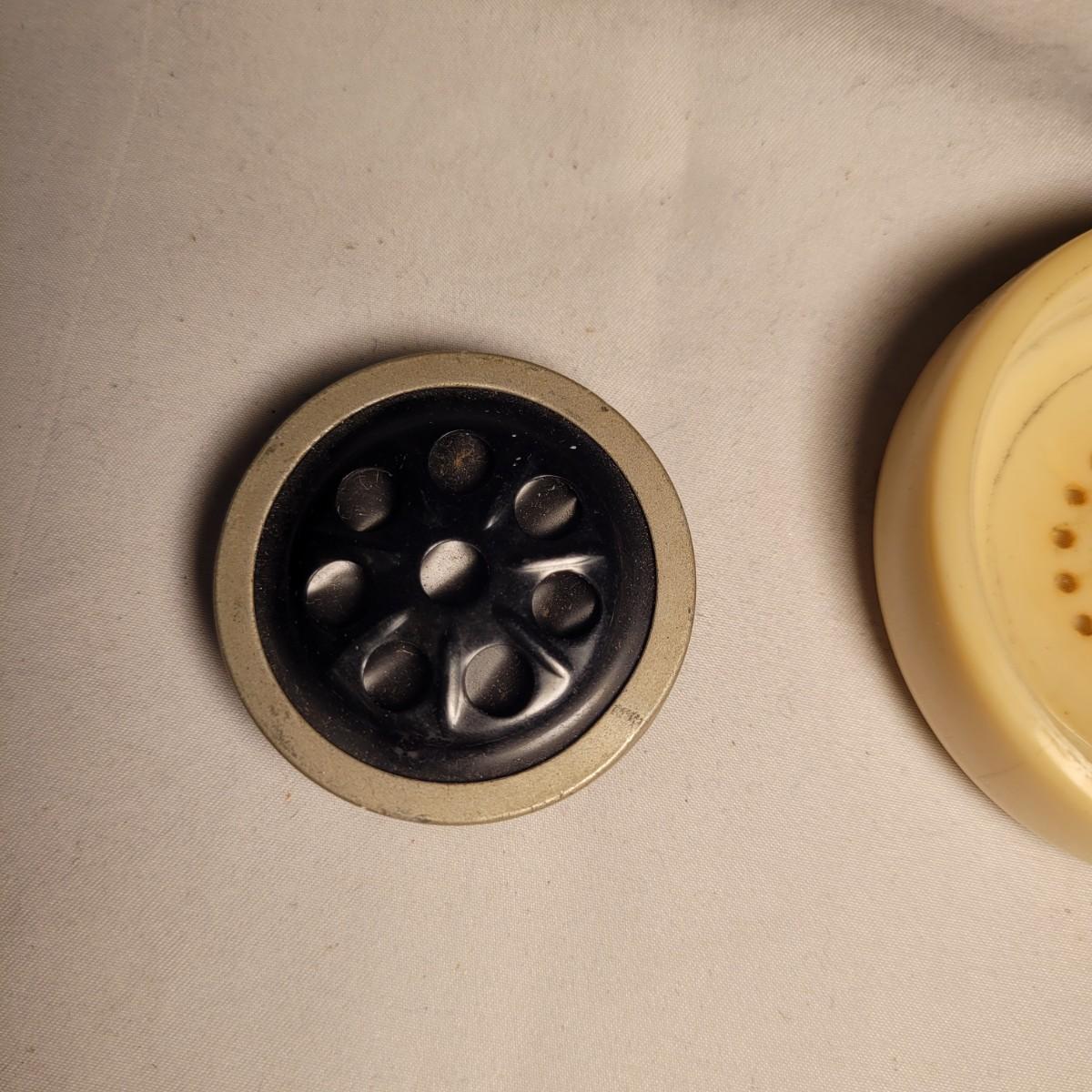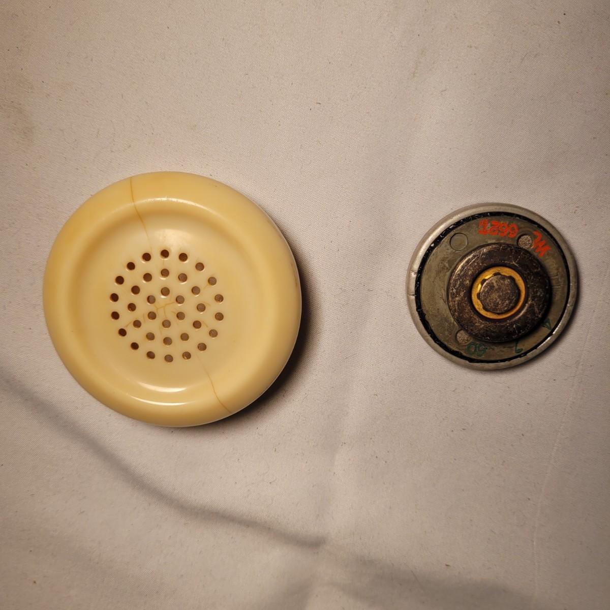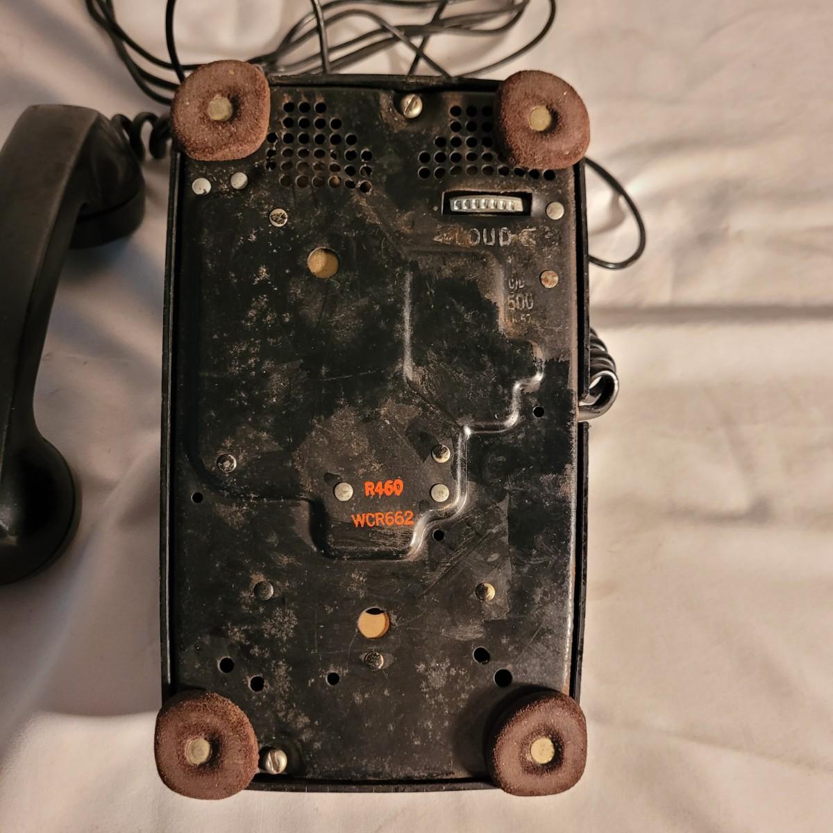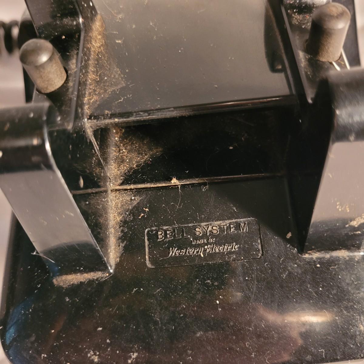 Set of two vintage rotary phones. Dials spin fine. Black phone is Western Electric brand. Can not confirm if the phones function when plugged in. Gold phone has ear piece with wiring and cap detached. Both phones have accumulation of dust, appear to be easily cleanable. For reference, gold phone measures approximately 5.5"L x8"D x6"H. Shipping available.
