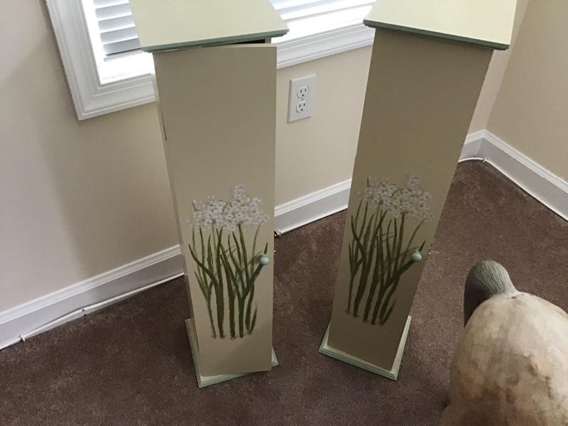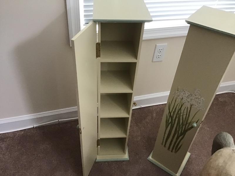 Set of wooden floral cabinets. Can be used for Knick knacks,CD’s, or collectibles. Great Condition. 31”H