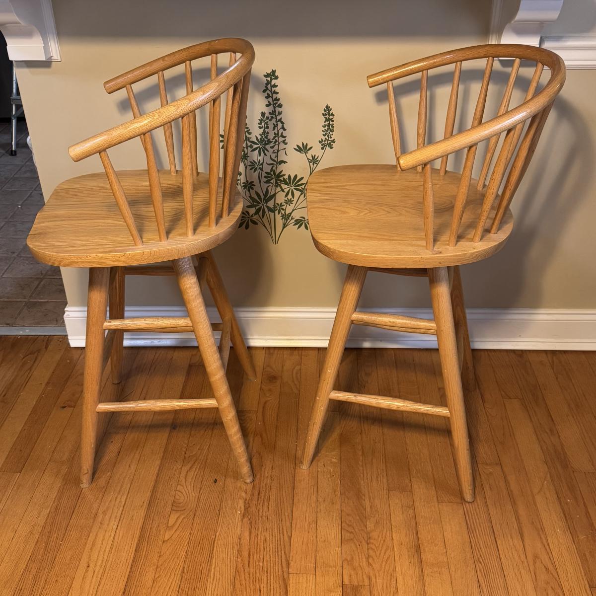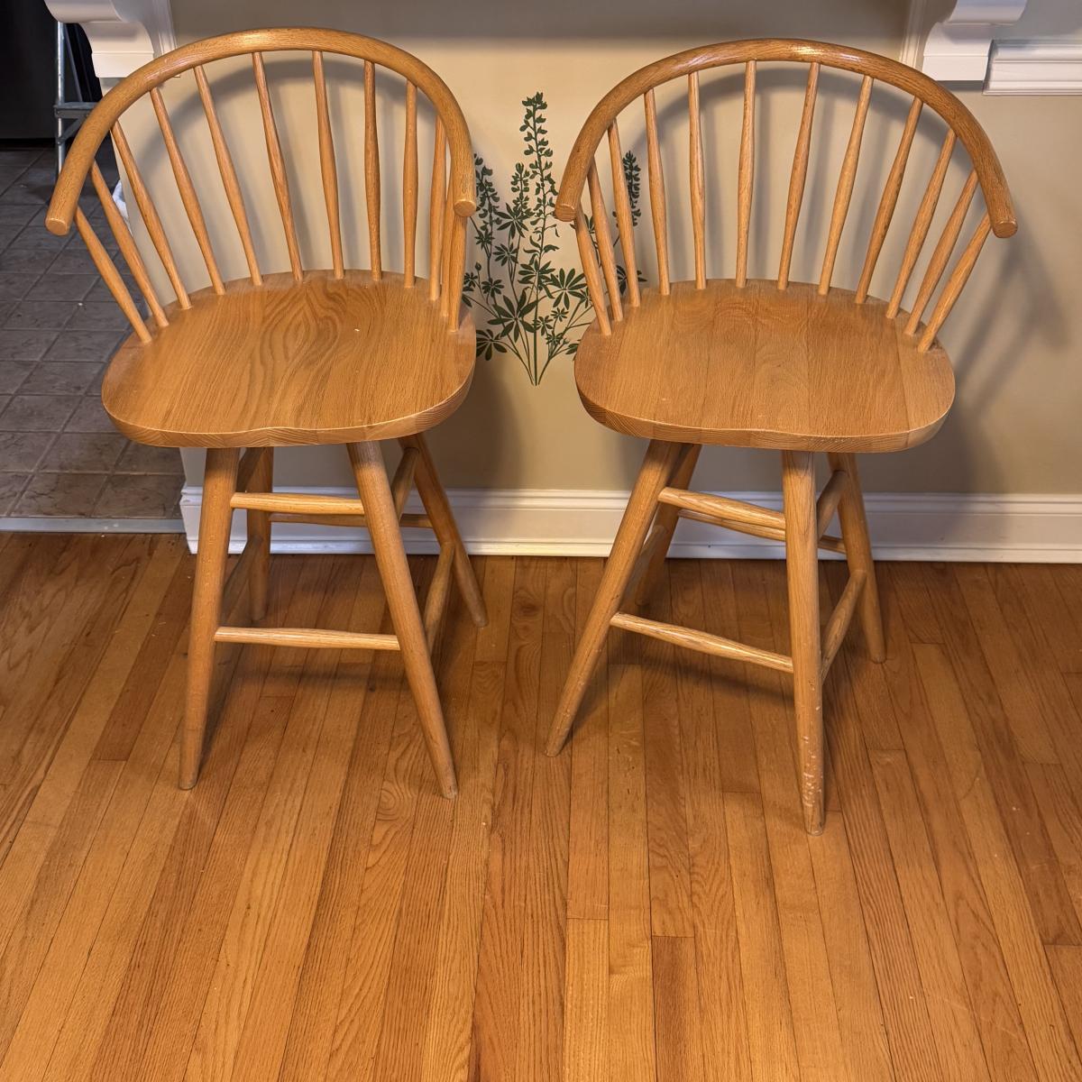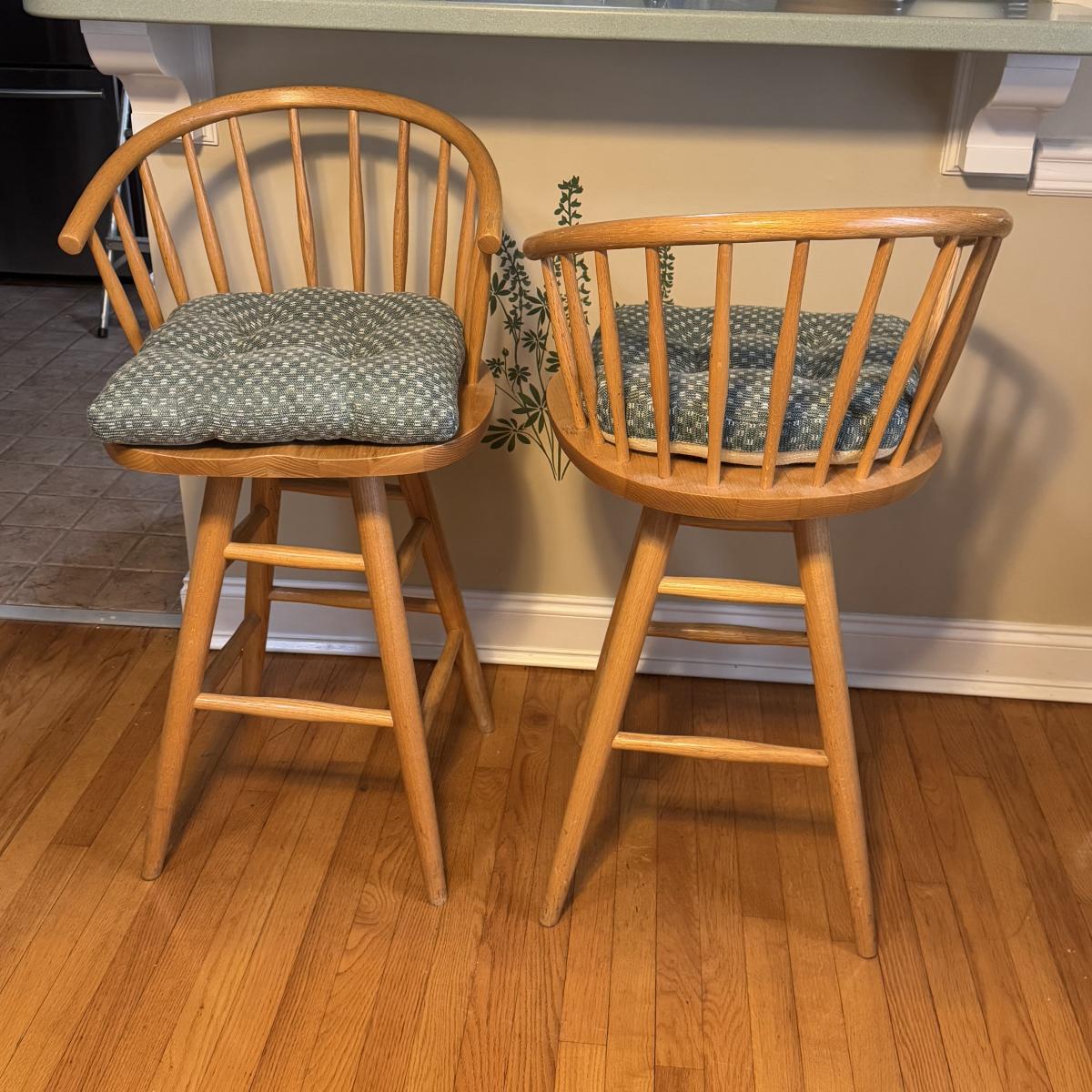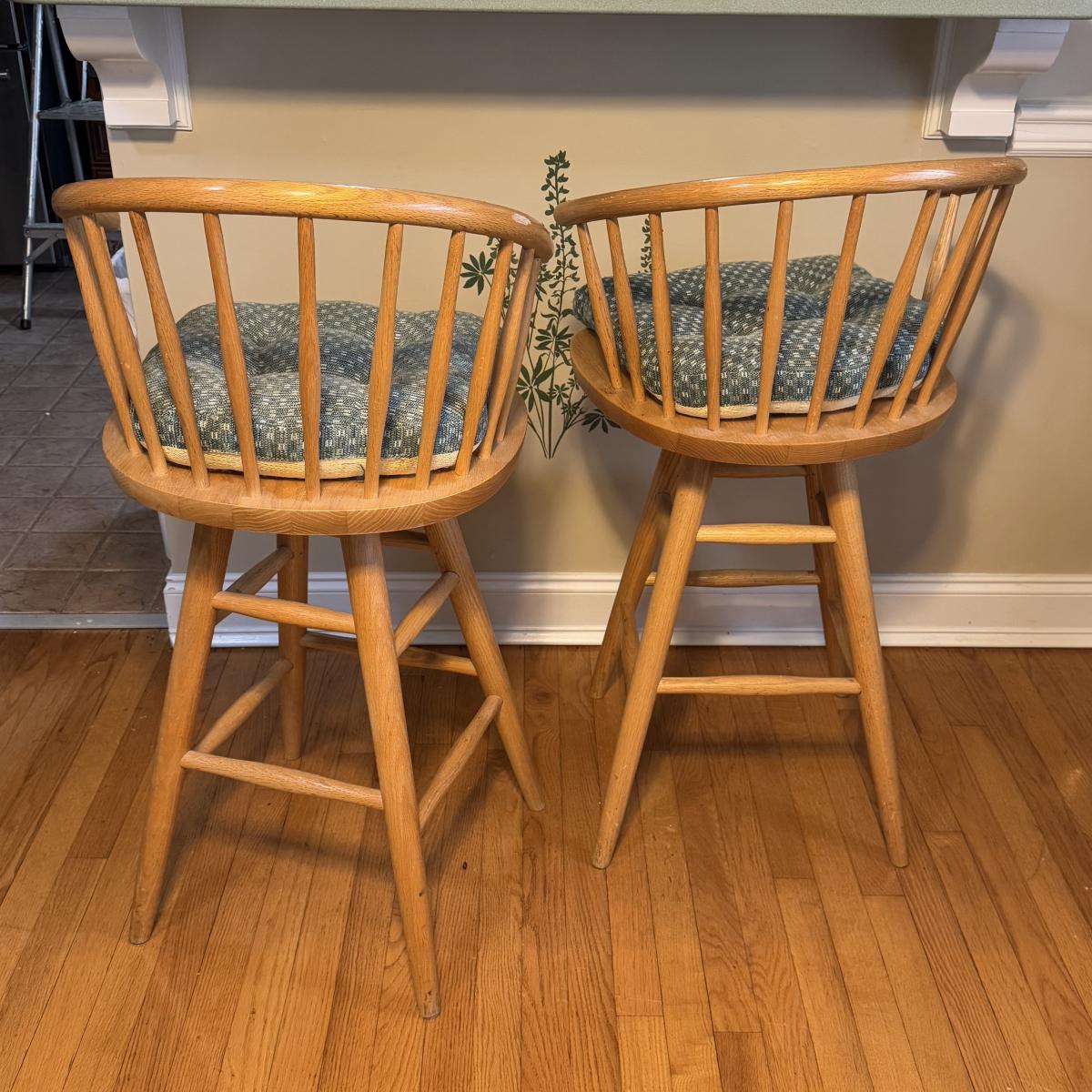 Lot includes two identical wooden swivel barstools with two matching, removable cushions. The barstools swivel from side to side. They individually measure 20” x 20” x 39”H - the seat height is 25”H. There are small signs of wear on each stool - see pictures included. Local pickup only.
