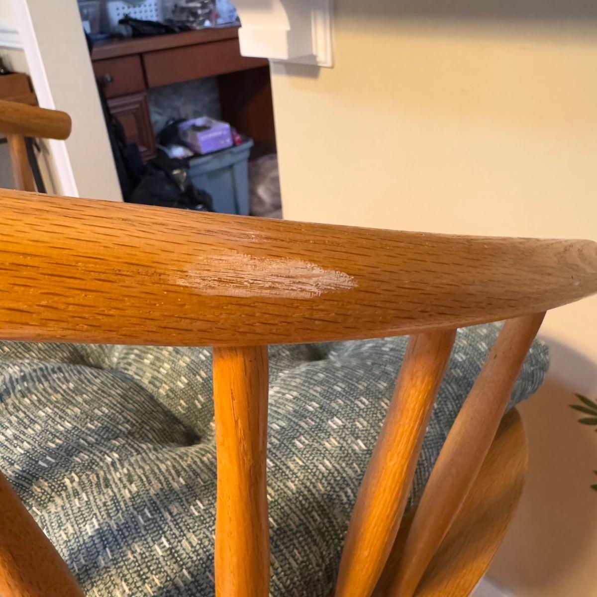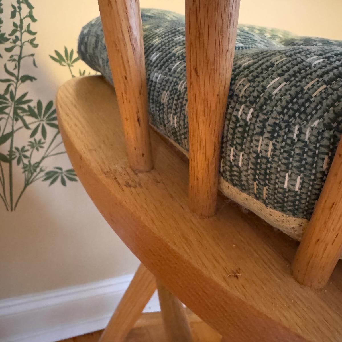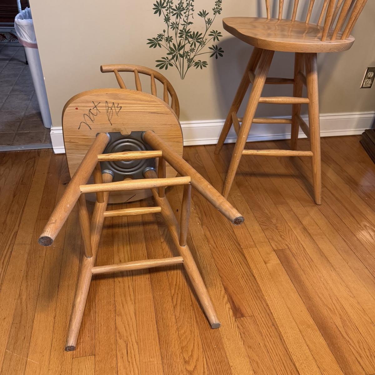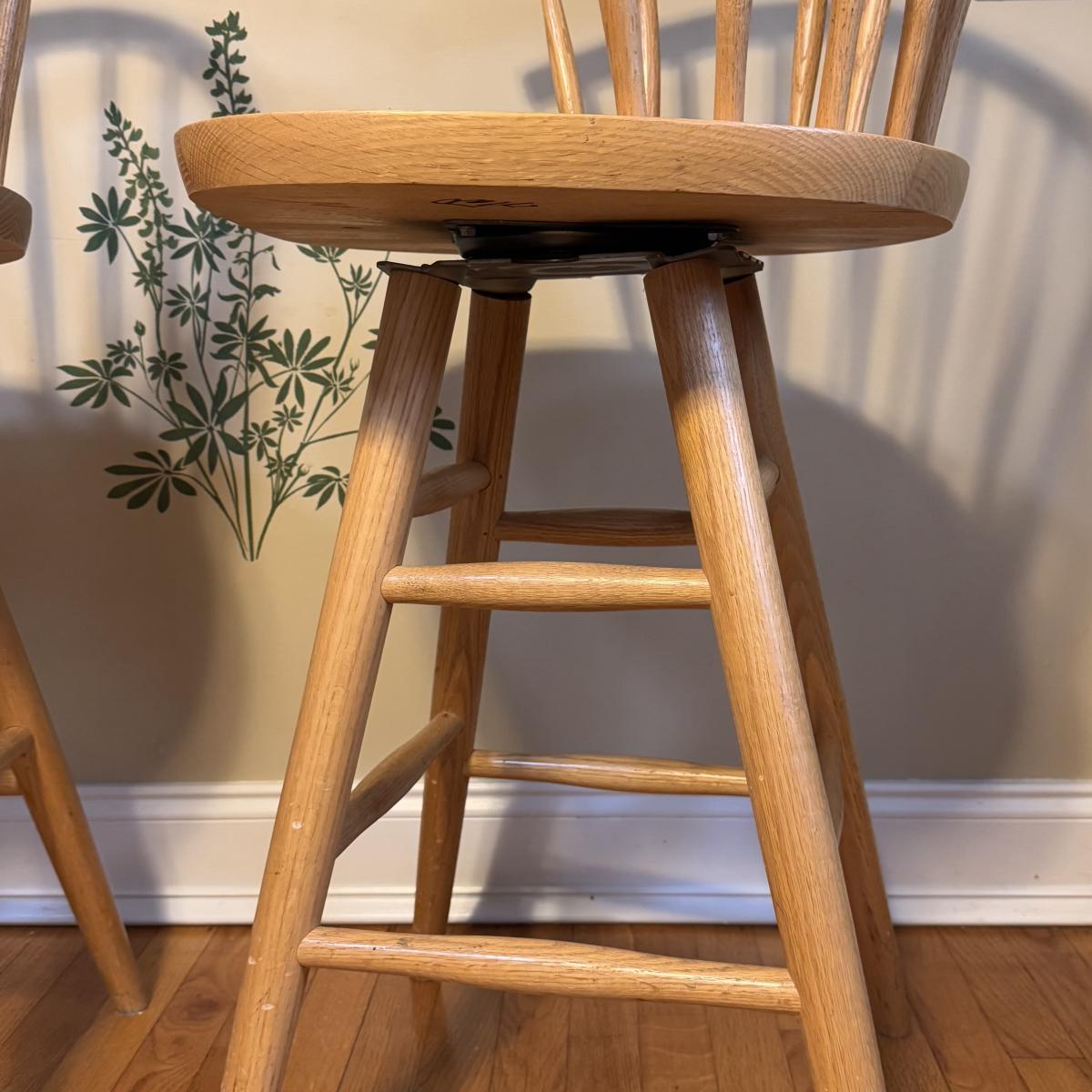 Lot includes two identical wooden swivel barstools with two matching, removable cushions. The barstools swivel from side to side. They individually measure 20” x 20” x 39”H - the seat height is 25”H. There are small signs of wear on each stool - see pictures included. Local pickup only.