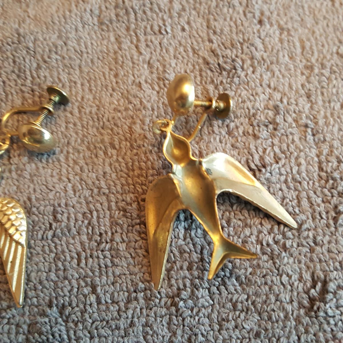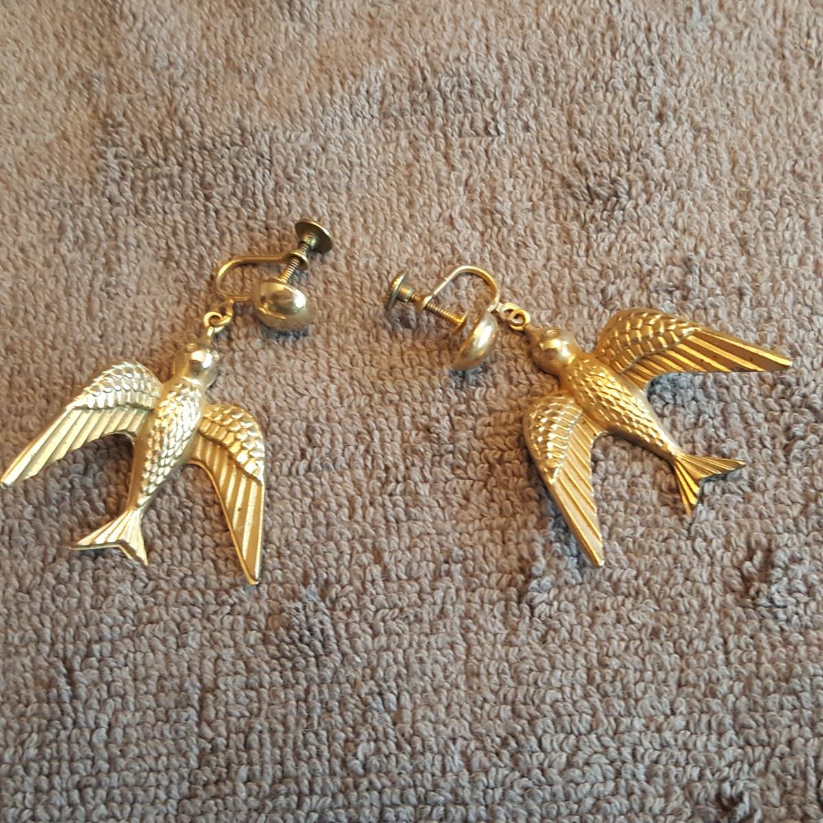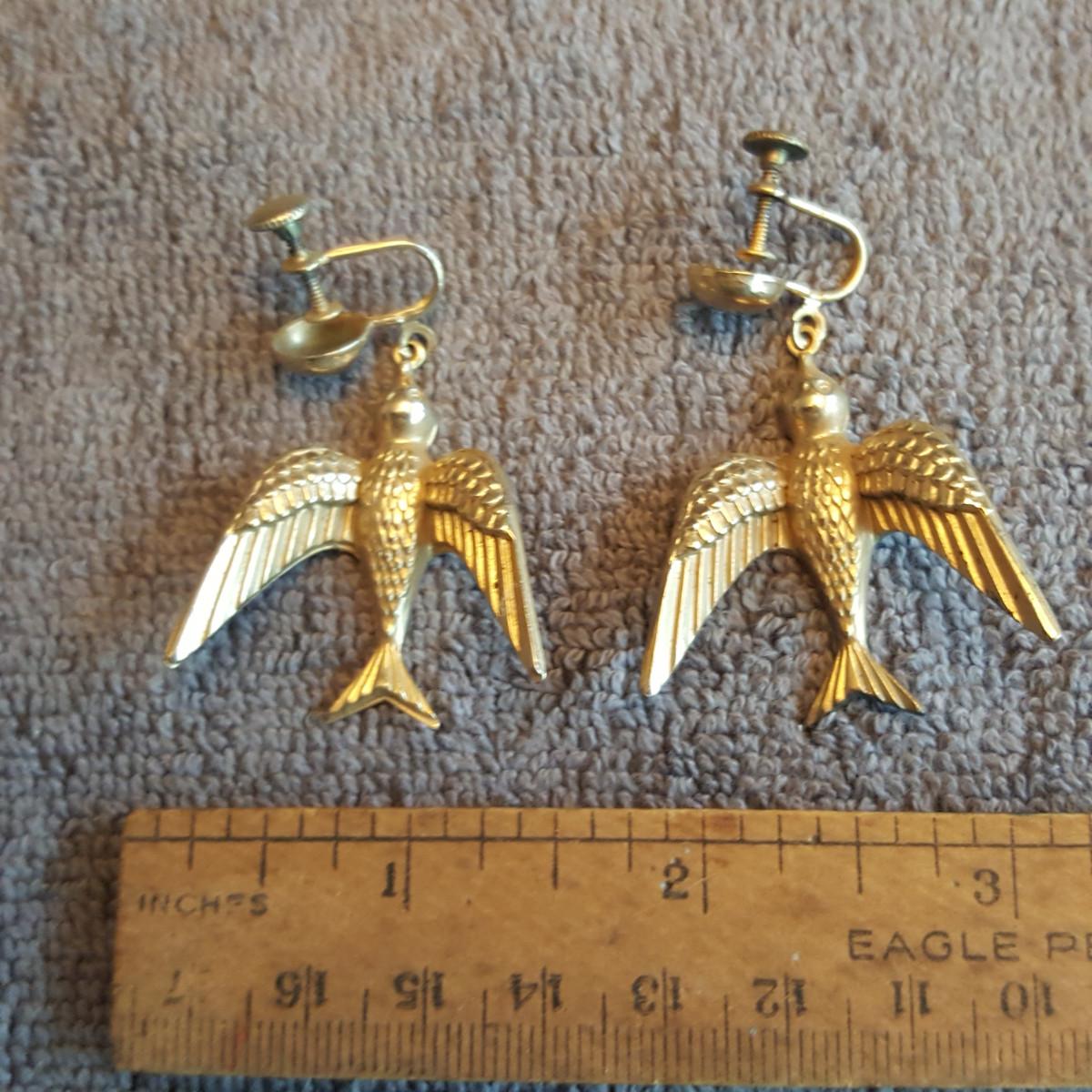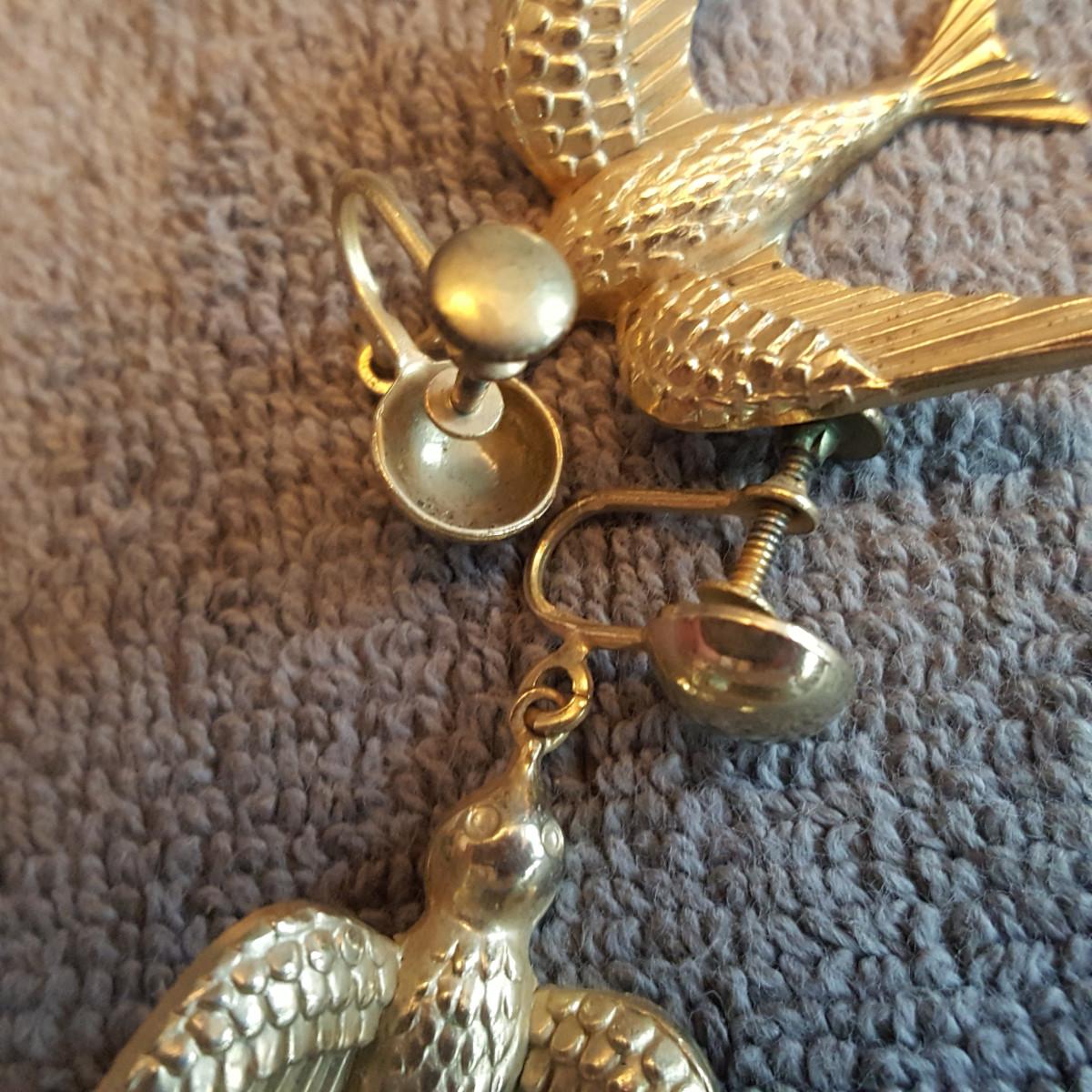 This auction lot is for a Set of Vintage Bird Earrings. These earrings are equipped with the screw-type clasps - which could be easily adapted for pierced. They are quite detailed, appear to be made from brass but are light for their size. They would be a fun wear. They show no makers mark.