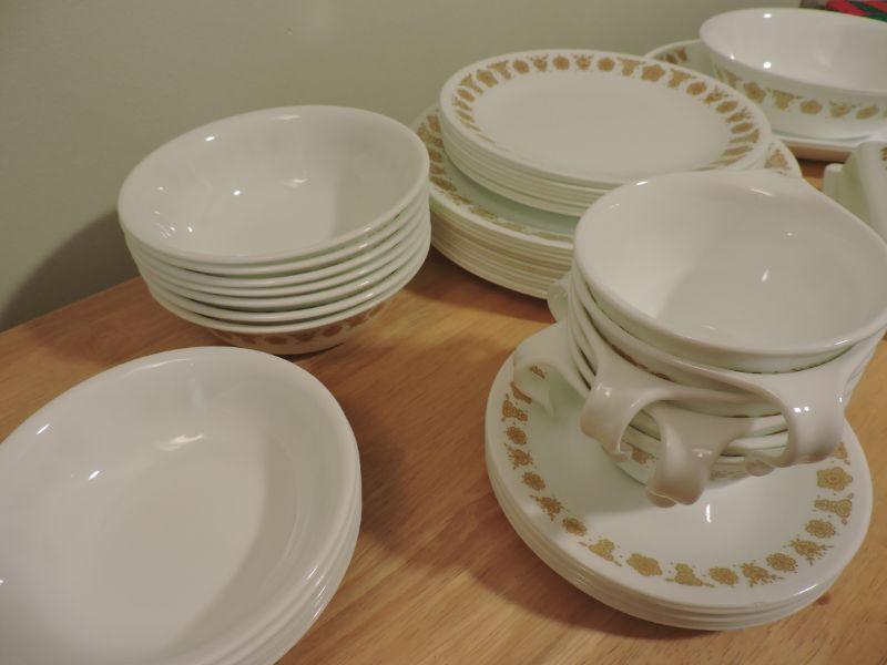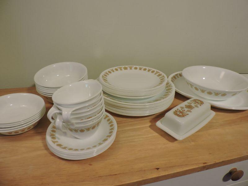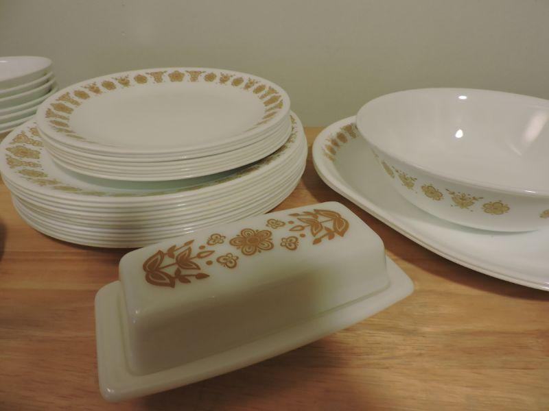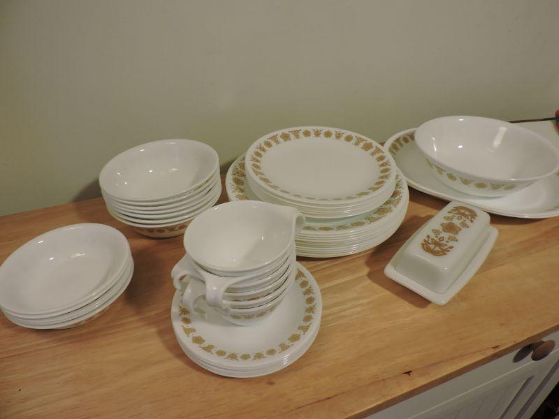 Set of Vintage Butterfly Gold Corelle Dishes. Includes dinner plates, salad plates, salad bowls, desert bowls, cups and saucers, covered butter dish, serving platter, and serving bowl. **Please read Terms and Conditions before placing a bid. Pick up is Thursday, August 15, 2019 from 4pm to 7pm or Sunday, August 18 from 11am-2pm in Mullica Hill. All sales are final. All sales are as is, where is. Please review all photos. Any props included in photos are not included in listing. All measurements are approximate.