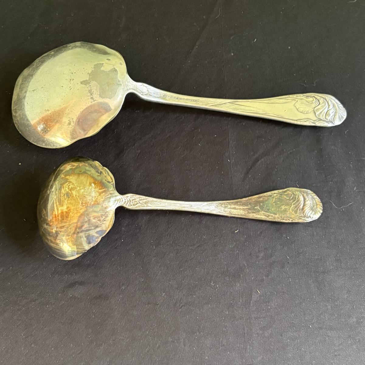 This set of vintage Community Silver flatware includes the following: berry serving spoon, ladle, four serving spoons, two soup spoons, sugar spoon, two butter knives, five teaspoons, six grapefruit spoon, 11 dinner forks, and 11 knives. This set is silver plated and the pattern is Flower De Luce. There is patina and signs of age, see pictures for reference. The lace measures at approximately 3"D x 8.5" and the serving spoons at 8".