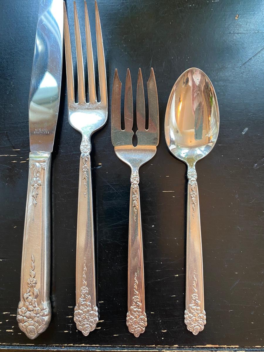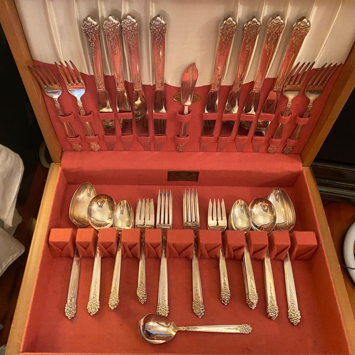 Set of vintage King Edward silver plate silverware, in tarnish-proof box. 52-pc set, service for 8. The box has scratches, otherwise all in very good condition