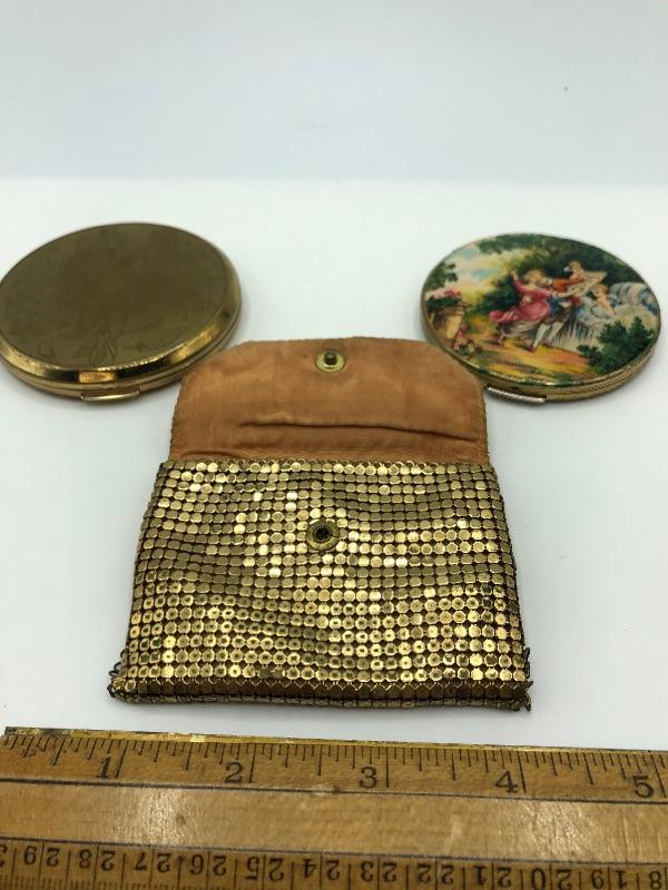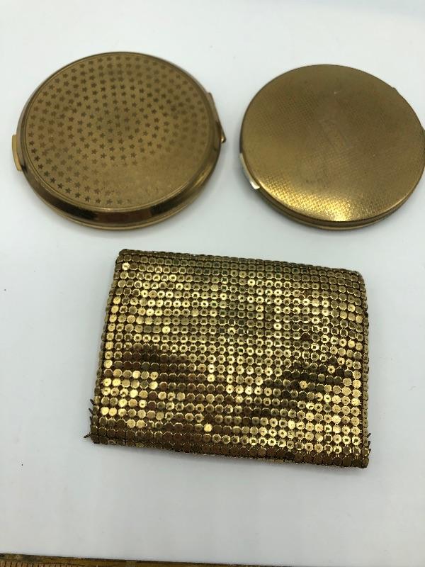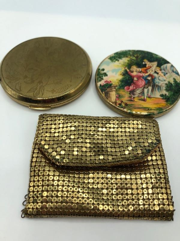 Set of 3 vintage compacts. One is a pill holder. The other 2 are makeup compacts. Gold tone. Gold sequin compact bag included.