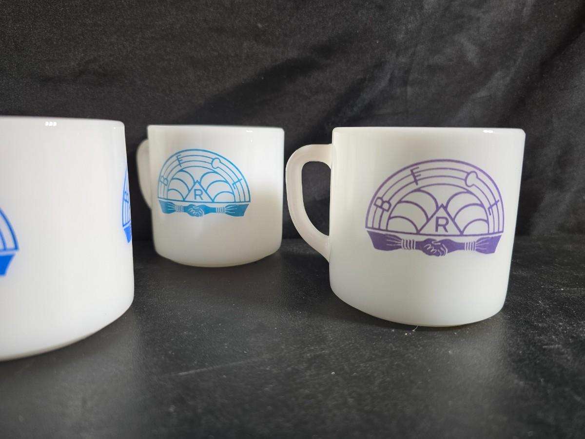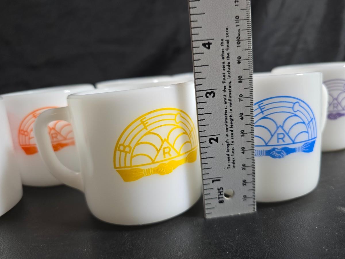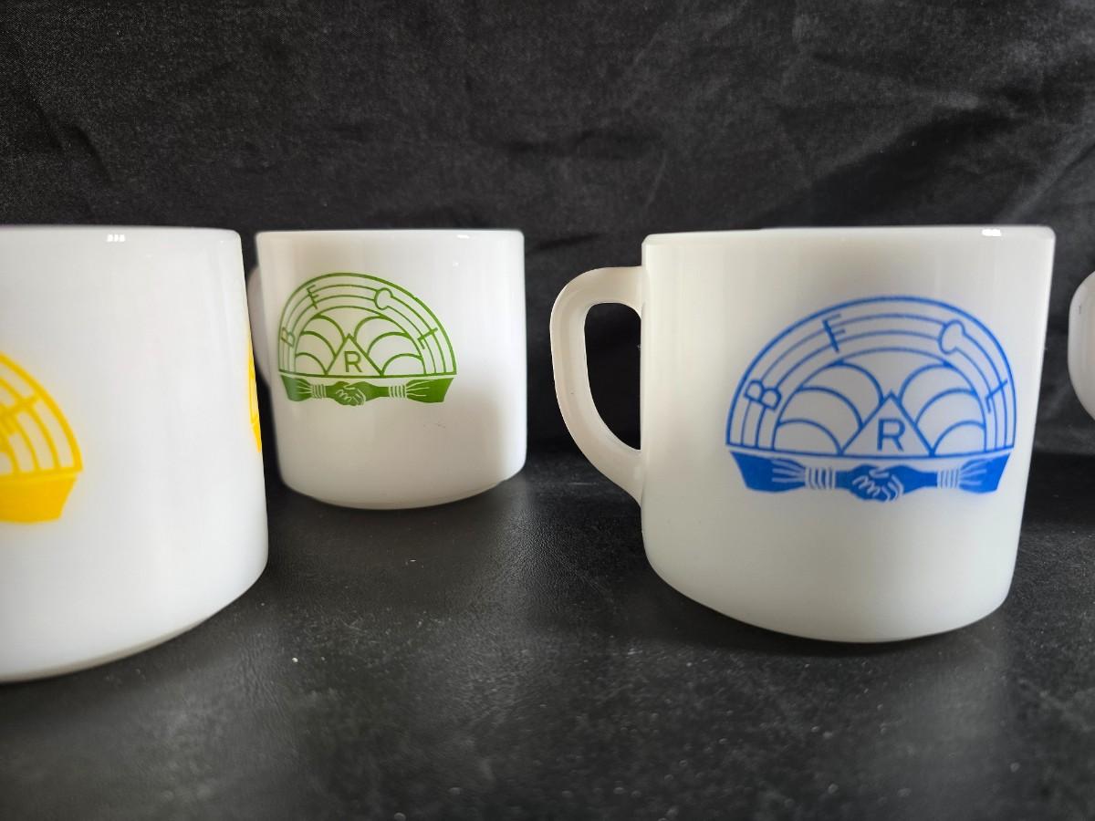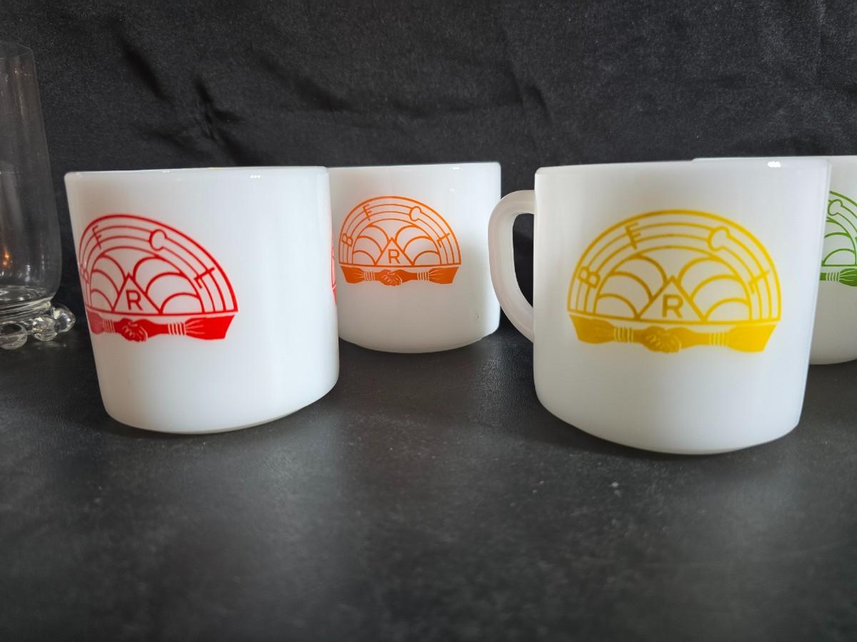 Set of Vintage milk glass mugs featuring the logo for the International Order of the Rainbow for Girls (IORG), with two mcdonalds mugs