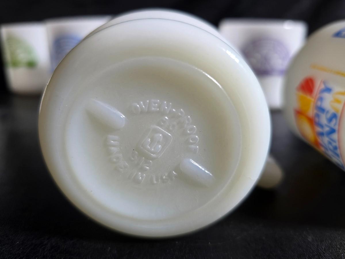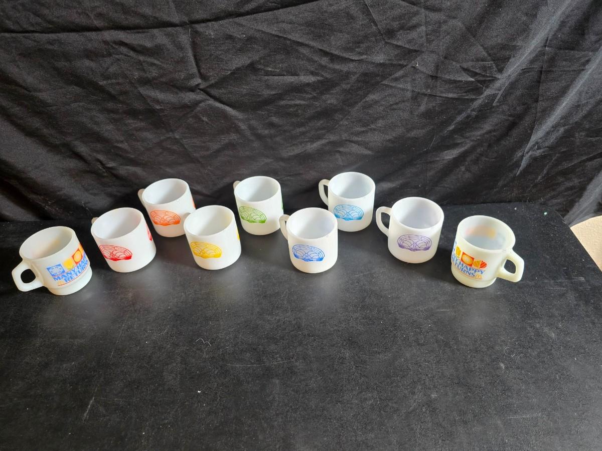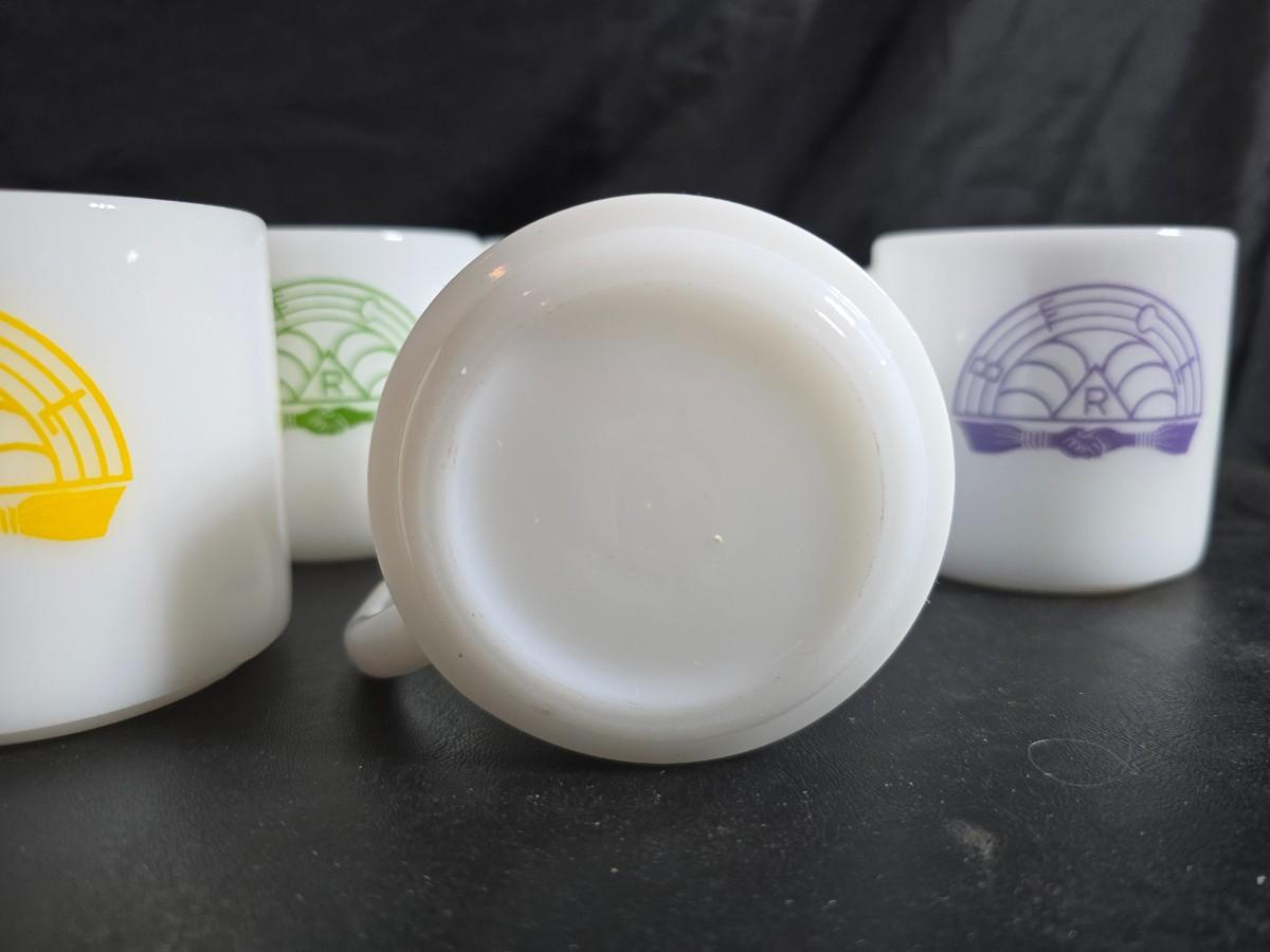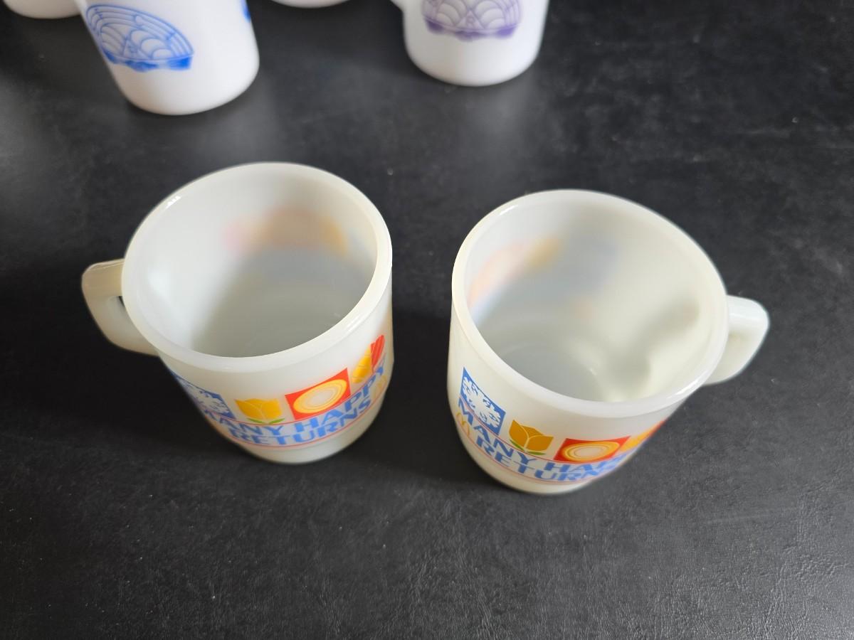 Set of Vintage milk glass mugs featuring the logo for the International Order of the Rainbow for Girls (IORG), with two mcdonalds mugs