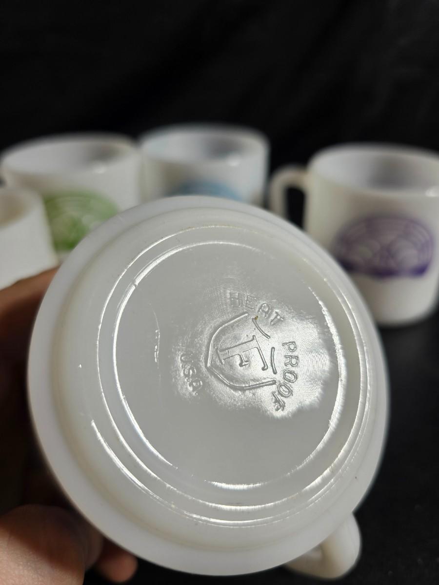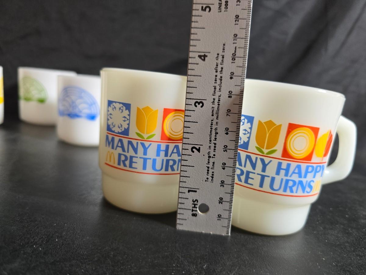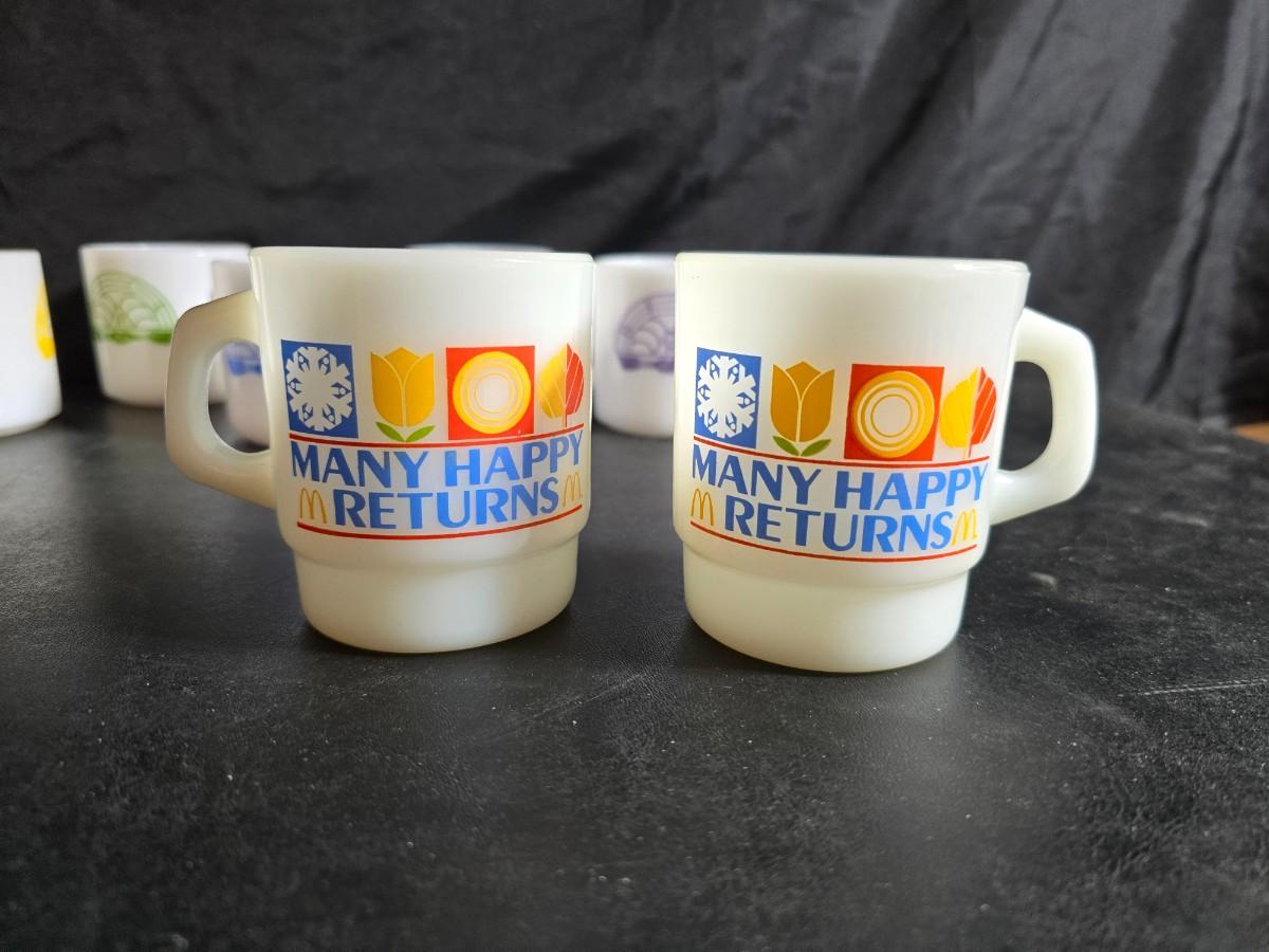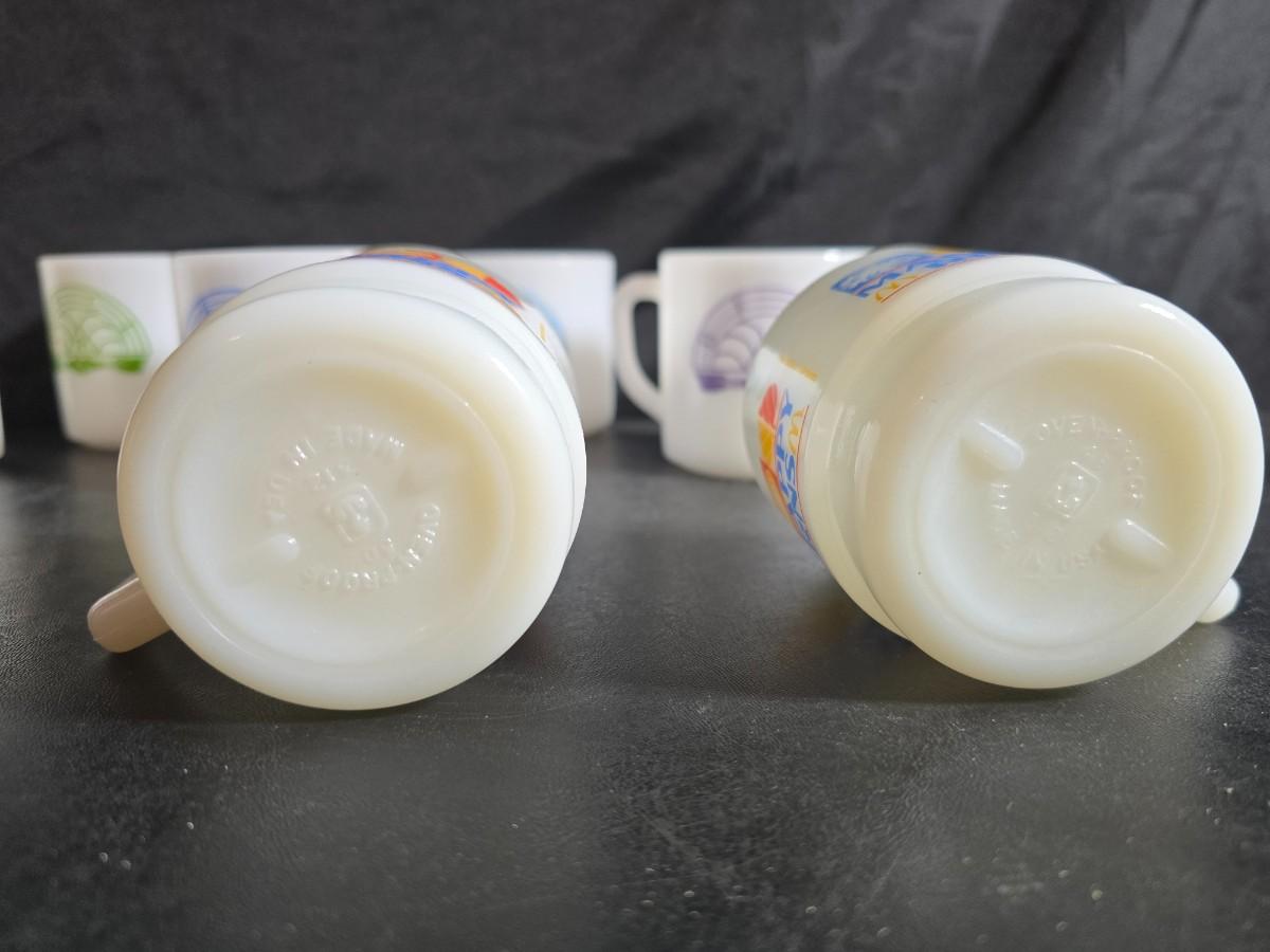 Set of Vintage milk glass mugs featuring the logo for the International Order of the Rainbow for Girls (IORG), with two mcdonalds mugs
