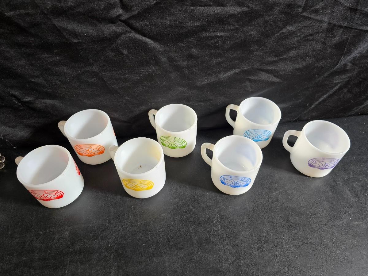 7 rainbow colored Vintage milk glass mugs featuring the logo for the International Order of the Rainbow for Girls (IORG), a Masonic youth organization are made by Federal Glass Company.