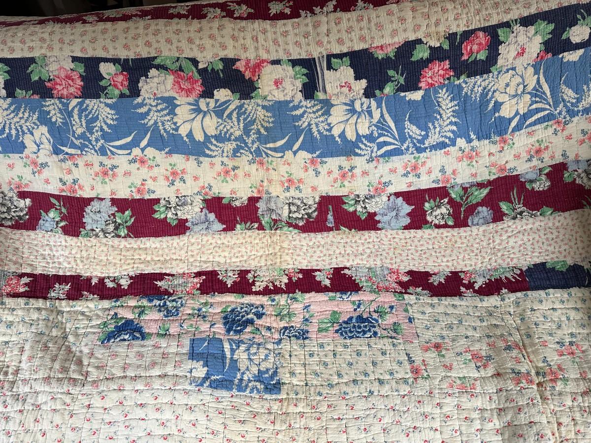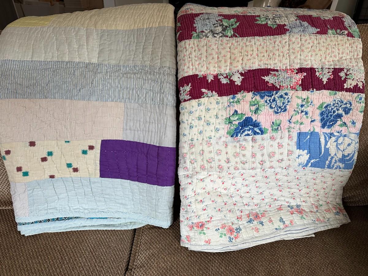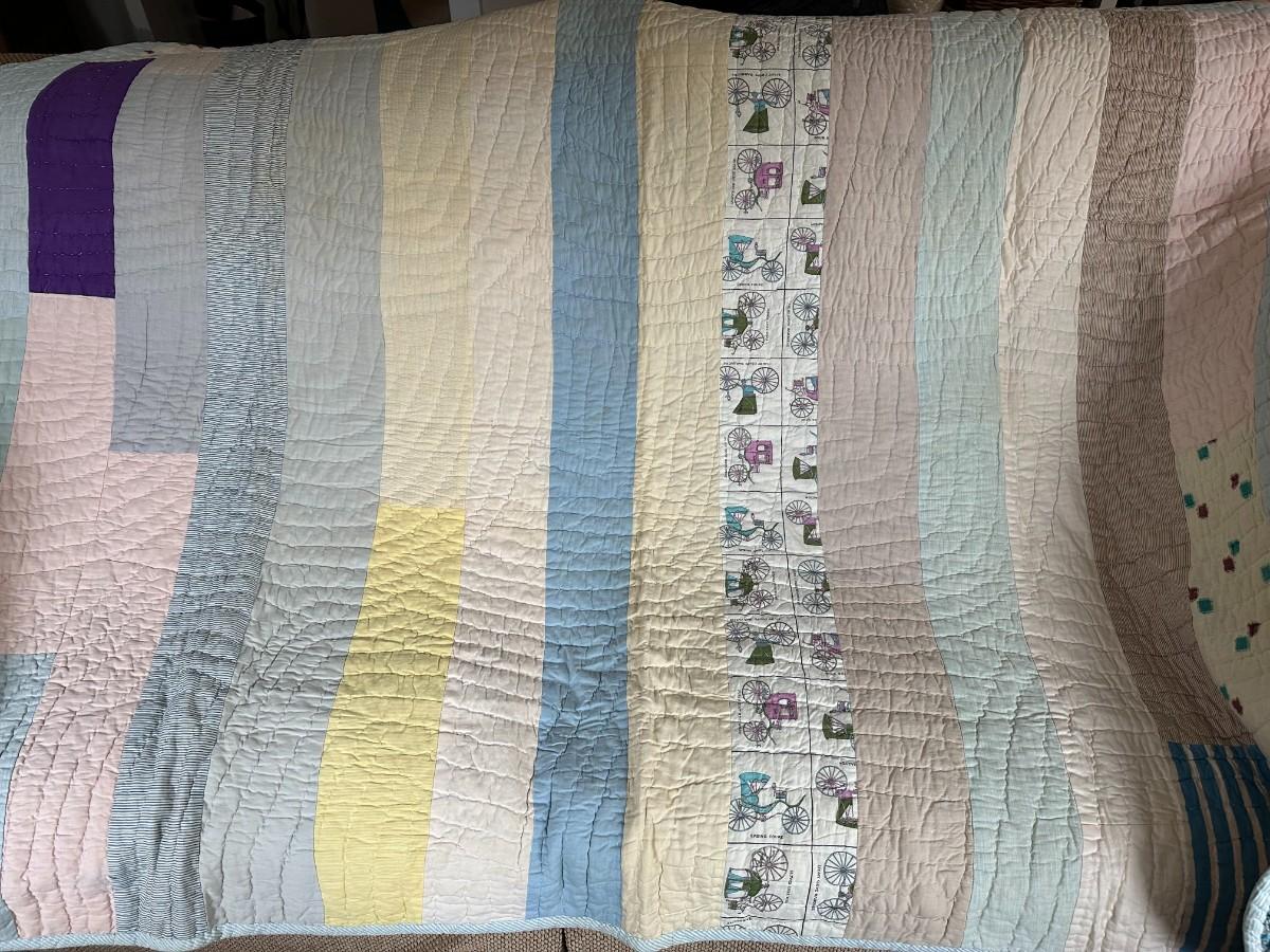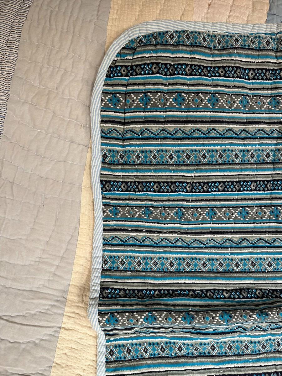 Multi Color Quilt with Stripe backing measures approx. 72" x 64". Pastel Quilt w/Blue & Black backing measure approx 72" x 68"