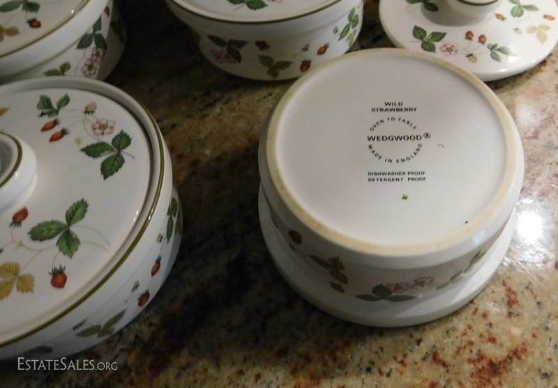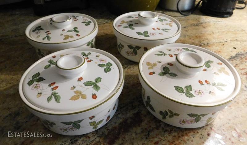 Set of 4 Wild Strawberry pattern Wedgewood oven to table cookware. 5" with lid. Made in England. Good condition.